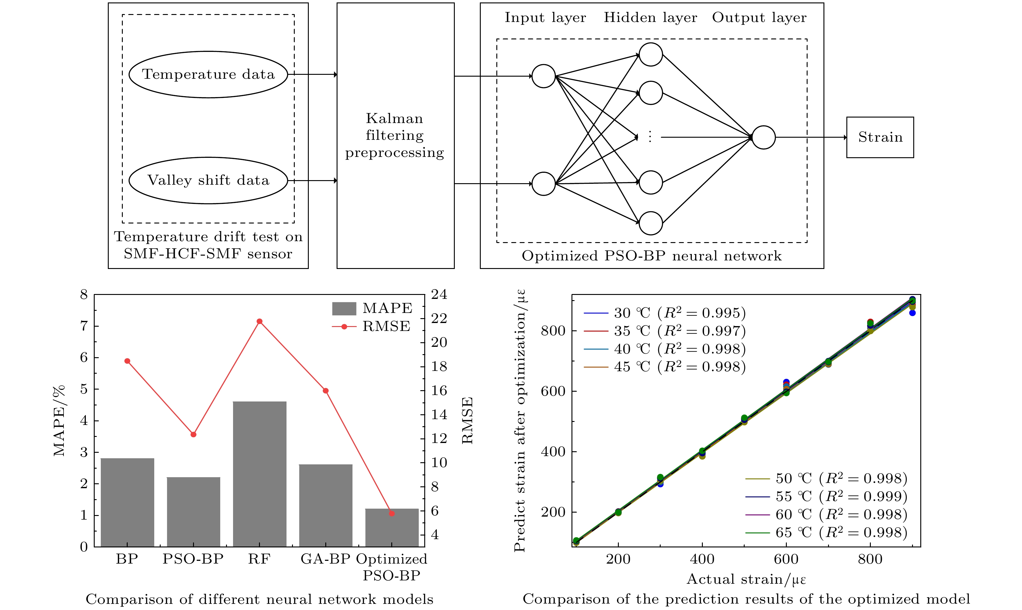 Ambient temperature fluctuations often induce measurement errors in fiber-optic Fabry-Perot strain sensors. To effectively compensate for the influence of temperature on measurement accuracy, this study proposes an optimized particle swarm optimization-back propagation (PSO-BP) neural network algorithm. The combined predictive model is applied to the monitoring data of a Fabry-Perot strain sensor based on a single-mode fiber-hollow-core fiber-single-mode fiber (SMF-HCF-SMF) structure. By preprocessing the data collected from the sensor, the temperature values and spectral valley shift data obtained from the fiber-optic Fabry-Perot strain sensor are directly used as input features to establish a temperature-compensated neural network model. Based on the traditional PSO-BP neural network algorithm, an optimization strategy incorporating adaptive adjustment of inertia weights and learning factors is employed to enhance global search capability and local convergence accuracy, thereby enabling effective compensation for temperature-induced effects. Experimental results demonstrate that in the entire temperature measurement range of the sensor, the optimized PSO-BP neural network achieves a mean absolute percentage error (MAPE) of about 1.2% and a root mean square error (RMSE) of about 5.9, significantly outperforming other methods. Comparative analysis with different model architectures reveals that compared with the BP, PSO-BP, RF, and GA-BP models, the optimized PSO-BP model improves MAPE by 57.14%, 45.45%, 73.91%, and 53.85%, respectively, while reducing RMSE by 68.11%, 52.42%, 72.94%, and 63.13%. Moreover, the coefficient of determination (R2) consistently exceeds 0.995 under various temperature conditions, indicating that the model effectively compensates for temperature-induced errors in the sensor under different thermal and strain conditions, and has excellent stability and adaptability. Therefore, the temperature compensation method proposed in this study not only offers a novel approach for improving the measurement accuracy of fiber-optic Fabry-Perot strain sensors, but also provides a valuable reference for studying the temperature compensation in related sensor technologies. Future research may further explore the applicability of this method to other types of sensors, thereby promoting the sustaining development of intelligent sensing technologies.