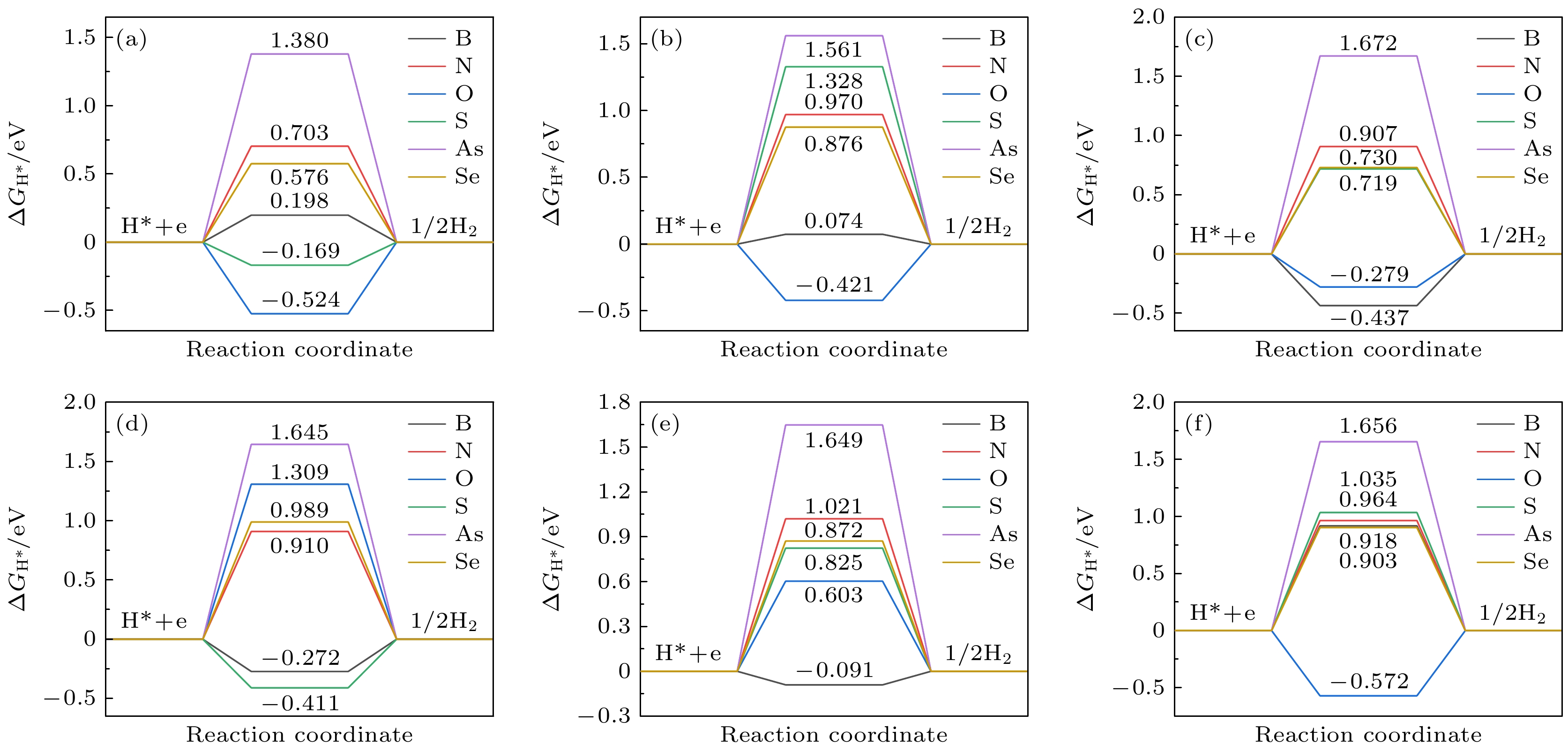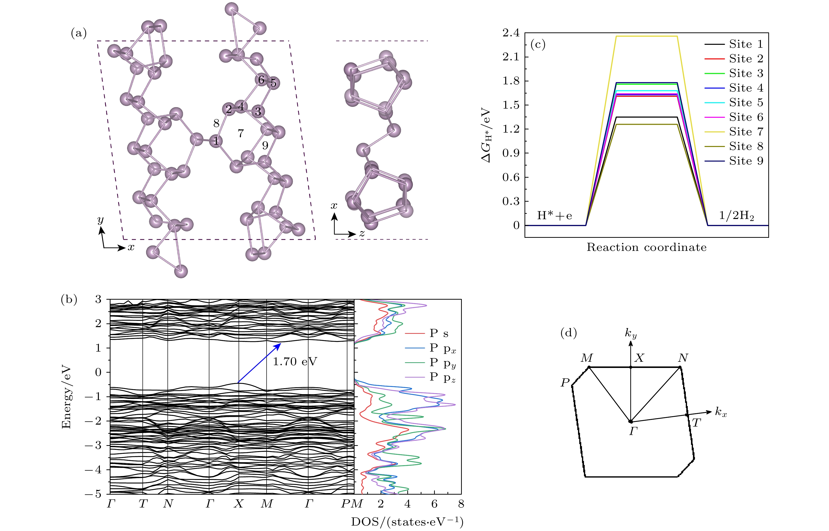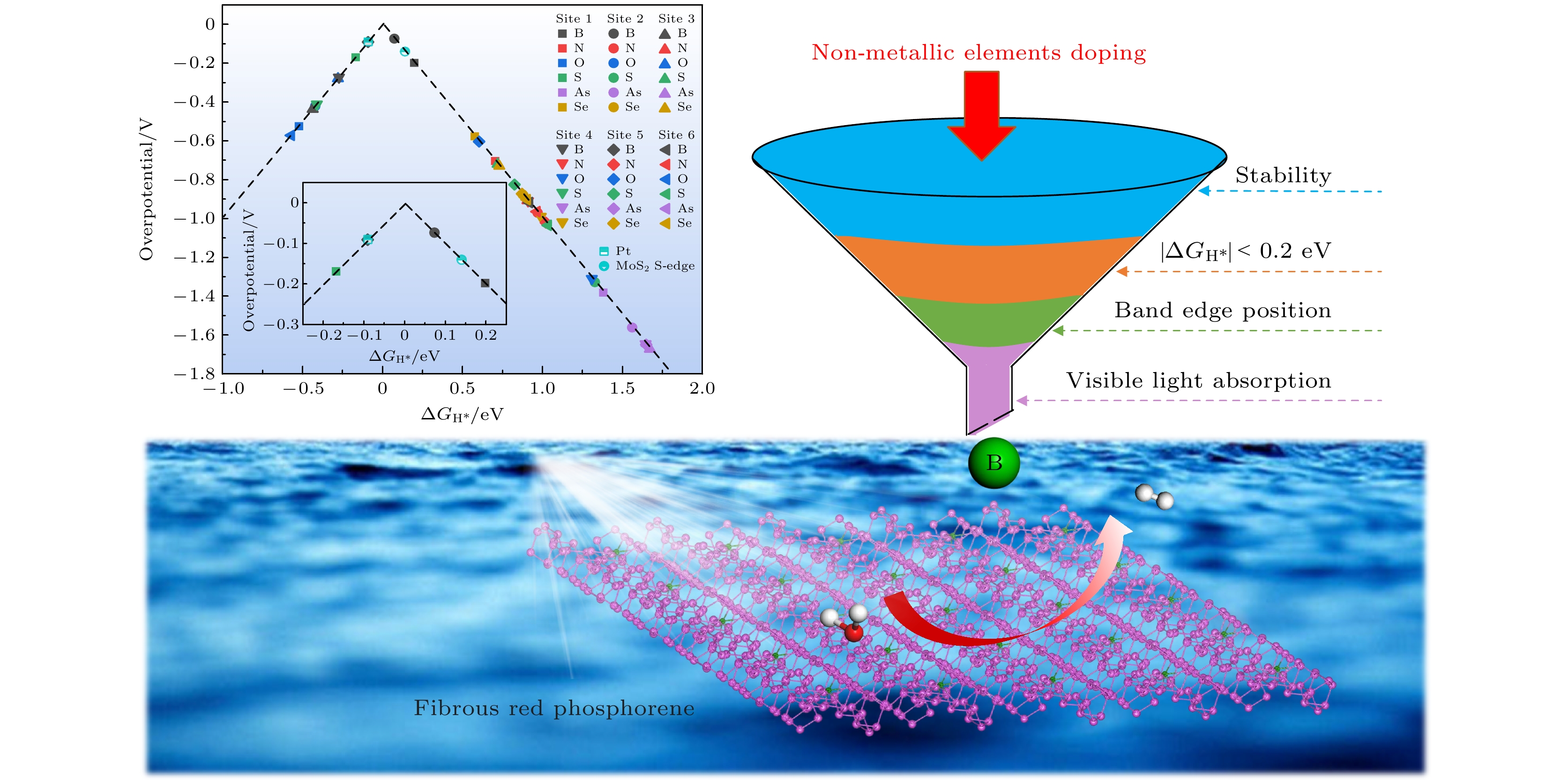 Under the dual challenges of the energy crisis and environmental pollution, the technology of photocatalytic water splitting for hydrogen production has become a research hotspot for clean energy due to its green and sustainable characteristics. Fibrous red phosphorus (FRP), as a novel quasi-one-dimensional semiconductor material, exhibits remarkable photocatalytic hydrogen evolution potential because of its moderate bandgap, high carrier mobility, and excellent air stability. Based on the first-principles calculations, the regulatory mechanisms of electronic structure and catalytic performance of single-layer FRP doped by a series of non-metallic elements X (X = B, C, N, O, Si, S, As, and Se) are systematically investigated in this work. The results show that the element X can effectively enhance the hydrogen evolution reaction (HER) activity of single-layer FRP. Among those doped systems, four specific systems (S-doped at site 1, B-doped at sites 1/2/5) exhibit excellent catalytic activity for HER. Especially, the B-doped system at site 2 has the most ideal free energy of hydrogen adsorption (ΔGH*), and its overpotential (η = –0.074 V) is comparable to that of the noble metal Pt catalyst. The analysis of the electronic structure indicates that the enhancement of the HER catalytic activity is closely related to the downward shift of the X pz-band center at the adsorption site. There is a direct proportional relationship between ΔGH* and the X pz-band center (R2 ≥ 0.78), indicating that the X pz-band center can serve as a key electronic descriptor for regulating the HER activity. Further verification by calculations using the HSE06 hybrid functional shows that the band edge positions of the B-doped system can span both sides of the redox potential of water, and the light absorption range covers the visible light region, indicating the thermodynamic feasibility and spectral response advantages of this system in the application of photocatalytic overall water splitting. This study provides important theoretical guidance for designing efficient FRP-based photocatalytic materials based on the non-metallic doping strategy.