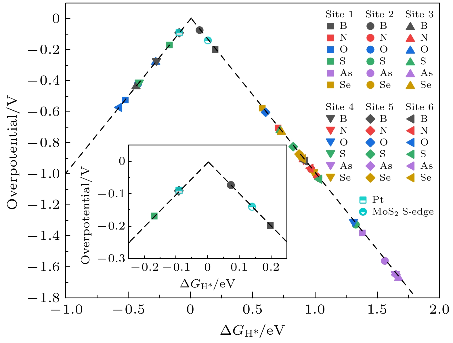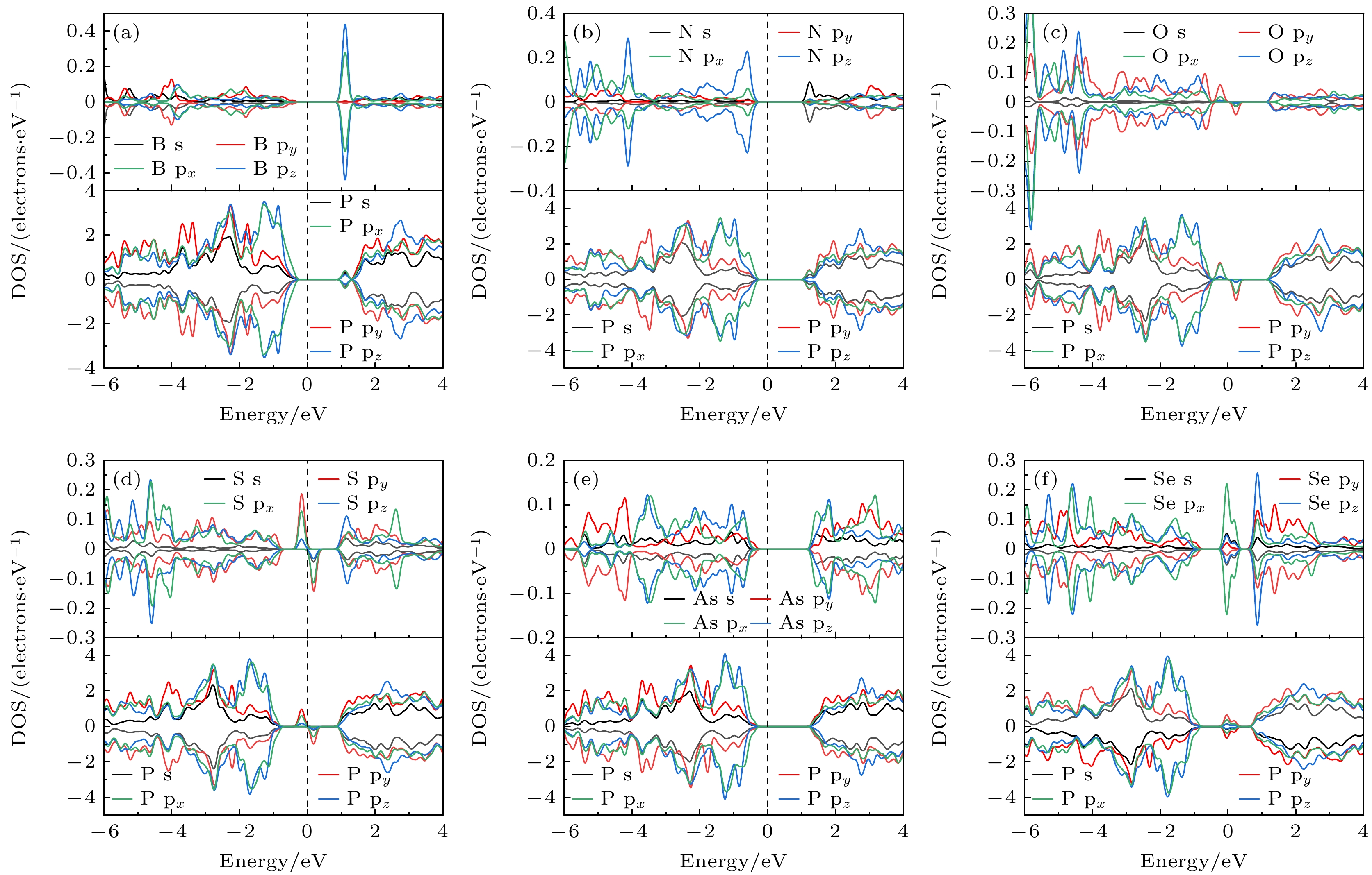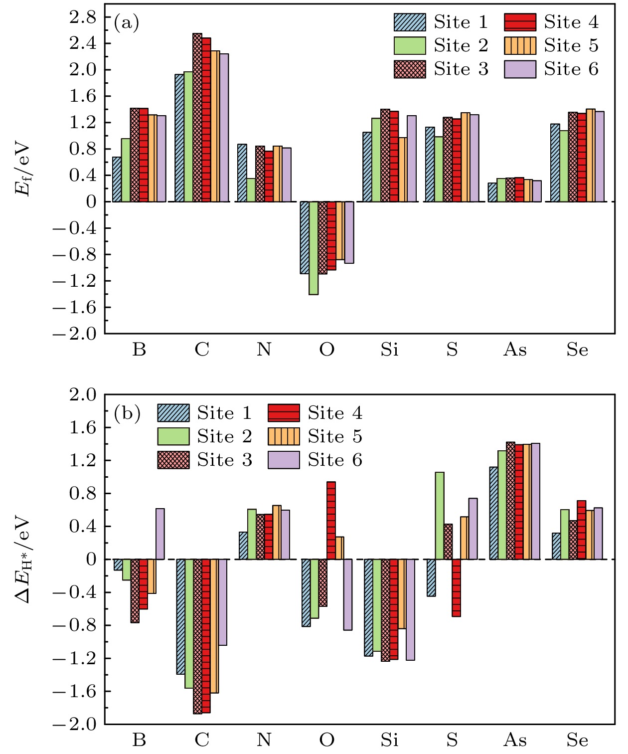 Under the dual challenges of the energy crisis and environmental pollution, the technology of photocatalytic water splitting for hydrogen production has become a research hotspot for clean energy due to its green and sustainable characteristics. Fibrous red phosphorus (FRP), as a novel quasi-one-dimensional semiconductor material, exhibits remarkable photocatalytic hydrogen evolution potential because of its moderate bandgap, high carrier mobility, and excellent air stability. Based on the first-principles calculations, the regulatory mechanisms of electronic structure and catalytic performance of single-layer FRP doped by a series of non-metallic elements X (X = B, C, N, O, Si, S, As, and Se) are systematically investigated in this work. The results show that the element X can effectively enhance the hydrogen evolution reaction (HER) activity of single-layer FRP. Among those doped systems, four specific systems (S-doped at site 1, B-doped at sites 1/2/5) exhibit excellent catalytic activity for HER. Especially, the B-doped system at site 2 has the most ideal free energy of hydrogen adsorption (ΔGH*), and its overpotential (η = –0.074 V) is comparable to that of the noble metal Pt catalyst. The analysis of the electronic structure indicates that the enhancement of the HER catalytic activity is closely related to the downward shift of the X pz-band center at the adsorption site. There is a direct proportional relationship between ΔGH* and the X pz-band center (R2 ≥ 0.78), indicating that the X pz-band center can serve as a key electronic descriptor for regulating the HER activity. Further verification by calculations using the HSE06 hybrid functional shows that the band edge positions of the B-doped system can span both sides of the redox potential of water, and the light absorption range covers the visible light region, indicating the thermodynamic feasibility and spectral response advantages of this system in the application of photocatalytic overall water splitting. This study provides important theoretical guidance for designing efficient FRP-based photocatalytic materials based on the non-metallic doping strategy.