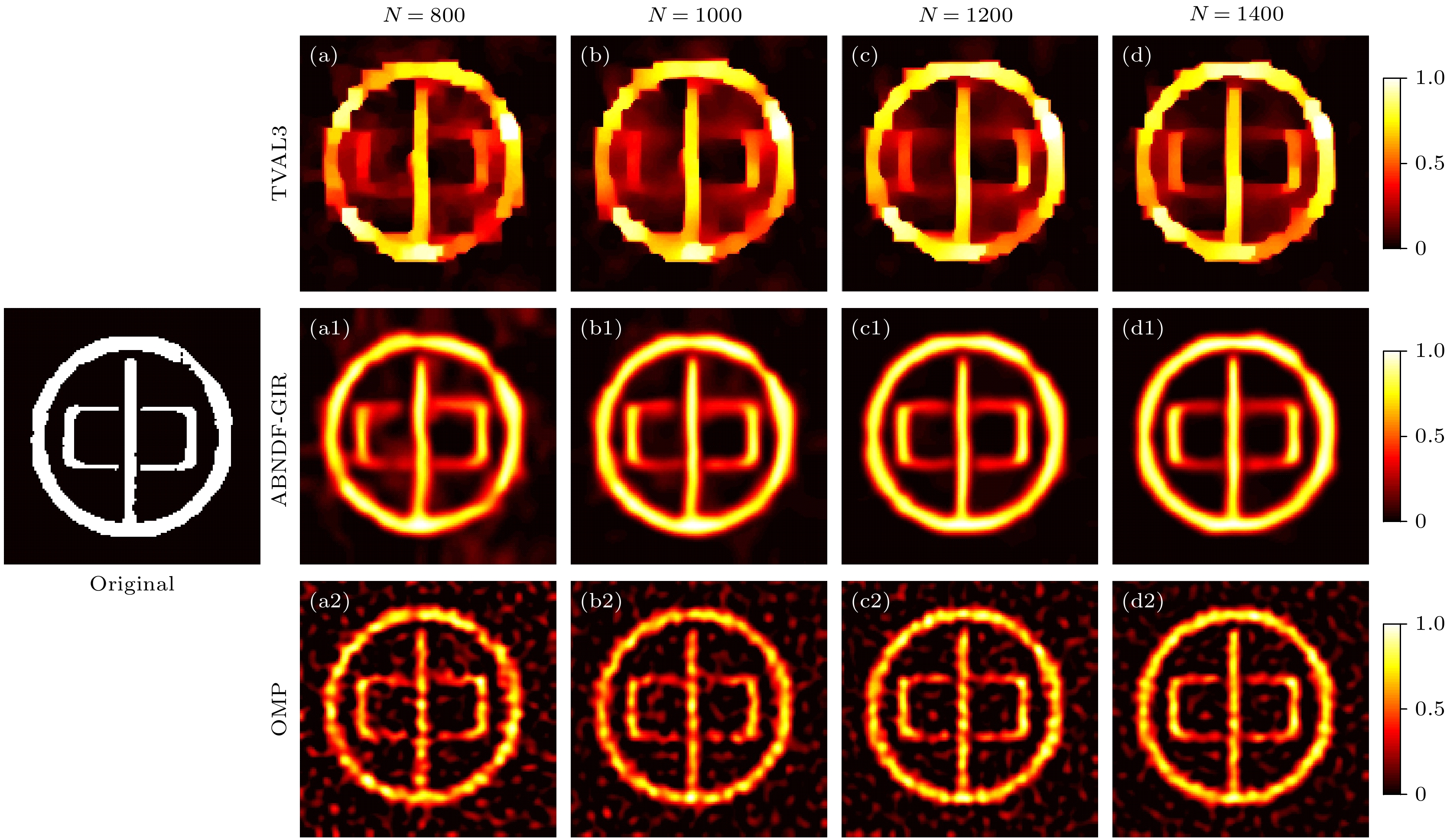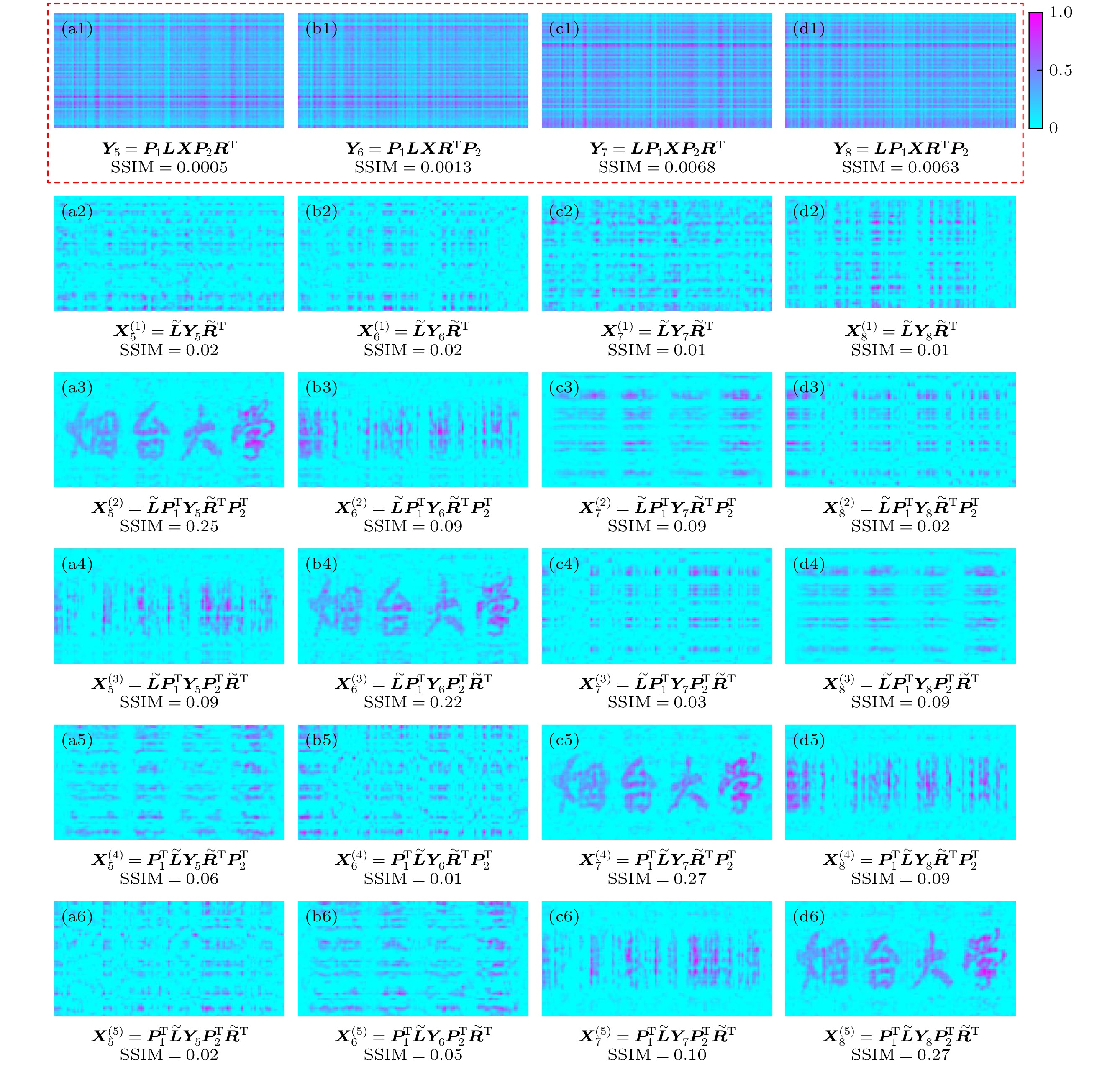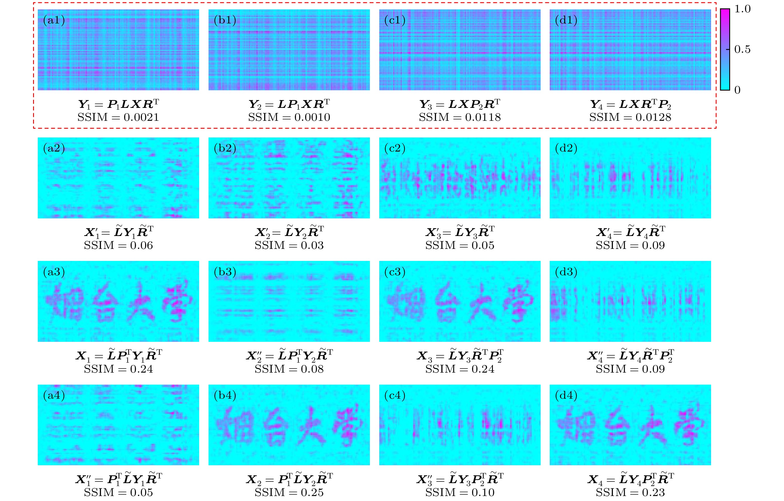 Ghost imaging is closely related to image encryption, since the random speckle patterns are often utilized. In the two-dimensional (2D) case, computational ghost imaging can be realized through \begin{document}$ \boldsymbol{L}\boldsymbol{X}{\boldsymbol{R}}^{\mathrm{T}}=\boldsymbol{Y} $\end{document} , where \begin{document}$ \boldsymbol{X} $\end{document} is a 2D object, \begin{document}$ \boldsymbol{Y} $\end{document} is the bucket detection signals reshaped into a 2D form, and \begin{document}$ \boldsymbol{L} $\end{document} and \begin{document}$ \boldsymbol{R} $\end{document} are two random matrices. In this work, a scenario of flexible image encryption in ghost imaging in the 2D case is proposed. The image is encrypted into the bucket detection signals by arbitrarily arranging the two random matrices (\begin{document}$ \boldsymbol{L} $\end{document} and \begin{document}$ \boldsymbol{R} $\end{document} ) and other two permutation matrices (\begin{document}$ {\boldsymbol{P}}_{1} $\end{document} and \begin{document}$ {\boldsymbol{P}}_{2} $\end{document} ). The permutation matrices are used to disrupt the distribution of the bucket signals. Considering that the specific size of the image may not be square but rectangle, eight ways of image encryption are investigated in this work. Four of them use only one permutation matrix (\begin{document}$ {\boldsymbol{P}}_{1} $\end{document} or \begin{document}$ {\boldsymbol{P}}_{2} $\end{document} ), and they are \begin{document}$ {\boldsymbol{P}}_{1}\boldsymbol{L}\boldsymbol{X}{\boldsymbol{R}}^{\mathrm{T}}={\boldsymbol{Y}}_{1} $\end{document} , \begin{document}$ \boldsymbol{L}{\boldsymbol{P}}_{1}\boldsymbol{X}{\boldsymbol{R}}^{\mathrm{T}}={\boldsymbol{Y}}_{2} $\end{document} , \begin{document}$ \boldsymbol{L}\boldsymbol{X}{\boldsymbol{P}}_{2}{\boldsymbol{R}}^{\mathrm{T}}={\boldsymbol{Y}}_{3} $\end{document} , \begin{document}$ \boldsymbol{L}\boldsymbol{X}{\boldsymbol{R}}^{\mathrm{T}}{\boldsymbol{P}}_{2}={\boldsymbol{Y}}_{4} $\end{document} . The other four use two permutation matrices (\begin{document}$ {\boldsymbol{P}}_{1} $\end{document} and \begin{document}$ {\boldsymbol{P}}_{2} $\end{document} ), and they are \begin{document}$ {\boldsymbol{P}}_{1}\boldsymbol{L}\boldsymbol{X}{\boldsymbol{P}}_{2}{\boldsymbol{R}}^{\mathrm{T}}={\boldsymbol{Y}}_{5} $\end{document} , \begin{document}$ {\boldsymbol{P}}_{1}\boldsymbol{L}\boldsymbol{X}{\boldsymbol{R}}^{\mathrm{T}}{\boldsymbol{P}}_{2}={\boldsymbol{Y}}_{6} $\end{document} , \begin{document}$ \boldsymbol{L}{\boldsymbol{P}}_{1}\boldsymbol{X}{\boldsymbol{P}}_{2}{\boldsymbol{R}}^{\mathrm{T}} $\end{document} \begin{document}$ ={\boldsymbol{Y}}_{7} $\end{document} , and \begin{document}$ \boldsymbol{L}{\boldsymbol{P}}_{1}\boldsymbol{X}{\boldsymbol{R}}^{\mathrm{T}}{\boldsymbol{P}}_{2}={\boldsymbol{Y}}_{8} $\end{document} . Specifically, in experiment, the measurement matrix is generated by the Kronecker product of the random matrices and permutation matrices. According to the 8 ways of image encryption, the 8 measurement matrices are \begin{document}$ {\boldsymbol{A}}_{1}=\left({\boldsymbol{P}}_{1}\boldsymbol{L}\right)\otimes \boldsymbol{R}, $\end{document} \begin{document}$ {\boldsymbol{A}}_{2}=\left(\boldsymbol{L}{\boldsymbol{P}}_{1}\right)\otimes \boldsymbol{R}, $\end{document} \begin{document}$ {\boldsymbol{A}}_{3}=\boldsymbol{L}\otimes \left(\boldsymbol{R}{\boldsymbol{P}}_{2}^{\mathrm{T}}\right) $\end{document} , \begin{document}$ {\boldsymbol{A}}_{4}=\boldsymbol{L}\otimes \left({\boldsymbol{P}}_{2}^{\mathrm{T}}\boldsymbol{R}\right) $\end{document} , \begin{document}$ {\boldsymbol{A}}_{5}=\left({\boldsymbol{P}}_{1}\boldsymbol{L}\right)\otimes \left(\boldsymbol{R}{\boldsymbol{P}}_{2}^{\mathrm{T}}\right) $\end{document} , \begin{document}$ {\boldsymbol{A}}_{6}=\left({\boldsymbol{P}}_{1}\boldsymbol{L}\right)\otimes $\end{document} \begin{document}$ \left({\boldsymbol{P}}_{2}^{\mathrm{T}}\boldsymbol{R}\right) $\end{document} , \begin{document}$ {\boldsymbol{A}}_{7}=\left(\boldsymbol{L}{\boldsymbol{P}}_{1}\right)\otimes \left(\boldsymbol{R}{\boldsymbol{P}}_{2}^{\mathrm{T}}\right) $\end{document} , and \begin{document}$ {\boldsymbol{A}}_{8}=\left(\boldsymbol{L}{\boldsymbol{P}}_{1}\right)\otimes \left({\boldsymbol{P}}_{2}^{\mathrm{T}}\boldsymbol{R}\right) $\end{document} . These measurement matrices are used to form the random speckle patterns which are then projected onto the object. A spatial light modulator (SLM) is employed to load the objects and random speckle patterns. A charge coupled device (CCD) is used to obtain the bucket detection signals. As truncated singular value decomposition (TSVD) is an effective denoising method, it is used to obtain the pseudoinverse matrices of the random matrices used in the decryption process. Only when the pseudoinverse matrices of the random matrices, as well as the correct sequences of the random and permutation matrices, are known in each way, can the image be successfully decrypted. Otherwise, image decryption will not be successful. The structural similarity (SSIM), peak signal-to-noise ratio (PSNR), and correlation coefficient (CC) are used to evaluate the quality of the decrypted images. The SSIMs of object and the 2D bucket detection signals are very low, indicating the successfully encryption. The PSNRs and CCs of the successfully decrypted images are better than those of unsuccessful images. The successfully decrypted images clearly reconstruct the image of the object, while the unsuccessful images are in a mess. Our method provides a new idea of image encryption in ghost imaging, and image encryption is therefore enhanced and made flexible. Moreover, the present protocol can be combined with other image encryption techniques to form a more flexible protocol, which also has some application prospects in other image processing such as watermarking and image hiding.