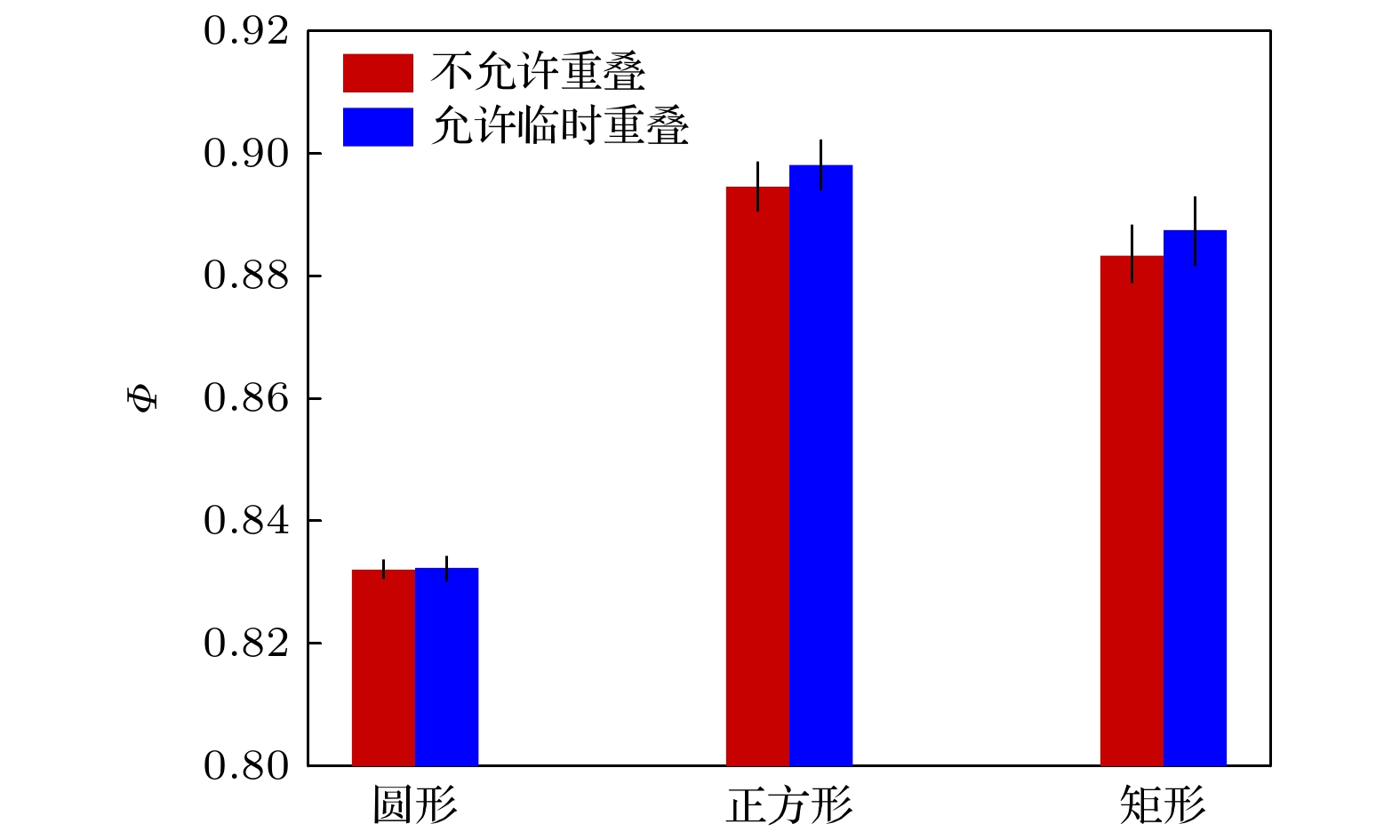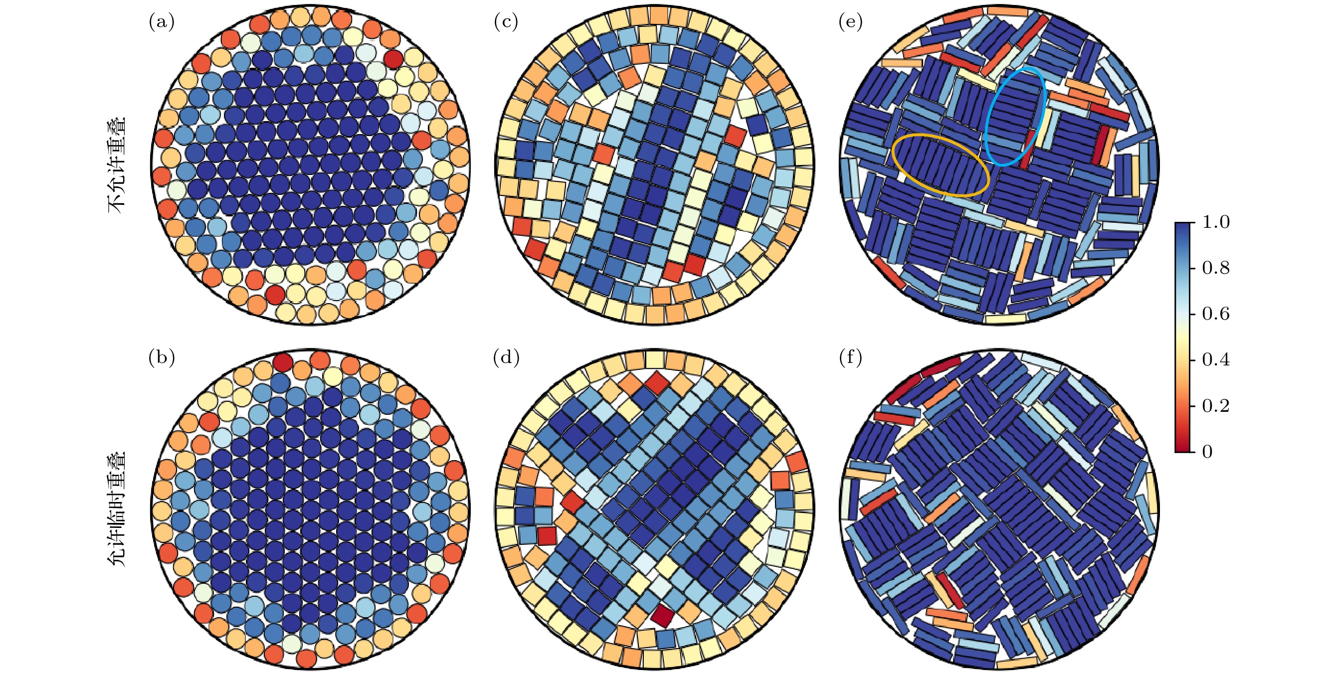 The dense packing of hard particles in confined spaces has sparked widespread interest in mathematics and statistical physics. It relates to classical packing problems, plays a central role in understanding the self-assembly of microscopic particles such as colloids and nanoparticles under geometric constraints, and inspires studies on a wide range of physical systems. However, achieving high packing densities under confinement remains challenging due to anisotropic shapes of particles, the discontinuous nature of hard-core interactions, and geometric frustration. In this work, we develop a Monte Carlo scheme that combines boundary compression with controlled temporary particle overlaps. Specifically, during the compression of a circular boundary,we allow a limited number of overlaps which are then removed before further compression steps. We apply this strategy to three types of two-dimensional particles-disks, squares, and rectangles with an aspect ratio of 5∶1—confined within a circular boundary. As a control, we also perform simulations using a traditional method that strictly prohibits overlaps throughout. The final configurations from both methods exhibit similar structural features. For hard disks, central particles form a triangular lattice, while those near the boundary become more disordered to accommodate the circular geometry. For hard squares, particles in the center organize into a square lattice, whereas those near the boundary form concentric layers. For rectangles, particles in the central region display local smectic-like alignment within clusters that are oriented nearly perpendicular to each other. Near the boundary, some particles align tangentially along the circular edge. Quantitatively, the temporary-overlap strategy consistently yields denser packing across all particle types. The analysis shows that the average packing density and maximal packing density of 10 independent samples obtained from the above strategy are higher than those from the traditional method. Further analysis of the radial distribution functions and orientational order parameters reveals that although both methods produce similar structural features, the overlap-allowed method yields a larger central region exhibiting lattice-like or cluster-like ordering. Our findings suggest that allowing temporary particle overlaps is an effective strategy for generating dense configurations of hard particles under confinement. This approach may be extended to more complex systems, including three-dimensional particles or mixtures of particles of different shapes confined within restricted geometries.