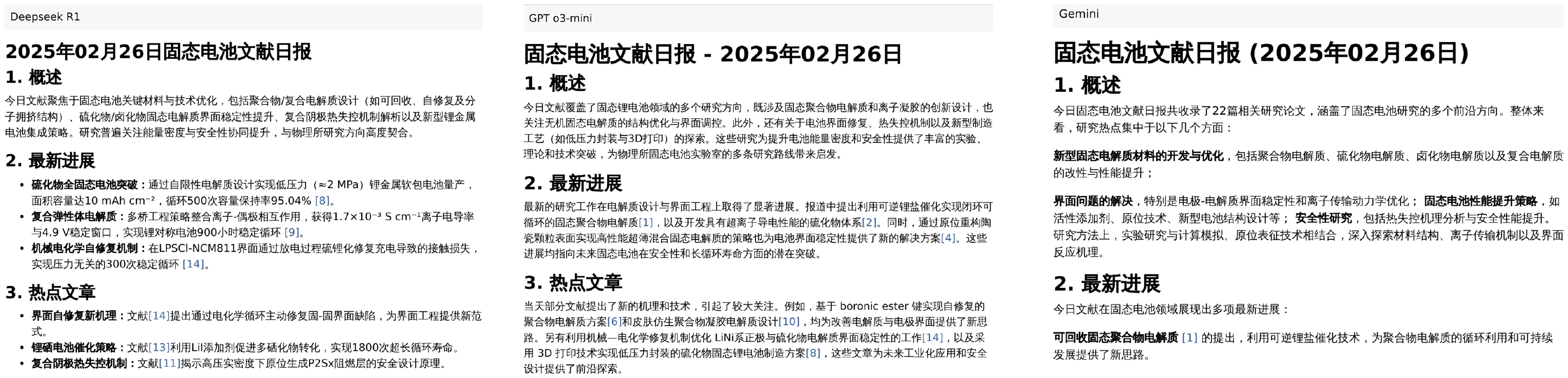 The emergence of large language models has significantly advanced scientific research. Representative models such as ChatGPT and DeepSeek R1 have brought notable changes to the paradigm of scientific research. While these models are general-purpose, they have demonstrated strong generalization capabilities in the field of batteries, especially in solid-state battery research. In this study, we systematically screen 5309268 articles from key journals up to 2024, and accurately extract 124021 papers related to batteries. Additionally, we comprehensively search through 17559750 patent applications and granted patents from the European Patent Office and the United States Patent and Trademark Office up to 2024, identifying 125716 battery-related patents. Utilizing these extensive literature and patents, we conduct numerous experiments to evaluate the structured output capabilities of knowledge base, contextual learning, instruction adherence, and language models. Through multi-dimensional model evaluations and analyses, the following points are found. First, the model exhibits high accuracy in screening literature on inorganic solid-state electrolytes, equivalent to the level of a doctoral student in the relevant field. Based on 10604 data entries, the model demonstrates good recognition capabilities in identifying literature on in-situ polymerization/solidification technology. However, its understanding accuracy for this emerging technology is slightly lower than that for solid-state electrolytes, requiring further fine-tuning to improve accuracy. Second, through testing with 10604 data entries, the model achieves reliable accuracy in extracting inorganic ionic conductivity data. Third, based on solid-state lithium battery patents from four companies in South Korea and Japan over the past 20 years, this model proves effective in analyzing historical patent trends and conducting comparative analyses. Furthermore, the model-generated personalized literature reports based on the latest publications also show high accuracy. Fourth, by utilizing the iterative strategy of the model, we enable DeepSeek to engage in self-reflection thinking, thereby providing more comprehensive responses. The research results indicate that language models possess strong capabilities in content summarization and trend analysis. However, we also observe that the model may occasionally experience issues with numerical hallucinations. Additionally, while processing a large number of battery-related data, there is still room for optimization in engineering applications. According to the characteristics of the model and the above test results, we utilize the DeepSeek V3-0324 model to extract data on inorganic solid electrolyte materials, including 5970 ionic conductivity entries, 387 diffusion coefficient entries, and 3094 migration barrier entries. Additionally, it includes over 1000 data entries related to chemical, electrochemical, and mechanical properties, covering nearly all physical, chemical, and electrochemical properties related to inorganic solid electrolytes. This also means that the application of large language models in scientific research has shifted from auxiliary research to actively promoting its development. The datasets presented in this paper may be available at the website:https://cmpdc.iphy.ac.cn/literature/SSE.html (DOI: https://doi.org/10.57760/sciencedb.j00213.00172 ).