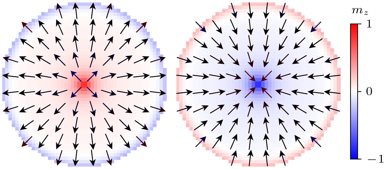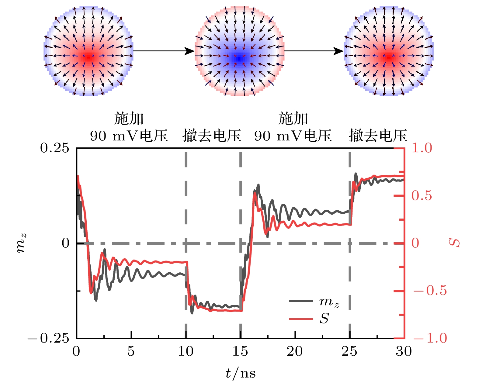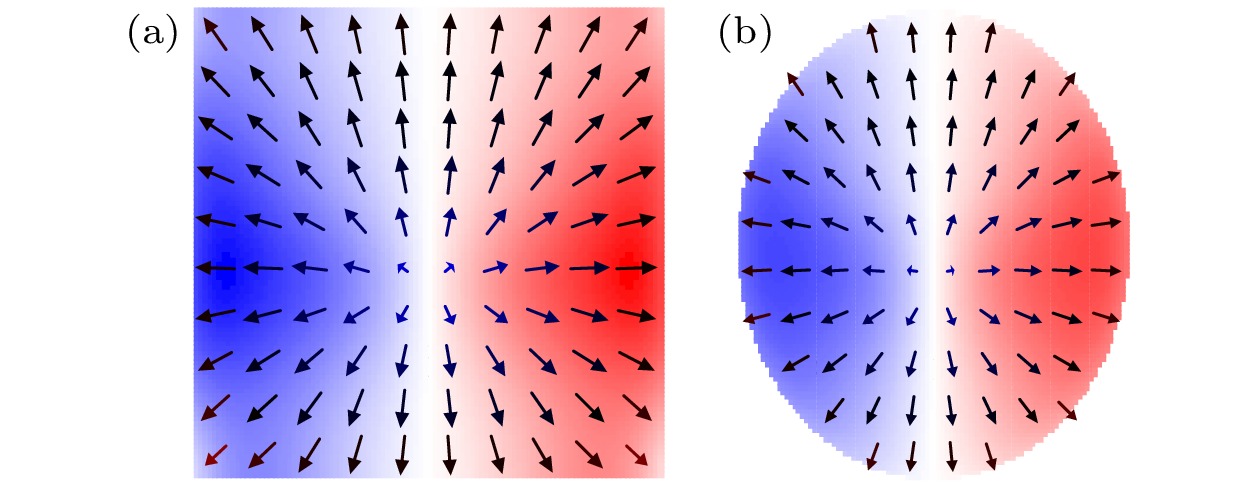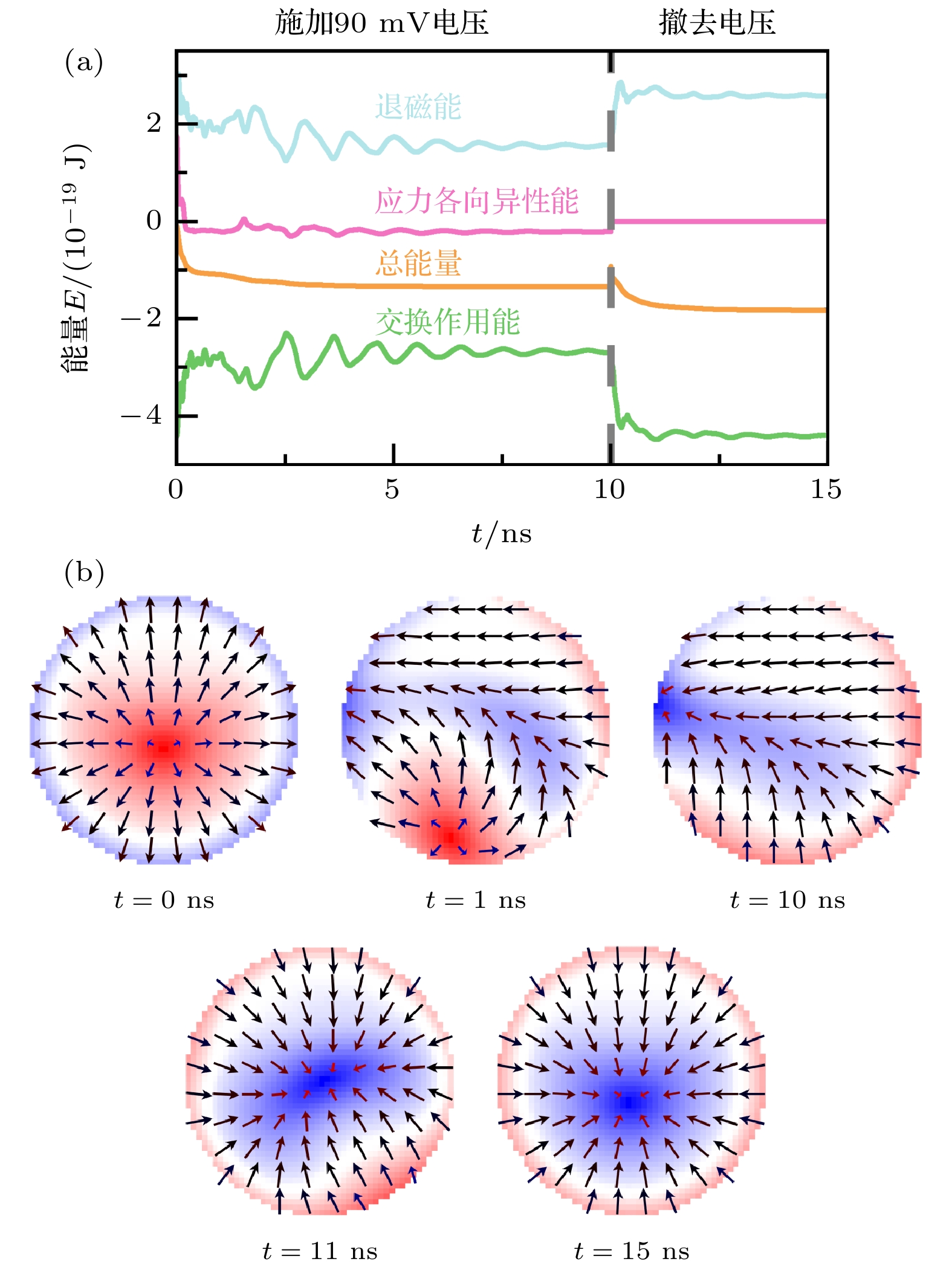 Radial magnetic vortices, characterized by their topological stability and nanoscale dimensions, are considered to be highly promising information carriers in magnetic electronic devices. However, traditional methods of reversing the polarity of radial magnetic vortices, which rely on magnetic fields or spin-polarized currents, encounter significant energy consumption problems. To address this challenge, this study proposes a novel field-free control scheme based on multiferroic heterostructures, consisting of a bicomponent nanomagnet (Terfenol-D/Ni), a heavy metal layer, and a piezoelectric layer. The intrinsic symmetry-breaking property of this structure effectively disrupts the circular symmetry of the radial magnetic vortex, which can make voltage-driven polarity reversal through magnetoelectric coupling effects. MuMax3-based multifield coupling simulations of electro-mechanical-magnetic interactions show that when the ratio of the bicomponent materials\begin{document}$ d _ { \rm T D } : d _ { \rm Ni } = 1 : 2 $\end{document} and the interfacial Dzyaloshinskii-Moriya interaction (DMI) coefficient (D) is in a range of \begin{document}$ 1 . 2\; {\rm m J / m ^ { 2 } } < D < 1 . 9\; {\rm m J / m ^ {2}} $\end{document} , the system stably presents a radial magnetic vortex state. Within this DMI coefficient range, when the thickness of the bicomponent nanomagnet is less than 4 nm, an appropriate radius can be found to ensure that the ground state of the bicomponent nanomagnet is a radial magnetic vortex state. Particularly, when the thickness t = 1 nm, the radius of the bicomponent nanomagnet can remain in the radial magnetic vortex state in a range of 50 ± 10 nm. In addition, this study also verifies that square and elliptical bicomponent nanomagnets each have a ground state of radial magnetic vortex. When \begin{document}$ D = 1.7\;{\rm m J / m ^ {2}} $\end{document} , only a 90 mV voltage pulse is required to achieve polarity reversal of the bicomponent nanomagnet, with a total energy consumption per bit Etotal of 5.6 aJ, which is six orders of magnitude lower than that from the traditional methods (reaching the aJ level). Through the simulation of transient magnetization dynamics and the analysis of energy evolution, this study reveals the physical mechanism of polarity reversal of radial magnetic vortices in this bicomponent multiferroic heterostructure: The energy competition in the bimaterial system driven by strain leads to the reconfiguration of magnetic moments, achieving the polarity reversal with efficient and ultra-low energy consumption. This scheme provides a new path for on-chip integration of magnetic vortex memory and opens up a new paradigm for designing non-current-driven “electric write” magnetic storage devices, which has significant application value in the field of low-power spintronics.