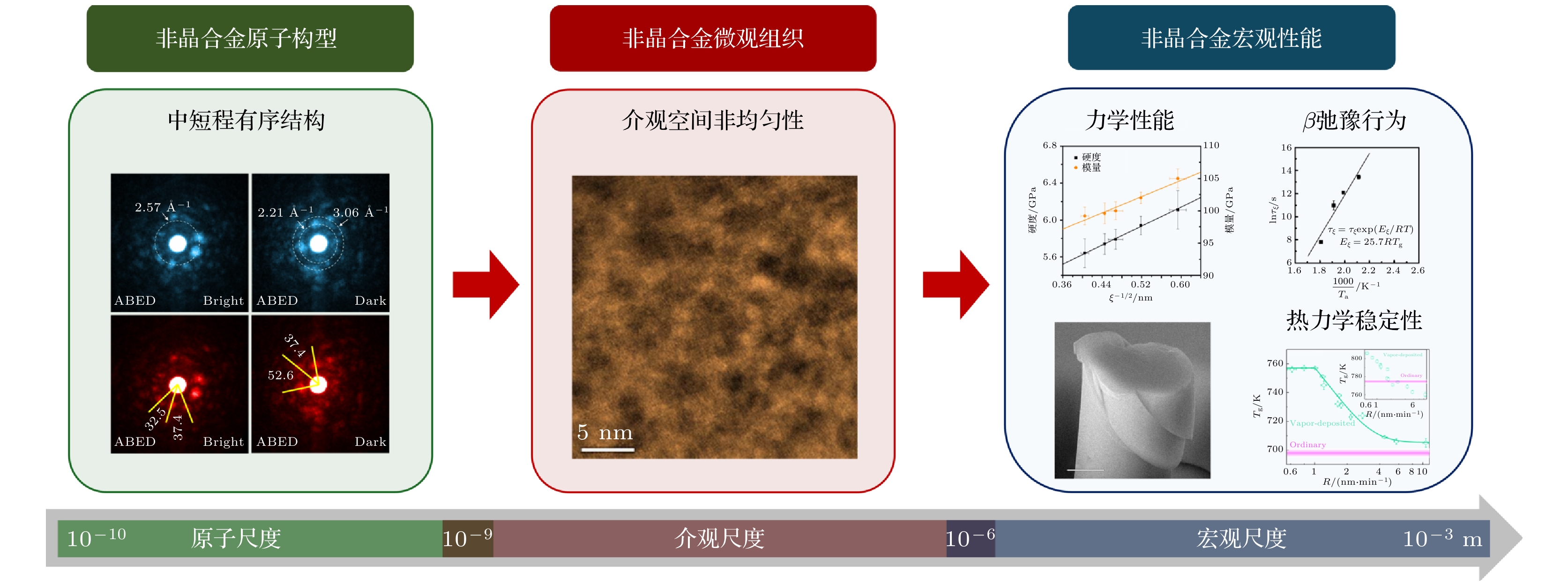 The atomic arrangement of metallic glasses lacks long-range periodicity, and exhibits structural characteristics of an amorphous state. Their unique structural features lead to research methods that differ from traditional metallic crystalline materials, focusing mainly on two scales: one is a macroscopic scale, on which glass-forming ability and mechanical behavior are investigated through alloy design, thermodynamic parameters, and other means; the other is an atomic scale, on which short- to medium-range orders of metallic glass are studied through computational simulations and diffraction techniques. There is a difference of over seven-orders of magnitude between the two scales, which makes it difficult to establish a direct quantitative relationship between them. Therefore, a structural feature is needed that can connect atomic configurations with macroscopic properties on a mesoscopic scale. With the development of amorphous structure characterization technique, it has been found that metallic glasses exhibit spatial heterogeneity at the nanometer and micrometer levels above a short-to-medium range, with their scales ranging between macroscopic and atomic scales. This article introduces experimental characterization methods for spatial heterogeneity, focuses on the electron microscopic characterization methods of spatial heterogeneity and local atomic orders, and discusses their intrinsic correlations with macroscopic properties such as β-relaxation behavior, mechanical behavior, thermodynamic stability, and glass-forming capability. Spatial heterogeneity, as a structural characteristic of metallic glasses on a mesoscopic scale, can serve as a link between short/medium-range orders and macroscopic properties of atoms.
