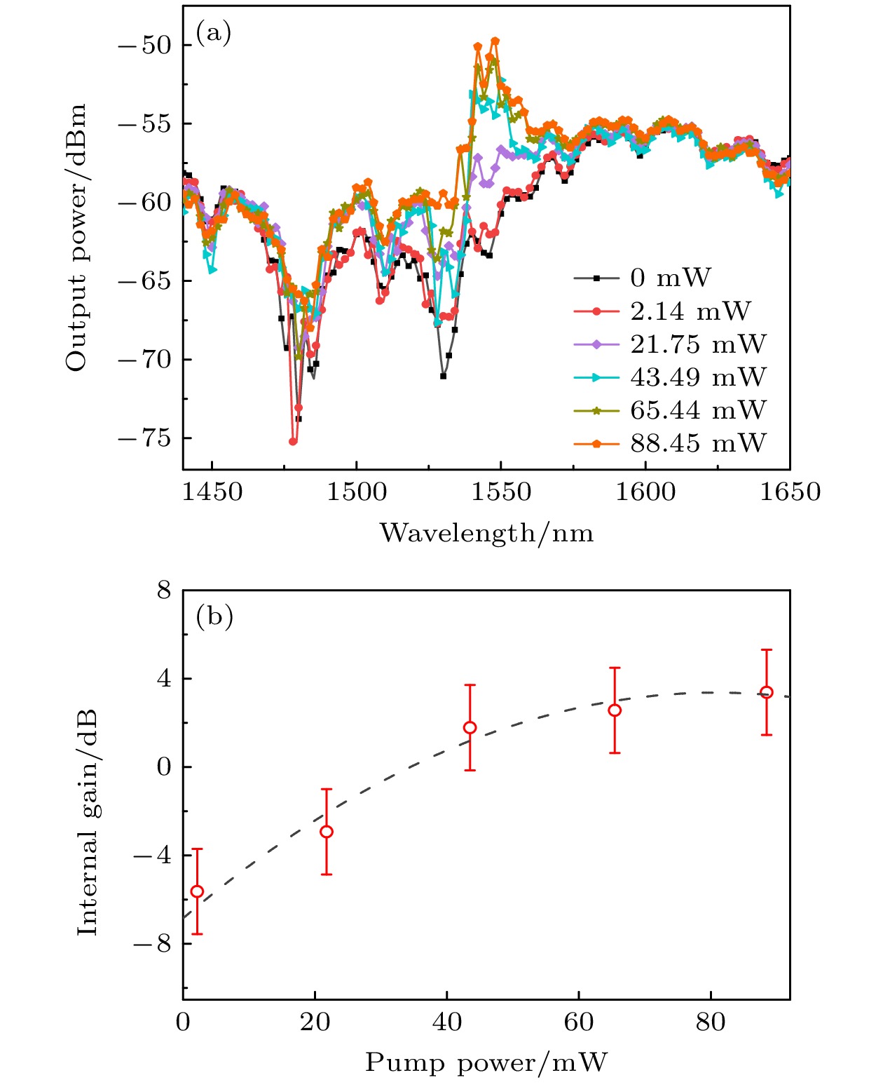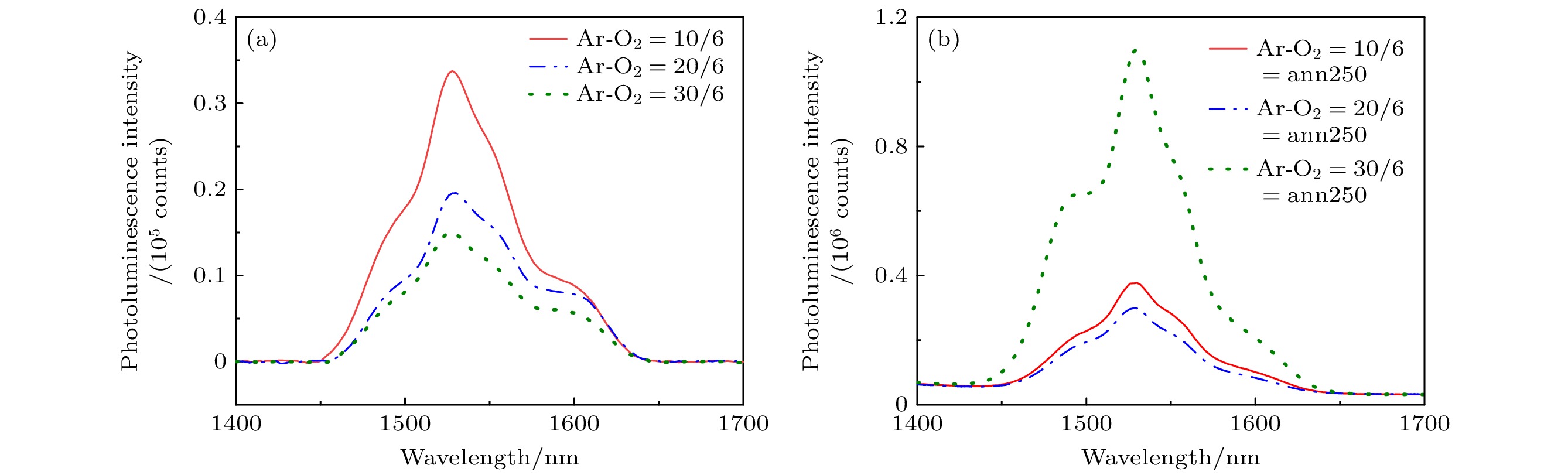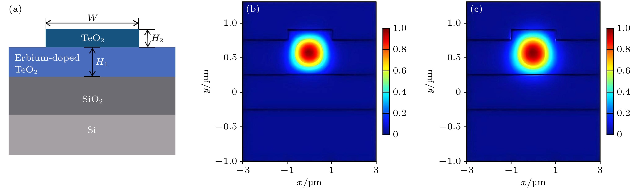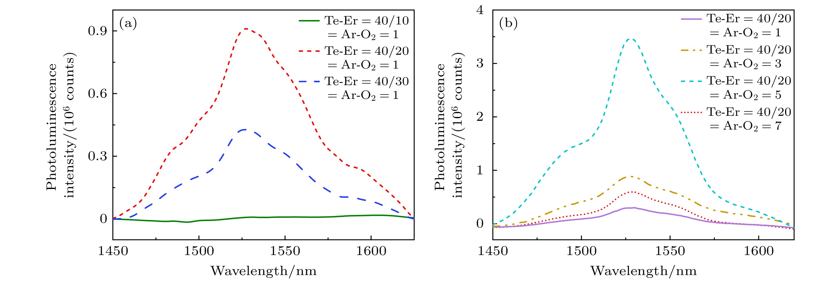 The rapid advancement of information technology has sparked an exponential demand for high-speed, large-capacity data transmission and processing. Traditional electronic communication systems face inherent limitations such as bandwidth constraints and electromagnetic interference, prompting people to shift toward photonic technologies. Integrated optical waveguides, as core components of on-chip photonic systems, enable efficient light confinement and manipulation at microscale dimensions, offering advantages in miniaturization, low power consumption, and high compatibility with existing optical communication infrastructure. Among these, erbium-doped waveguide amplifiers (EDWAs) have emerged as critical active devices for signal amplification in the 1550 nm communication band, leveraging the radiative transitions of Er3+ ions to achieve optical gain. Numerous studies have shown that the fluorescence performance of Er3+ is closely related to the factors such as doping method, preparation and annealing conditions. Besides, the performance of such amplifiers heavily relies on the choice of host materials, which must exhibit low optical loss, high rare-earth ion solubility, and compatibility with complementary metal-oxide-semiconductor (CMOS) fabrication processes. Tellurium dioxide (TeO2), with its high refractive index (2.1–2.4), broad transparency range (0.33–5 μm), exceptional chemical stability, and low phonon energy, has shown significant promise as a superior alternative to traditional materials such as silicon nitride (Si3N4) and aluminum oxide (Al2O3). This study focuses on the development of erbium-doped TeO2 (Er:TeO2) ridge waveguides for on-chip optical amplification. The Er:TeO2 thin films are deposited via radio frequency (RF) magnetron sputtering using high-purity Te and Er targets. The key deposition parameters, including Er2O3 target sputtering power (10–30 W), Ar/O2 gas flow ratio (1∶1 to 5∶1), and post-deposition annealing conditions (200–300 ℃ under oxygen atmosphere), are systematically optimized to improve photoluminescence properties. Scanning electron microscopy (SEM) and fluorescence spectroscopy are employed to evaluate film morphology and emission characteristics. A bilayer waveguide structure is designed to mitigate surface roughness induced by direct etching of the Er-doped layer. The lower Er:TeO2 active layer (500 nm in thickness) and upper undoped TeO2 cladding layer (150 nm in thickness) are patterned by using ultraviolet lithography and plasma etching (O2/Ar/CHF3 gas mixture), achieving a ridge width of 2 μm. Optical confinement and mode field distribution are simulated by using finite-difference eigenmode (FDE) analysis, confirming effective light-matter overlap within the Er-doped region. Experimental results reveal that the optimal Er:TeO2 film, deposited at an Er target power of 20 W and an Ar/O2 flow ratio of 5∶1, and annealed at 250 ℃ for 10 hours, exhibits a photoluminescence intensity of 3.5 × 106 photon counts at 1545 nm–nearly two orders of magnitude higher than non-annealed samples. Oxygen annealing effectively activates Er3+ ions while passivating oxygen vacancies, which is critical for minimizing non-radiative recombination. Excessive Er doping (30 W in sputtering power) leads to ion clustering and fluorescence quenching, highlighting the importance of controlled dopant concentration. Surface morphology analysis via SEM and optical microscopy confirms smooth, crack-free films with minimal particulate contamination, which is essential for low-loss waveguide fabrication. Waveguide performance is characterized by using the cut-back method at 1310 nm, yielding a propagation loss of 0.607 dB/cm for a 0.5 cm-long device. However, a coupling loss of 6.34 dB/facet is observed due to rough end-faces from mechanical dicing, highlighting the need for post-fabrication polishing or anti-reflective coatings. Amplification tests at 1545 nm under 980 nm pumping demonstrate an internal gain of 7.2 dB/cm at a pump power of 88.45 mW, with gain saturation observed beyond 90 mW. The broadband emission spectrum (80 nm full-width at half-maximum) further validates Er:TeO2’s potential for wideband amplification in the C-bands. In summary, this study elucidates the advantages of erbium-doped tellurium oxide (Er:TeO2) ridge waveguides as on-chip optical amplifiers, optimizes their deposition and annealing protocols, and designs a bilayer waveguide structure. The achieved low propagation loss and significant internal gain highlight the compatibility of materials with photonic integrated circuits (PICs). Future efforts will focus on improving the quality of waveguide endface, enhance pump efficiency, and scaling device lengths to achieve practical net gains for telecommunications and quantum photonic applications. These advancements render Er:TeO2 a cornerstone material for next-generation compact, high-performance photonic systems.