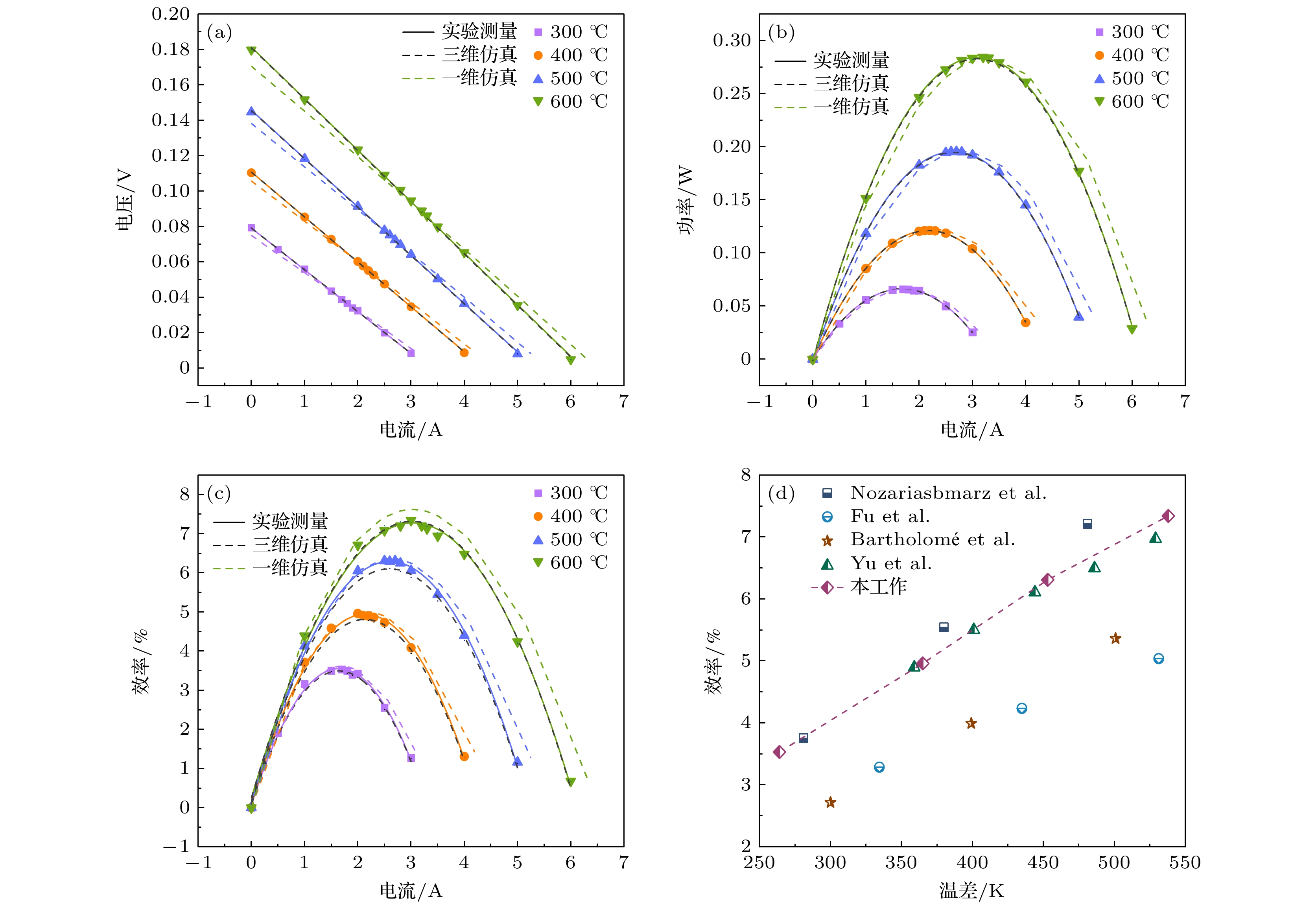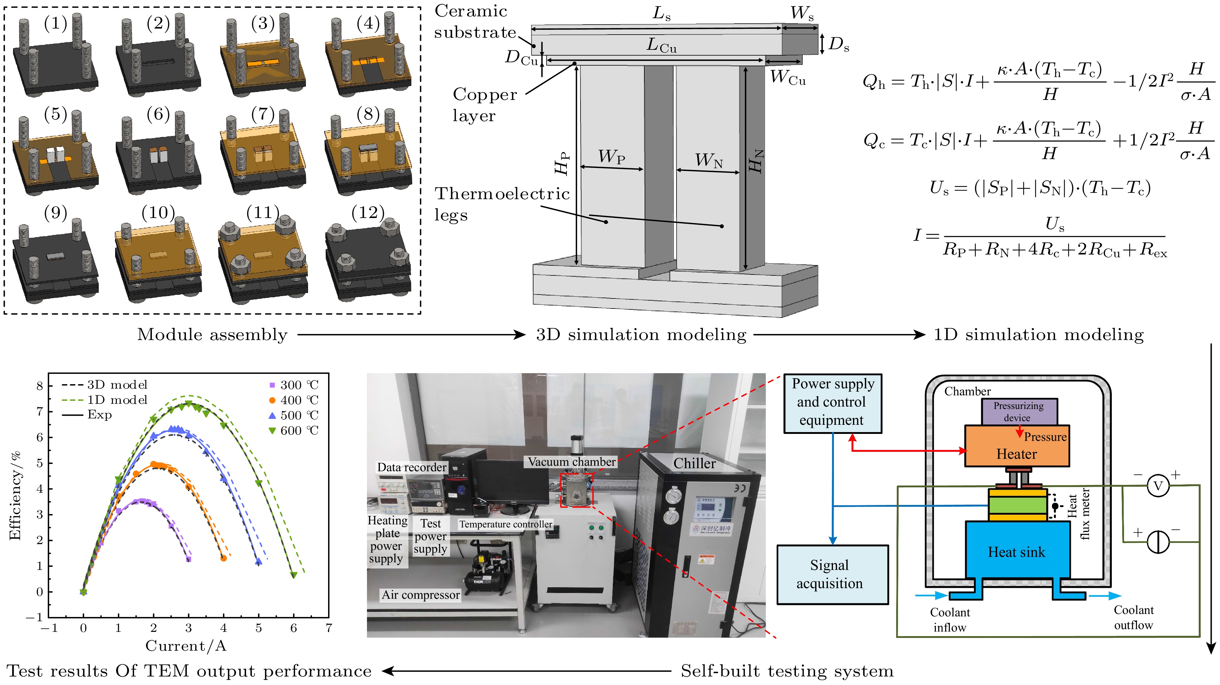 Due to the ability to directly convert thermal energy into electrical energy, thermoelectric devices operating in the medium-to-high temperature range hold significant potential for applications such as deep space exploration and industrial waste heat recovery. Among candidate materials, half-Heusler alloys have emerged as promising options for device fabrication in this temperature range, owing to their excellent mechanical properties, thermal stability, and favorable thermoelectric performance. However, research on half-Heusler-based thermoelectric devices remains far behind study of the materials, which limits their large-scale industrial application. In this study, high-performance P-type Hf0.5Zr0.5CoSb0.8Sn0.2 and N-type Hf0.75Zr0.25NiSn0.99Sb0.01 half-Heusler alloys are firstly synthesized. Then the single-pair thermoelectric module is successfully brazed and assembled by using the graphite mold designed by ourselves. After that, three-dimensional (3D) finite element modeling and one-dimensional (1D) numerical modeling are conducted to simulate the module behaviors, and their results are highly consistent with experimental measurements, thereby validating the accuracy of the simulation models. Using the established simulation models, the influence of geometric parameters on module performance is investigated. The result shows that optimizing the leg height and cross-sectional area ratio is critical for achieving maximum conversion efficiency. Additionally, a self-integrated comprehensive testing system (Model: TE-X-MS) is developed to systematically characterize key thermoelectric properties, including output power and conversion efficiency. The fabricated device achieves a maximum output power of 0.28 W and a peak conversion efficiency of 7.34% at a temperature difference of 538 K, which is comparable to the best-performing devices reported to date. These results provide valuable reference for fabricating, modeling, and characterizing the half-Heusler thermoelectric devices in practical applications.