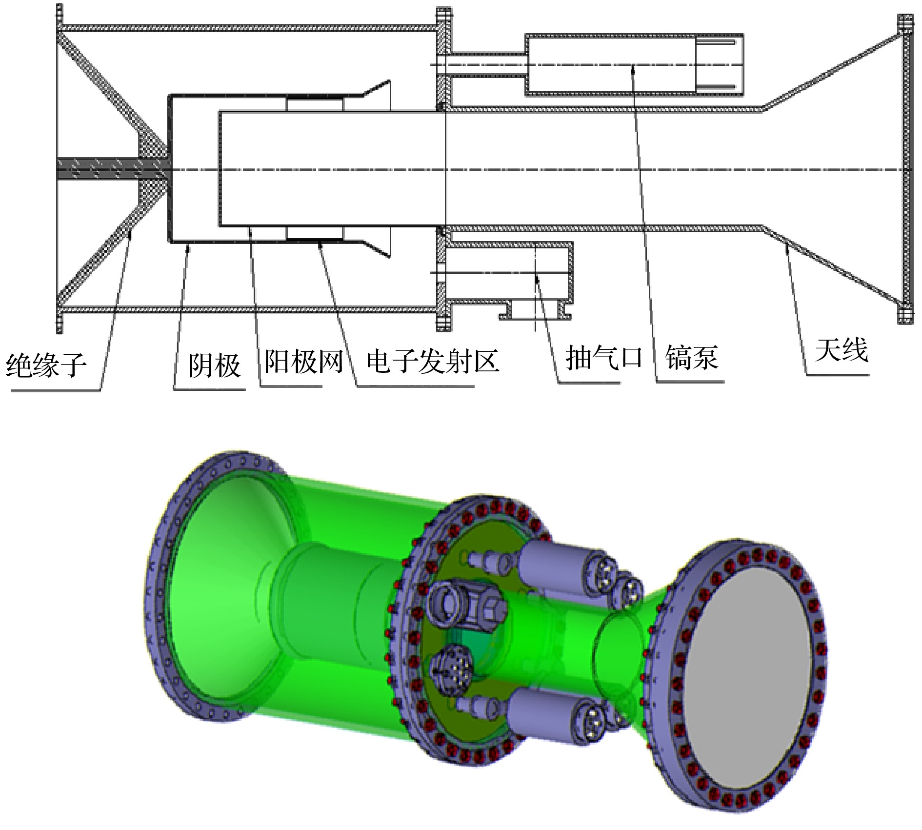 01mode. The microwave power obtained in the experiment is measured by the array antenna power density integration method. For axisymmetric mode, a receiving antenna array is formed by placing multiple receiving antennas on one side of the axis of the antenna pattern. The power densities of different angles on the horizontal circumference with the phase center of the transmitting antenna are measured, the average power density of two adjacent points is multiplied by the area of the spherical belt between these two points, and then the resulting power is added by the power between the adjacent two points, thereby obtaining the total radiation power. With this method, the microwave power is 850 MW with frequency 4.1 GHz and pulse width 30 ns under slaving voltage 400 kV.