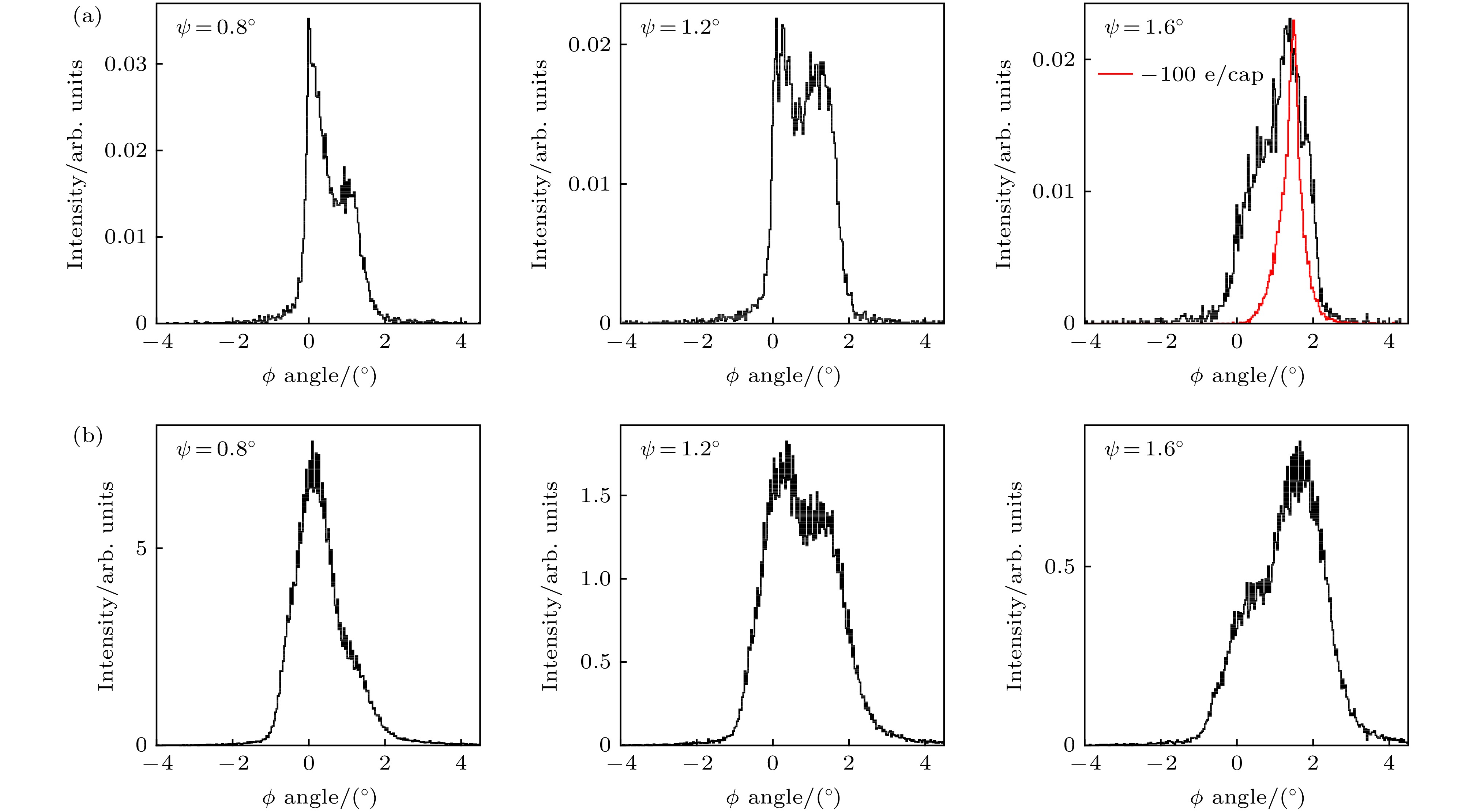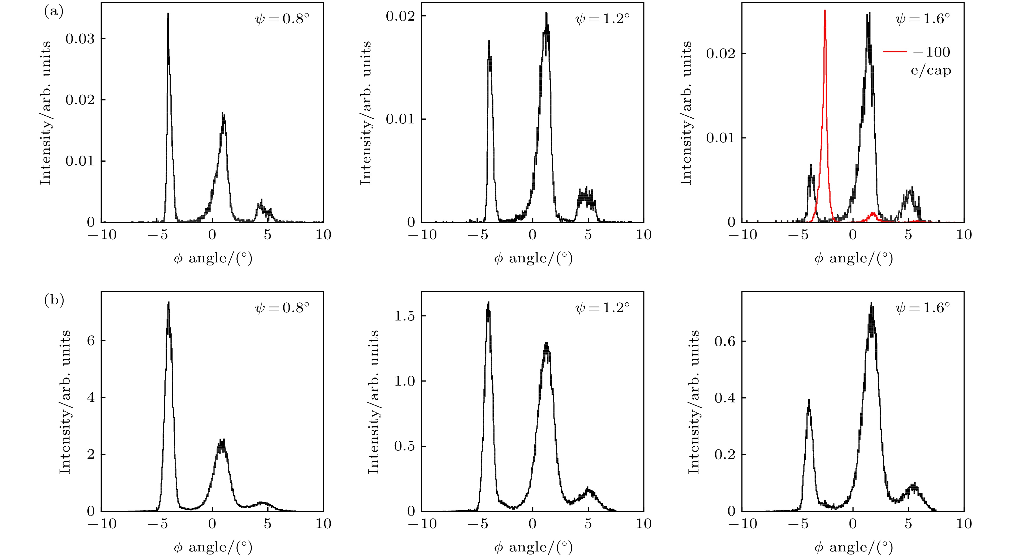 oare simulated for the cases without and with deposited charges of –100 e/capillary. For the deposition charge quantity of –100 e/capillary, the majority of the transmitted projectiles are mainly the directly transmitted Cl