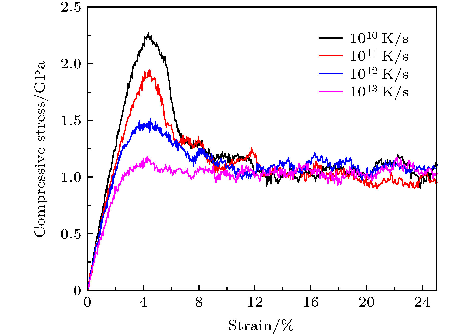 7ternary composition with good glass-forming ability is selected as a research prototype in this work. The classical molecular dynamics simulation is utilized to construct four structural MG models with the same size under different cooling rates, and the uniaxial compressive deformation for each model is also simulated. It is found that an MG model prepared at a lower cooling rate has a higher yield strength and is more likely to form shear bands that lead the strain to be localized, resulting in a lower plasticity. The Voronoi tessellation, together with atomic packing efficiency and free volume algorithms that have been designed by ourselves, is used to analyze the four as-constructed models and high-temperature liquid model. It is found that the as-constructed model, which is prepared by quenching metallic melt at a higher cooling rate, can preserve more structural characteristics of the high-temperature liquid. In other words, the higher cooling rate leads to more clusters with relatively low five-fold symmetry, loose atomic packing and large fraction of free volumes in MG. By calculating the distribution of the free volumes, a new computational approach to detecting liquid-like regions in MG models is adopted. It is found that there are more liquid-like regions in the as-constructed model which is prepared by quenching metallic melt at a relatively high cooling rate. This should be the structural origin of the effect of cooling rate on the deformation behavior, in particular, the yield strength and the plasticity. This work provides an understanding of how the cooling rate during quenching affects the microstructure and deformation behavior, and will shed light on the development of new MGs with relatively large plasticity.