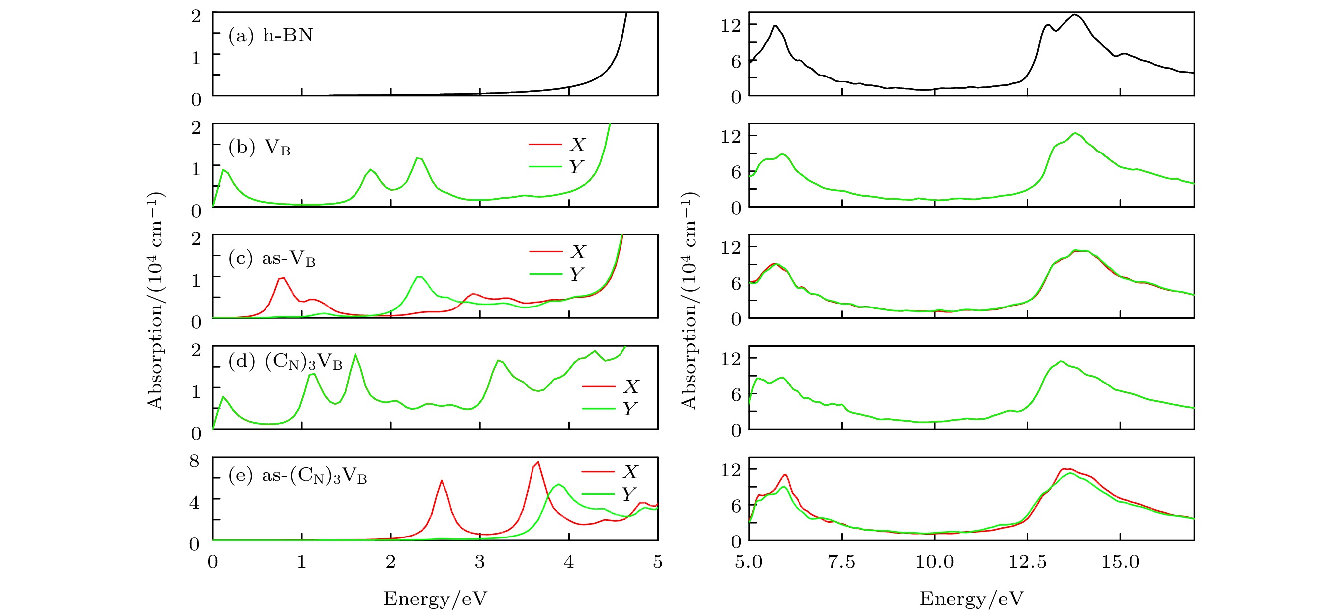B. In the transition from the metastable state to the ground state, these defect states can redshift the light absorption boundary of hBN, enhance the absorption intensity of visible light by hBN, and cause internal optical transitions. Among them, there is a visible light transition with an energy threshold around 2.58 eV in the asymmetry (C