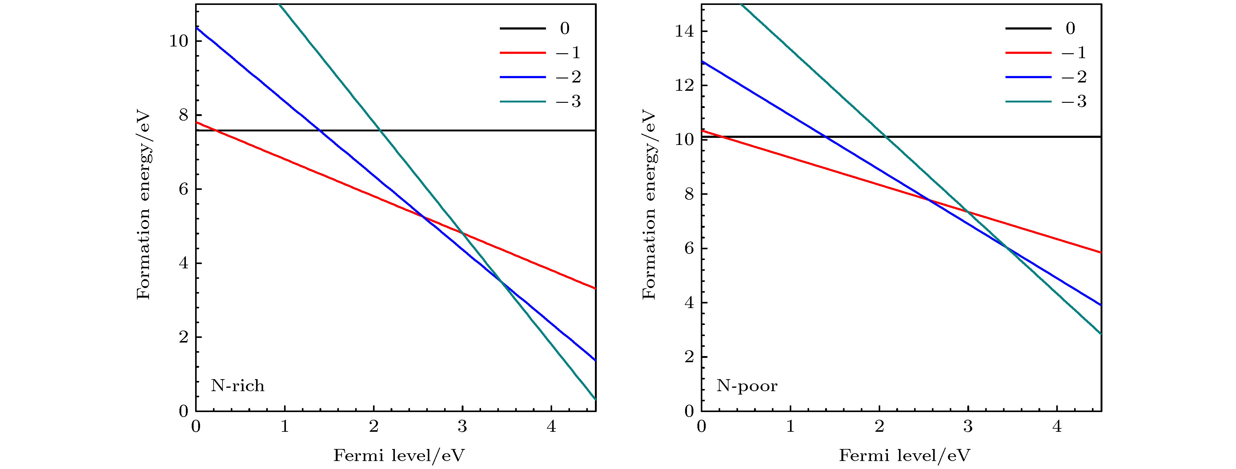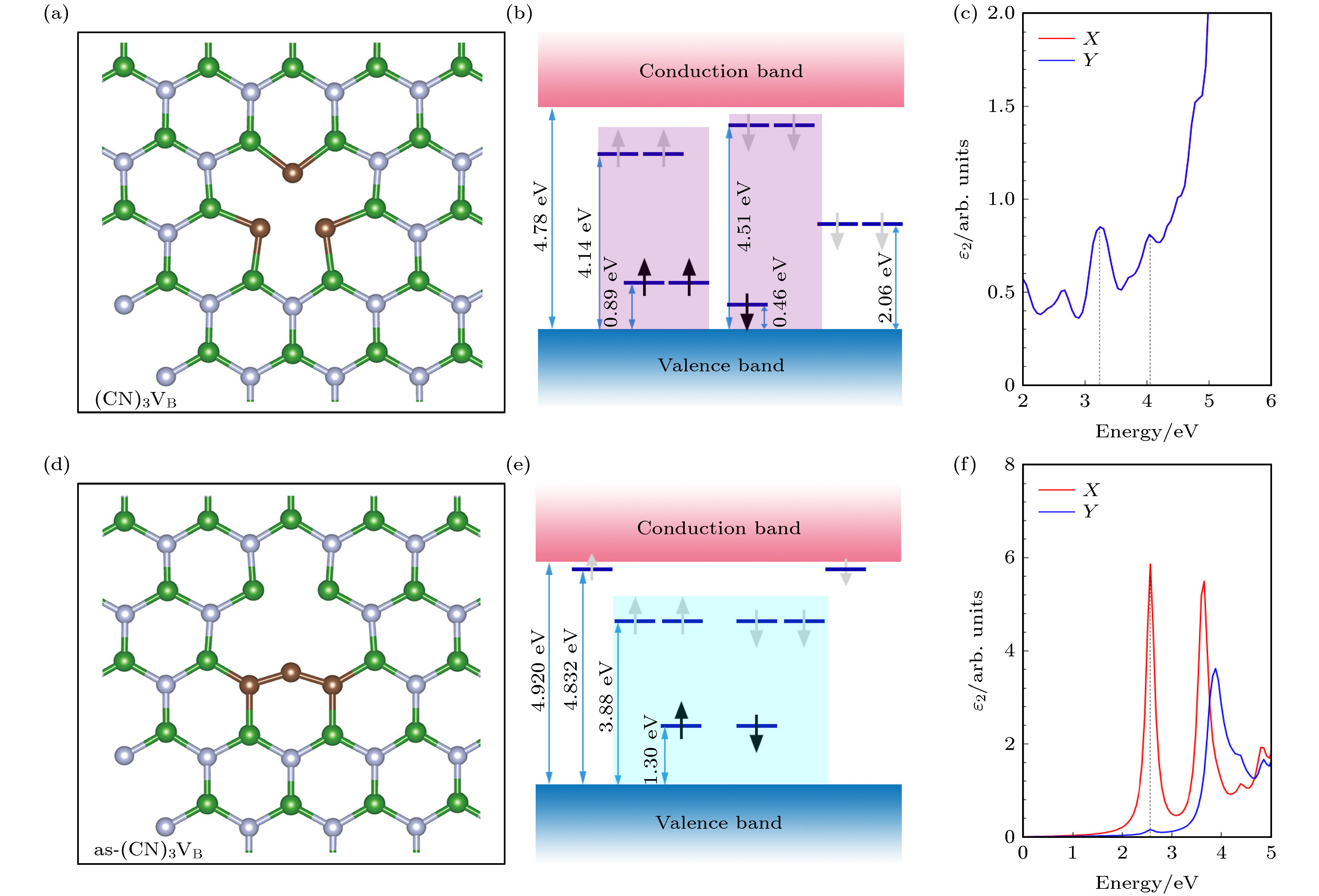 Bis 7.94 eV, which is 3.72 eV lower than that of symmetric one. The formation of defects introduces some local defect states contributed by defect dangling σ bonds and reconstructed π bonds in hBN. The defects have valence states between –2 and +2, and the thermodynamic transition energy level of asymmetric (C