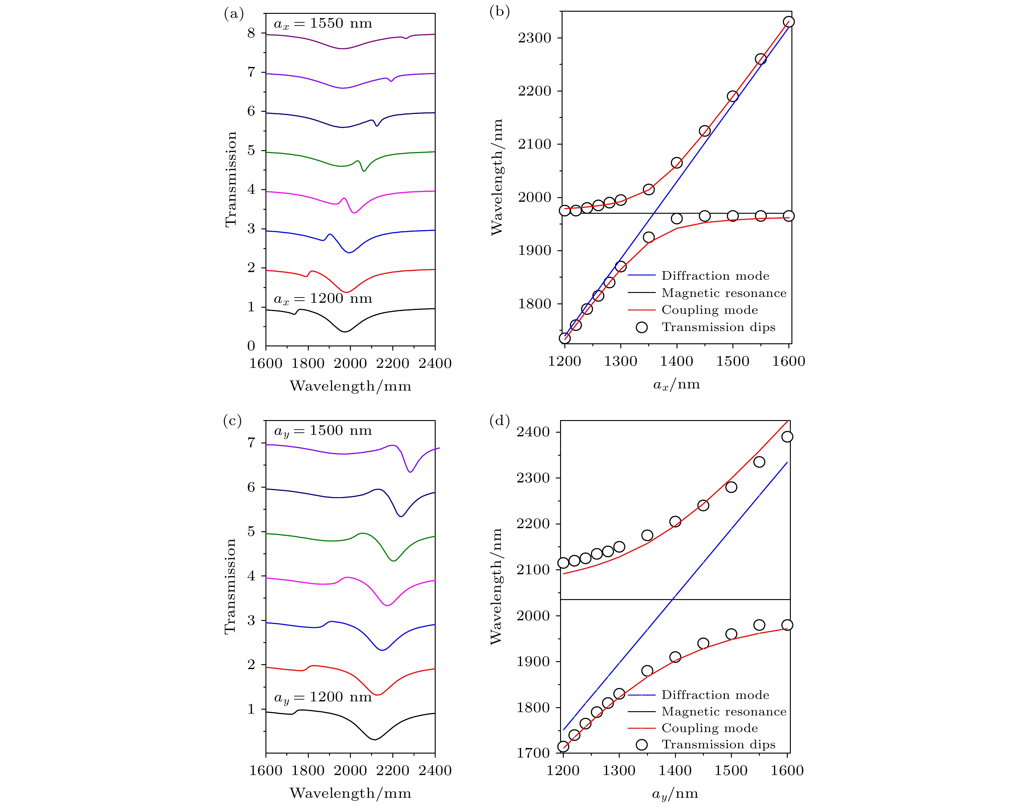 \begin{document}${a_x}$\end{document} is much larger than \begin{document}${a_y}$\end{document}, the electric field direction of the diffraction mode is perpendicular to the polarization direction of the incident light, and no strong coupling occurs. Therefore, the dilution effect is dominant, and the second harmonic intensity gradually decreases with the increase of the period. When \begin{document}${a_y}$\end{document} is much larger than\begin{document}${a_x}$\end{document}, the electric field direction of the diffraction mode is the same as the polarization direction of the incident light. At this time, the diffraction mode and the magnetic resonance mode are strongly coupled. As the period increases, the second harmonic intensity first increases and then decreases. The increase is due to the dominant mode coupling and the decrease is due to the dominant dilution effect. When the number density of split-ring resonators is reduced to about 1/4 of the original one, the second harmonic intensity can be increased by more than twice. From this, we find that the strong coupling between diffraction mode and magnetic resonance can occur when the electric field direction of the diffraction mode is consistent with the polarization direction of incident light, thus generating the surface lattice resonance to achieve near-field enhancement. In short, the rectangular periodic structure is used to distinguish the field enhancement effects in different directions, and the second harmonic enhancement can still be achieved when the number density of split-ring resonators is reduced, which relaxes the requirements for processing technology. This research provides a new possible way to improve the second harmonic generation efficiency based on metal metasurfaces."> - 必威体育下载