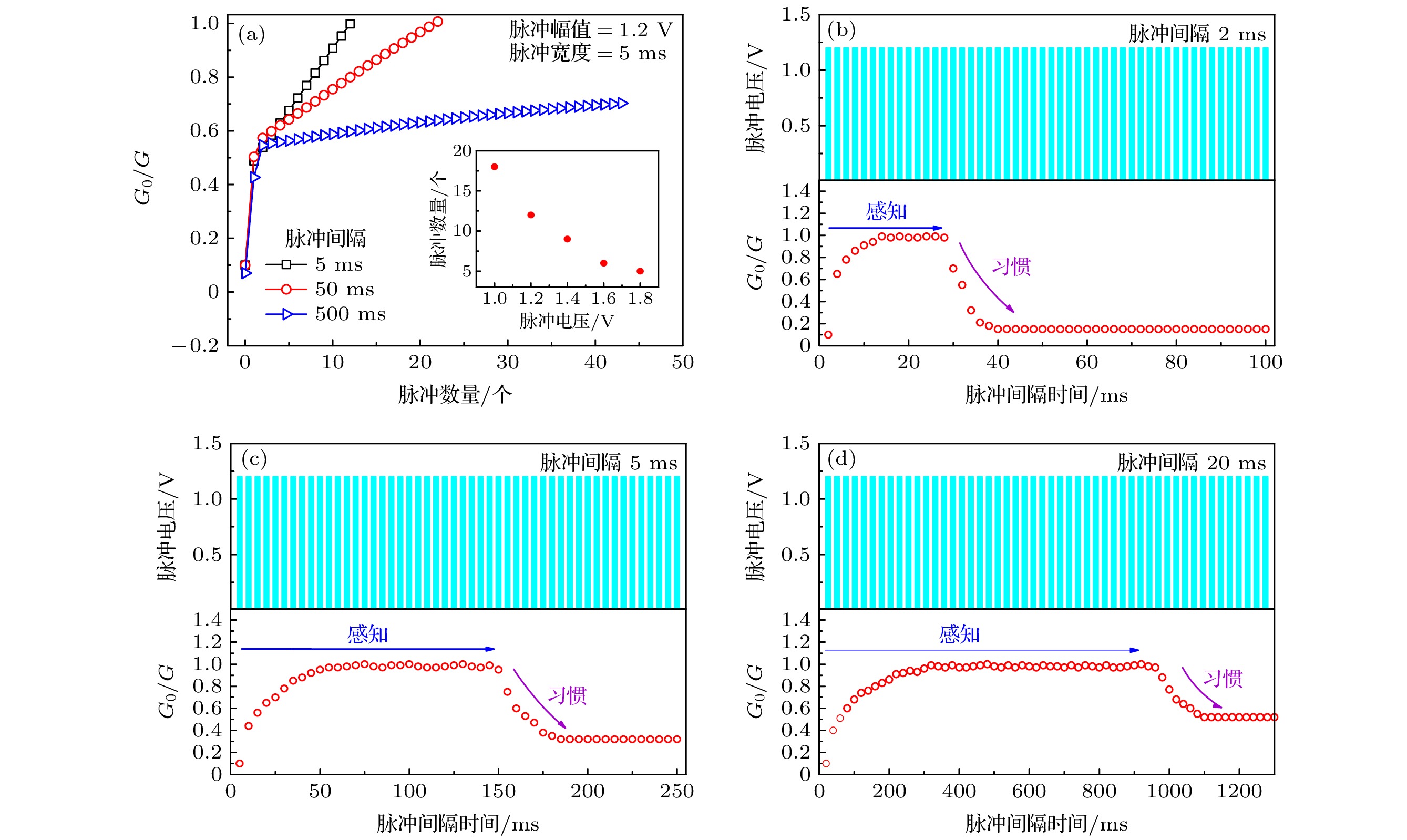 Vmeasurement, the memristor shows unipolar switching properties which may be caused by conductive filament connecting or breaking. In the voltage pulse measurement, pulse interval is an important factor to affect memristor conduction. If the pulse interval is quite large, that is, the pulse frequency is low, the memristor will get maximized conduction very slow or in infinity time. If choosing an appropriate pulse voltage and interval value, the habituation will be observed after several stimulus pulses. The larger pulse interval needs more pulse numbers to cause memristor to be habituated, but which results in higher device conduction finally. A habituation memristor can act as synapse and connect with neuron to build the whole leaky integrate-and-fire (LIF) model which is quite often used in circuit design to mimic a real organism neuron behavior. In this model, neuron could be fired only when it gets enough stimuli from previous neuron. If the stimulus pulse frequency is low, there is observed no firing phenomenon in this case. In this study, the input signal of LIF model is a continuous voltage pulse with an amplitude of 1.2 V and interval of 5 ms. Such an input signal will be transmitted by habituation memristor to a neuron electronic element. The output signal is the pulse generated by neuron when it is fired. According to the results, the frequency of output signal is smaller than input information which complies with the basic characteristics of habituation. It is supposed that organisms should not response to this repetitive pulse any more and it will make neuron have more capabilities to handle following information.