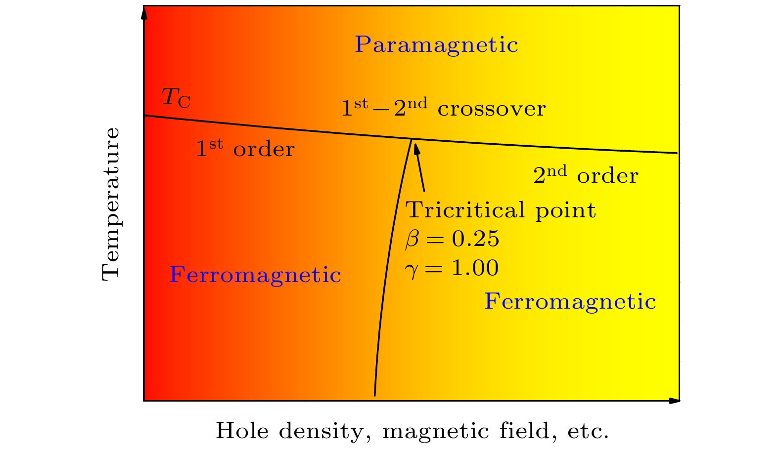 Material Technique β γ δ Model Ref. La0.7Ba0.3MnO3SC MAP 0.35 1.41 5.5 3D-Heisenberg [26] La0.7Ba0.3MnO3PC MAP 0.493 1.059 3.15 Mean-field [27] La0.67Ba0.33MnO3PC MAP 0.464 1.29 3.78 Mean-field/3D-Heisenberg [28] La0.7Sr0.3MnO3SC MAP 0.37 1.22 4.25 close to 3D-Heisenberg [29] La0.75Sr0.25MnO3SC MAP 0.4 1.27 4.12 Mean-field/3D-Ising [30] La0.8Sr0.2MnO3PC MAP 0.5 1.08 3.13 Mean-field [31] La0.875Sr0.125MnO3SC MAP 0.37 1.38 4.72 3D-Heisenberg [32] La0.6Ca0.4MnO3PC MAP 0.25 1.03 5 Tricritical-Mean-field [33] La0.79Ca0.21MnO3SC MAP 0.09 1.71 20 nonuniversal [34] La0.8Ca0.2MnO3SC MAP 0.374 1.382 4.779 3D-Heisenberg [35] La0.82Ca0.18MnO3SC MAP 0.374 1.379 4.783 3D-Heisenberg [35] Nd0.6Sr0.4MnO3SC KF 0.308 1.172 4.75 3D-Ising [36] Nd0.6Sr0.4MnO3PC MAP 0.51 1.01 3.13 Mean-field [37] Nd0.67Sr0.33MnO3PC MAP 0.23 1.05 5.13 Tricritical-Mean-field [37] Nd0.7Sr0.3MnO3PC MAP 0.271 0.922 4.4 Tricritical-Mean-field [38] Pr0.6Sr0.4MnO3SC KF 0.312 1.106 4.545 3D-Ising [36] Pr0.6Sr0.4MnO3SC MAP 0.365 1.309 4.648 3D-Heisenberg [39] Pr0.6Sr0.4MnO3PC MAP 0.276 0.918 4.325 Tricritical-Mean-field [40] KF 0.273 1.001 4.325 Pr0.71Ca0.29MnO3SC MAP 0.37 1.38 4.62 3D-Heisenberg [41] Pr0.71Ca0.29MnO3PC MAP 0.521 0.912 2.71 Mean-field [42] Pr0.73Ca0.27MnO3SC MAP 0.36 1.36 4.81 3D-Heisenberg [41] Pr0.73Ca0.27MnO3PC MAP 0.362 1.132 4.09 3D-Heisenberg [42] 注: SC表示单晶; PC表示多晶. Material Technique β γ δ Model Ref. La0.67(Ca0.5Ba0.5)0.33MnO3 MAP 0.402 1.110 3.761 Mean-field/3D-Heisenberg [28] La0.7Ca0.15Ba0.15MnO3 MAP 0.438 1.032 3.360 Mean-field [27] La0.7Ca0.2Ba0.1MnO3 MAP 0.284 0.909 4.200 Tricritical-Mean-field/3D-Ising [43] KF 0.297 0.925 4.110 La0.7Ca0.15Sr0.15MnO3 MAP 0.491 1.054 3.150 Mean-field [27] La0.7Ca0.1Sr0.2MnO3 KF 0.360 1.220 4.400 3D-Heisenberg [44] La0.7Ca0.2Sr0.1MnO3 KF 0.260 1.060 5.100 Tricritical-Mean-field [44] La0.69Dy0.01Ca0.3MnO3 MAP 0.230 0.920 5.000 Tricritical-Mean-field [45] KF 0.250 0.870 4.480 La0.7Ca0.28Sn0.02MnO3 KF 0.218 0.858 4.936 Tricritical-Mean-field [46] La0.7Ca0.26Sn0.04MnO3 KF 0.467 1.095 3.345 Mean-field [46] La0.75Dy0.05Sr0.2MnO3 MAP 0.266 0.920 4.460 Tricritical-Mean-field [47] KF 0.272 0.931 4.420 La0.1Nd0.6Sr0.3MnO3 MAP 0.248 1.066 5.170 Tricritical-Mean-field [48] KF 0.257 1.120 5.170 Pr0.4Sm0.15Sr0.45MnO3 KF 0.324 1.212 4.812 3D-Ising [49] Pr0.3Sm0.25Sr0.45MnO3 KF 0.255 0.957 5.105 Tricritical-Mean-field [49] La0.57Nd0.1Sr0.33MnO3 MAP 0.356 1.152 4.235 3D-Heisenberg [50] KF 0.368 1.191 4.236 La0.57Nd0.1Sr0.28□0.05MnO3 MAP 0.312 1.173 4.760 3D-Ising [50] KF 0.326 1.183 4.619 Pr0.6Sr0.4MnO3 MAP 0.276 0.918 4.325 Tricritical-Mean-field [40] KF 0.273 1.001 4.325 Pr0.6Sr0.3□0.1MnO3 MAP 0.253 0.987 4.890 Tricritical-Mean-field [40] KF 0.242 0.945 4.890 Pr0.5□0.1Sr0.4MnO3 MAP 0.323 1.113 4.446 3D-Ising [40] KF 0.325 1.092 4.446 注: □表示离子空位. Material Technique β γ δ Model Ref. La0.67Ba0.33Mn0.98Ti0.02O3 MAP 0.537 1.015 2.890 Mean-field [51] KF 0.551 1.020 2.851 La0.67Ba0.33Mn0.95Fe0.05O3 KF 0.504 1.013 3.040 Mean-field [52] La0.7Ba0.3Mn0.95Ti0.05O3 MAP 0.374 1.228 4.260 3D-Heisenberg [53] La0.7Ba0.3Mn0.9Ti0.1O3 MAP 0.339 1.307 4.780 3D-Ising [53] La0.8Ba0.2Mn0.8Fe0.2O3 MAP 0.365 1.227 4.362 3D-Heisenberg [54] KF 0.318 1.159 4.645 La0.67Sr0.33Mn0.9Fe0.1O3 MAP 0.450 1.240 3.740 Mean-field/3D-Heisenberg [55] KF 0.538 1.330 3.470 La0.7Sr0.3Mn0.95Al0.05O3 KF 0.458 1.001 3.185 Mean-field [56] La0.7Sr0.3Mn0.95Ti0.05O3 KF 0.344 1.149 4.340 Mean-field/3D-Heisenberg [56] La0.7Sr0.3Mn0.9Co0.1O3 KF 0.457 1.114 3.440 Mean-field/3D-Heisenberg [57] La0.7Sr0.3Mn0.99Ni0.01O3 MAP 0.394 1.092 3.990 Mean-field/3D-Heisenberg [58] La0.7Sr0.3Mn0.98Ni0.02O3 MAP 0.400 1.082 3.790 Mean-field/3D-Heisenberg [58] La0.7Sr0.3Mn0.97Ni0.03O3 MAP 0.468 1.010 2.670 Mean-field [58] La0.7Sr0.3Mn0.98Cu0.02O3 KF 0.464 1.162 3.546 close to Mean-field [59] La0.7Sr0.3Mn0.96Cu0.04O3 KF 0.449 1.202 3.681 close to Mean-field [59] La0.67Ca0.33Mn0.9Cr0.1O3 MAP 0.555 1.170 2.710 Mean-field [60] La0.67Ca0.33Mn0.75Cr0.25O3 MAP 0.680 1.090 2.936 close to Mean-field [60] La0.67Ca0.33Mn0.9Ga0.1O3 MAP 0.380 1.365 4.590 3D-Heisenberg [61] KF 0.387 1.362 4.520 La0.7Ca0.3Mn0.95Ti0.05O3 KF 0.601 1.171 2.950 Mean-field [62] La0.7Ca0.3Mn0.9Ti0.1O3 KF 0.389 1.403 4.400 3D-Heisenberg [62] La0.7Ca0.3Mn0.91Ni0.09O3 MAP 0.171 0.976 6.700 Tricritical-Mean-field [63] La0.7Ca0.3Mn0.88Ni0.12O3 MAP 0.262 0.978 4.700 Tricritical-Mean-field [63] La0.7Ca0.3Mn0.85Ni0.15O3 MAP 0.320 0.990 4.100 3D-Ising [63] La0.7Ca0.3Mn0.95Cu0.05O3 MAP 0.490 1.040 3.120 Mean-field [64] La0.7Ca0.3Mn0.9Zn0.1O3 MAP 0.474 1.152 3.430 Mean-field [65] La0.8Ca0.2Mn0.9Co0.1O3 MAP 0.204 1.969 11.983 nonuniversal [66] KF 0.123 1.351 11.983 La0.8Ca0.2Mn0.8Co0.2O3 MAP 0.401 1.332 4.321 3D-Heisenberg [66] KF 0.418 1.303 4.321 Nd0.67Sr0.33Mn0.9Cr0.1O3 MAP 0.337 0.784 3.326 nonuniversal [67] Nd0.67Sr0.33Mn0.9Fe0.1O3 MAP 0.436 0.94 3.156 Mean-field [67] Nd0.67Sr0.33Mn0.9Co0.1O3 MAP 0.431 0.929 3.155 Mean-field [67] Pr0.67Sr0.33Mn0.95Al0.05O3 MAP 0.381 1.323 4.635 3D-Heisenberg [68] KF 0.381 1.320 4.635 Pr0.67Sr0.33Mn0.9Al0.1O3 MAP 0.374 1.333 4.667 3D-Heisenberg [68] KF 0.377 1.331 4.667 Material Technique β γ δ Model Ref. La0.6Sr0.4MnO3SG/800 ºC KF 0.560 1.140 3.035 close to Mean-field [69] La0.6Sr0.4MnO3SG/1100 ºC KF 0.480 1.052 3.190 Mean-field [69] La0.6Sr0.4MnO3SS KF 0.530 1.110 3.094 Mean-field [69] La0.67Sr0.33MnO3SS MAP 0.333 1.325 4.978 3D-Heisenberg [70] La0.67Sr0.33MnO3SG MAP 0.500 1.150 3.290 Mean-field [55] KF 0.479 1.260 3.630 La0.7Ba0.1Ca0.1Sr0.1MnO3WM MAP 0.448 1.148 3.563 Mean-field [71] KF 0.476 1.029 3.096 La0.7Ba0.1Ca0.1Sr0.1MnO3SG MAP 0.235 1.153 5.906 Tricritical-Mean-field [71] KF 0.262 1.165 5.447 La0.7Ca0.2Ba0.1MnO3BM MAP 0.265 0.867 4.271 Tricritical-Mean-field [72] KF 0.261 0.988 4.386 La0.7Ca0.2Ba0.1MnO3SS MAP 0.284 0.909 4.200 Tricritical-Mean-field/3D-Ising [43] KF 0.297 0.925 4.110 La0.7Ca0.2Sr0.1MnO3BM MAP 0.397 0.966 3.430 3D-Heisenberg [73] La0.7Ca0.2Sr0.1MnO3SS MAP 0.276 0.966 4.500 Tricritical-Mean-fiel