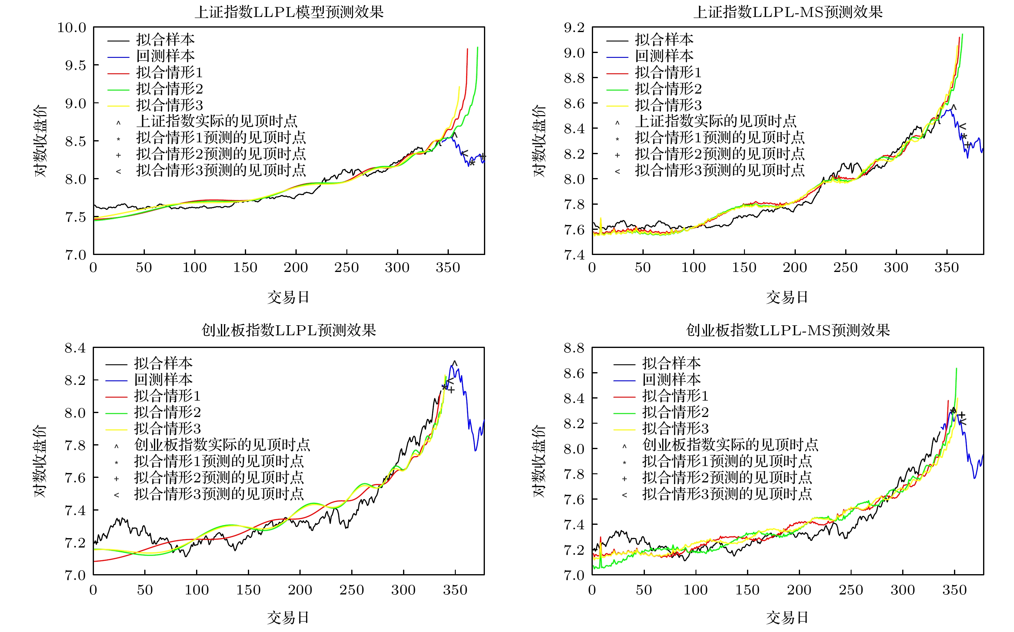 对误差LPPL 上证指数 9 27 18 创业板指 4 10 7 LPPL-MS 上证指数 8* 13* 11* 创业板指 1* 8* 6* 注: *表明预测的见顶时点最接近真实值. 拟合情形1 拟合情形2 拟合情形3 LPPL 上证指数 0.014** 0.021** 0.013** 创业板指 0.0428** 0.073* 0.0959* LPPL-MS 上证指数 0.001*** 0.001*** 0.012** 创业板指 0.019** 0.041** 0.074* 注: *表明在10%水平下显著; **表明在5%水平下显著; ***表明在1%水平下显著. -