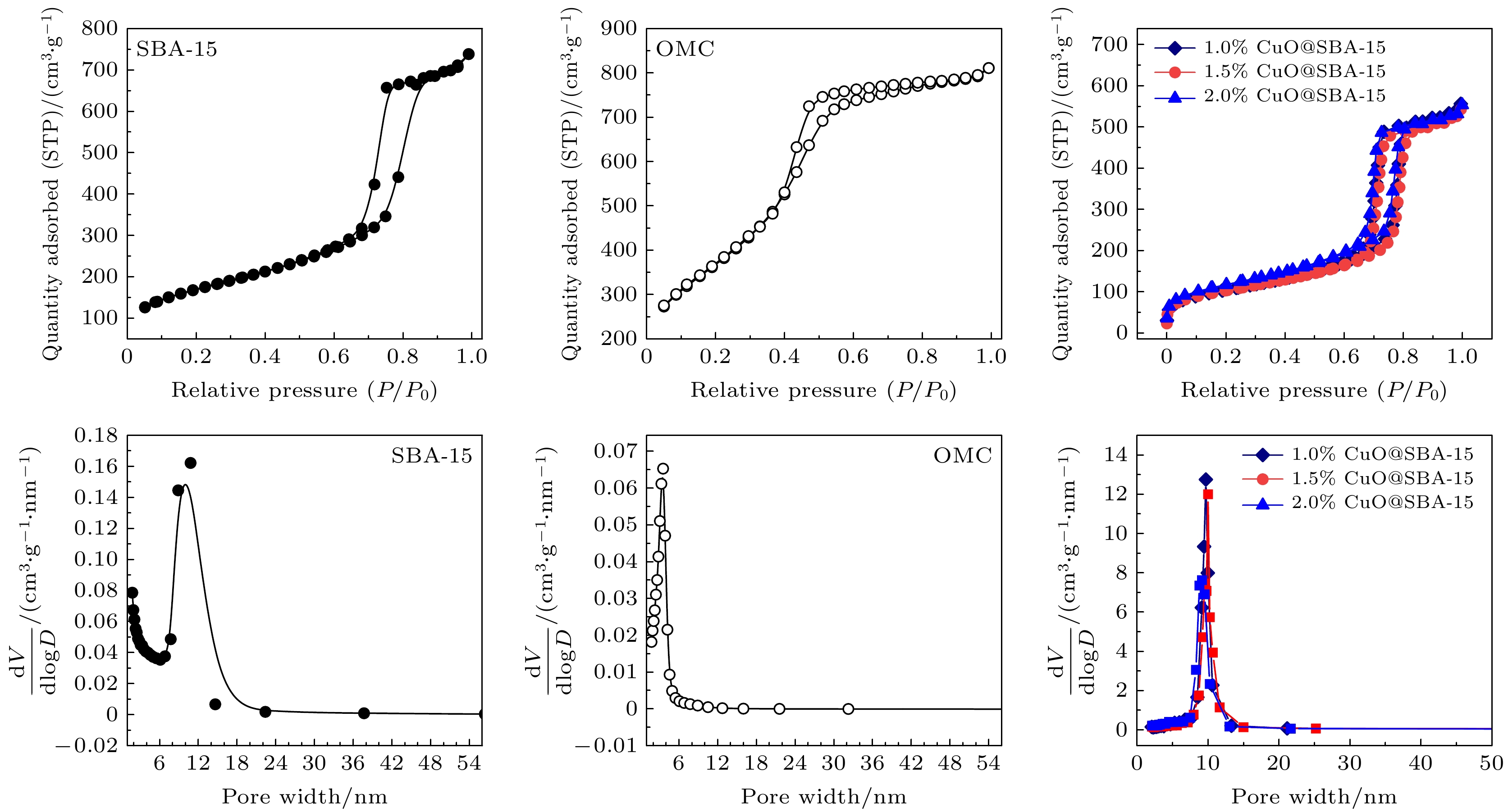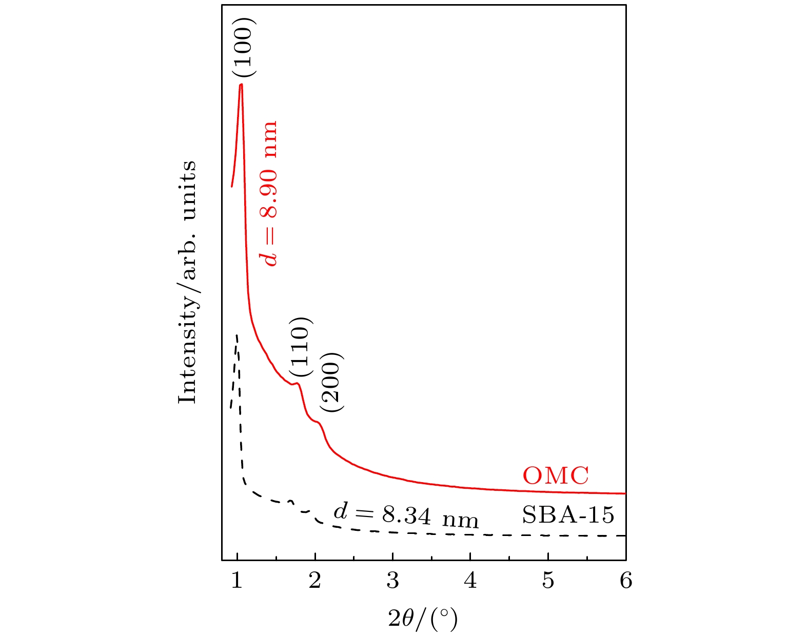 2adsorption-desorption measurements are conducted to verify the highly ordered pore structure and relatively high specific surface area of SBA-15 and OMC, and their average pore radius are about 7.5 nm and 3.3 nm, respectively. Positron lifetime spectrum of SBA-15 catalyst is composed of two longer lifetimes and two shorter lifetimes: two longer lifetimes