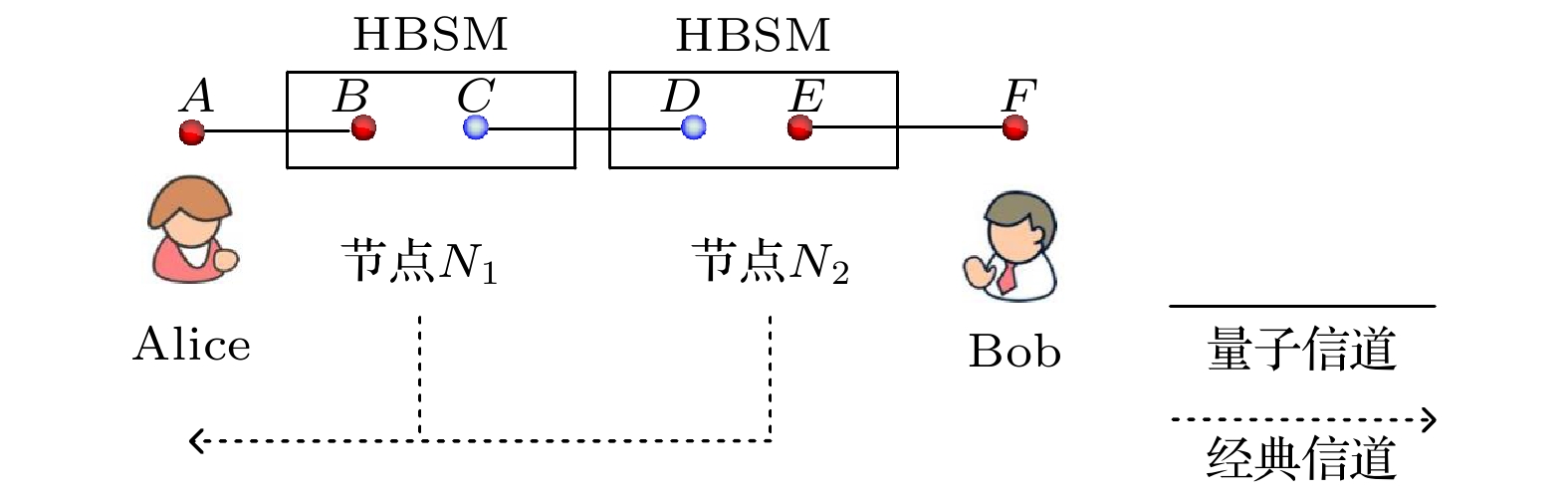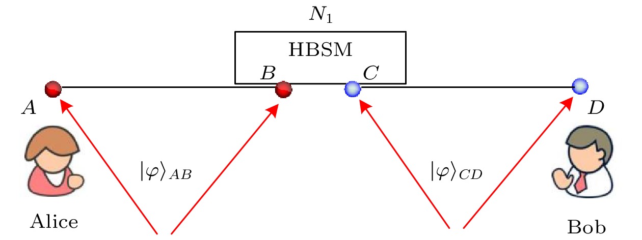 B和C的量子态 编码结果 A和D的量子态 Bob的幺正变换 $ \left| {{\phi ^{\text{ + }}}} \right\rangle _{P} \left| {{\phi ^{\text{ + }}}} \right\rangle _{S} $ 0000 $ \left| {{\phi ^{\text{ + }}}} \right\rangle _{P} \left| {{\phi ^{\text{ + }}}} \right\rangle _{S} $ $ {U_1} = \sigma _I^P \otimes \sigma _I^S $ $ \left| {{\phi ^{\text{ + }}}} \right\rangle _{P} \left| {{\phi ^ - }} \right\rangle _{S} $ 0001 $ \left| {{\phi ^{\text{ + }}}} \right\rangle _{P} \left| {{\phi ^ - }} \right\rangle _{S} $ $ {U_2} = \sigma _I^P \otimes \sigma _Z^S $ $ \left| {{\phi ^ - }} \right\rangle _{P} \left| {{\phi ^ + }} \right\rangle _{S} $ 0010 $ \left| {{\phi ^ - }} \right\rangle _{P} \left| {{\phi ^ + }} \right\rangle _{S} $ $ {U_3} = \sigma _Z^P \otimes \sigma _I^S $ $ \left| {{\phi ^ - }} \right\rangle _{P} \left| {{\phi ^ - }} \right\rangle _{S} $ 0011 $ \left| {{\phi ^ - }} \right\rangle _{P} \left| {{\phi ^ - }} \right\rangle _{S} $ $ {U_4} = \sigma _Z^P \otimes \sigma _Z^S $ $ \left| {{\psi ^{\text{ + }}}} \right\rangle _{P} \left| {{\phi ^{\text{ + }}}} \right\rangle _{S} $ 0100 $ \left| {{\psi ^{\text{ + }}}} \right\rangle _{P} \left| {{\phi ^{\text{ + }}}} \right\rangle _{S} $ $ {U_5} = \sigma _X^P \otimes \sigma _I^S $ $ \left| {{\psi ^{\text{ + }}}} \right\rangle _{P} \left| {{\phi ^ - }} \right\rangle _{S} $ 0101 $ \left| {{\psi ^{\text{ + }}}} \right\rangle _{P} \left| {{\phi ^ - }} \right\rangle _{S} $ $ {U_6} = \sigma _X^P \otimes \sigma _Z^S $ $ \left| {{\psi ^ - }} \right\rangle _{P} \left| {{\phi ^ + }} \right\rangle _{S} $ 0110 $ \left| {{\psi ^ - }} \right\rangle _{P} \left| {{\phi ^ + }} \right\rangle _{S} $ ${U_7} = - {{i}}\sigma _Y^P \otimes \sigma _I^S$ $ \left| {{\psi ^ - }} \right\rangle _{P} \left| {{\phi ^ - }} \right\rangle _{S} $ 0111 $ \left| {{\psi ^ - }} \right\rangle _{P} \left| {{\phi ^ - }} \right\rangle _{S} $ ${U_8} = - {{i}}\sigma _Y^P \otimes \sigma _Z^S$ $ \left| {{\phi ^{\text{ + }}}} \right\rangle _{p} \left| {{\psi ^{\text{ + }}}} \right\rangle _{S} $ 1000 $ \left| {{\phi ^{\text{ + }}}} \right\rangle _{p} \left| {{\psi ^{\text{ + }}}} \right\rangle _{S} $ $ {U_9} = \sigma _I^P \otimes \sigma _X^S $ $ \left| {{\phi ^{\text{ + }}}} \right\rangle _{p} \left| {{\psi ^ - }} \right\rangle _{S} $ 1001 $ \left| {{\phi ^{\text{ + }}}} \right\rangle _{p} \left| {{\psi ^ - }} \right\rangle _{S} $ ${U_{10} } = \sigma _I^P \otimes - {{i}}\sigma _Y^S$ $ \left| {{\phi ^ - }} \right\rangle _{p} \left| {{\psi ^ + }} \right\rangle _{S} $ 1010 $ \left| {{\phi ^ - }} \right\rangle _{p} \left| {{\psi ^ + }} \right\rangle _{S} $ $ {U_{11}} = \sigma _Z^P \otimes \sigma _X^S $ $ \left| {{\phi ^ - }} \right\rangle _{p} \left| {{\psi ^ - }} \right\rangle _{S} $ 1011 $ \left| {{\phi ^ - }} \right\rangle _{p} \left| {{\psi ^ - }} \right\rangle _{S} $ ${U_{12} } = \sigma _Z^P \otimes - {{i}}\sigma _Y^S$ $ \left| {{\psi ^ + }} \right\rangle _{P} \left| {{\psi ^ + }} \right\rangle _{S} $ 1100 $ \left| {{\psi ^ + }} \right\rangle _{P} \left| {{\psi ^ + }} \right\rangle _{S} $ $ {U_{13}} = \sigma _X^P \otimes \sigma _X^S $ $ \left| {{\psi ^ + }} \right\rangle _{P} \left| {{\psi ^ - }} \right\rangle _{S} $ 1101 $ \left| {{\psi ^ + }} \right\rangle _{P} \left| {{\psi ^ - }} \right\rangle _{S} $ ${U_{14} } = \sigma _X^P \otimes - {{i}}\sigma _Y^S$ $ \left| {{\psi ^ - }} \right\rangle _{P} \left| {{\psi ^ + }} \right\rangle _{S} $ 1110 $ \left| {{\psi ^ - }} \right\rangle _{P} \left| {{\psi ^ + }} \right\rangle _{S} $ ${U_{15} } = - {{i}}\sigma _Y^P \otimes \sigma _X^S$ $ \left| {{\psi ^ - }} \right\rangle _{P} \left| {{\psi ^ - }} \right\rangle _{S} $ 1111 $ \left| {{\psi ^ - }} \right\rangle _{P} \left| {{\psi ^ - }} \right\rangle _{S} $ ${U_{16} } = - {{i}}\sigma _Y^P \otimes - {\rm{i} }\sigma _Y^S$ N1,N2, ···NN– 1测量结果 Alice的幺正变换 $ \overline { \oplus _{i = 1}^{N - 1}{\text{MN}}_P^{i1}} \cdot \overline { \oplus _{i = 1}^{N - 1}{\text{MN}}_P^{i2}} \otimes \overline { \oplus _{i = 1}^{N - 1}{\text{MN}}_S^{i1}} \cdot \overline { \oplus _{i = 1}^{N - 1}{\text{MN}}_S^{i2}} = 1 $ $ {U_1} = \sigma _I^P \otimes \sigma _I^S $ $ \overline { \oplus _{i = 1}^{N - 1}{\text{MN}}_P^{i1}} \cdot \overline { \oplus _{i = 1}^{N - 1}{\text{MN}}_P^{i2}} \otimes \overline { \oplus _{i = 1}^{N - 1}{\text{MN}}_S^{i1}} \cdot \oplus _{i = 1}^{N - 1}{\text{MN}}_S^{i2} = 1 $ $ {U_2} = \sigma _I^P \otimes \sigma _Z^S $ $ \overline { \oplus _{i = 1}^{N - 1}{\text{MN}}_P^{i1}} \cdot \overline { \oplus _{i = 1}^{N - 1}{\text{MN}}_P^{i2}} \otimes \oplus _{i = 1}^{N - 1}{\text{MN}}_S^{i1} \cdot \overline { \oplus _{i = 1}^{N - 1}{\text{MN}}_S^{i2}} = 1 $ $ {U_3} = \sigma _I^P \otimes \sigma _X^S $ $ \overline { \oplus _{i = 1}^{N - 1}{\text{MN}}_P^{i1}} \cdot \overline { \oplus _{i = 1}^{N - 1}{\text{MN}}_P^{i2}} \otimes \oplus _{i = 1}^{N - 1}{\text{MN}}_S^{i1} \cdot \oplus _{i = 1}^{N - 1}{\text{MN}}_S^{i2} = 1 $ $ {U_4} = \sigma _I^P \otimes - i\sigma _Y^S $ $ \overline { \oplus _{i = 1}^{N - 1}{\text{MN}}_P^{i1}} \cdot \oplus _{i = 1}^{N - 1}{\text{MN}}_P^{i2} \otimes \overline { \oplus _{i = 1}^{N - 1}{\text{MN}}_S^{i1}} \cdot \overline { \oplus _{i = 1}^{N - 1}{\text{MN}}_S^{i2}} = 1 $ $ {U_5} = \sigma _I^P \otimes \sigma _I^S $ $ \overline { \oplus _{i = 1}^{N - 1}{\text{MN}}_P^{i1}} \cdot \oplus _{i = 1}^{N - 1}{\text{MN}}_P^{i2} \otimes \overline { \oplus _{i = 1}^{N - 1}{\text{MN}}_S^{i1}} \cdot \oplus _{i = 1}^{N - 1}{\text{MN}}_S^{i2} = 1 $ $ {U_6} = \sigma _Z^P \otimes \sigma _Z^S $ $ \overline { \oplus _{i = 1}^{N - 1}{\text{MN}}_P^{i1}} \cdot \oplus _{i = 1}^{N - 1}{\text{MN}}_P^{i2} \otimes \oplus _{i = 1}^{N - 1}{\text{MN}}_S^{i1} \cdot \overline { \oplus _{i = 1}^{N - 1}{\text{MN}}_S^{i2}} = 1 $ $ {U_7} = \sigma _Z^P \otimes \sigma _X^S $ $ \overline { \oplus _{i = 1}^{N - 1}{\text{MN}}_P^{i1}} \cdot \oplus _{i = 1}^{N - 1}{\text{MN}}_P^{i2} \otimes \oplus _{i = 1}^{N - 1}{\text{MN}}_S^{i1} \cdot \oplus _{i = 1}^{N - 1}{\text{MN}}_S^{i2} = 1 $ $ {U_8} = \sigma _Z^P \otimes - i