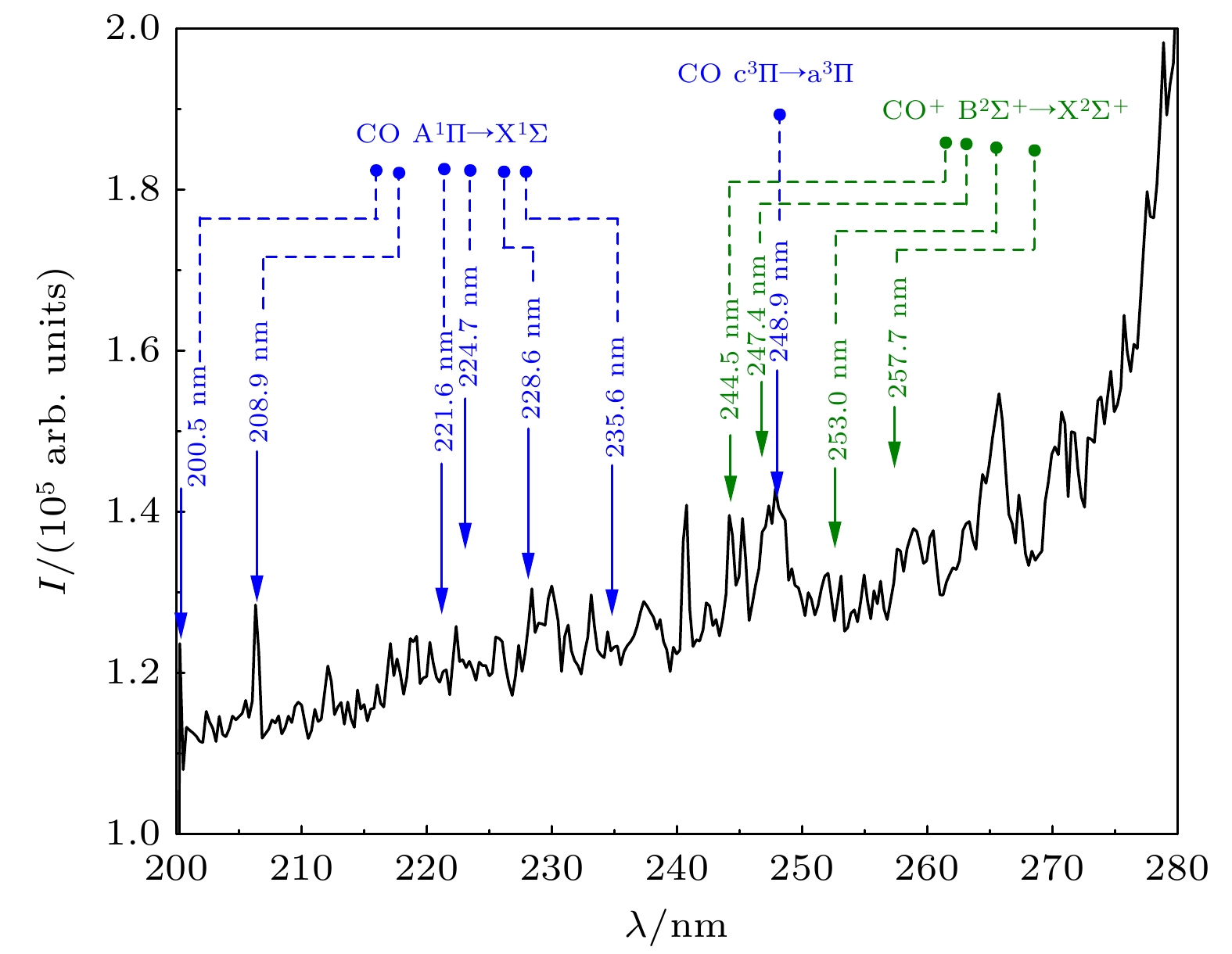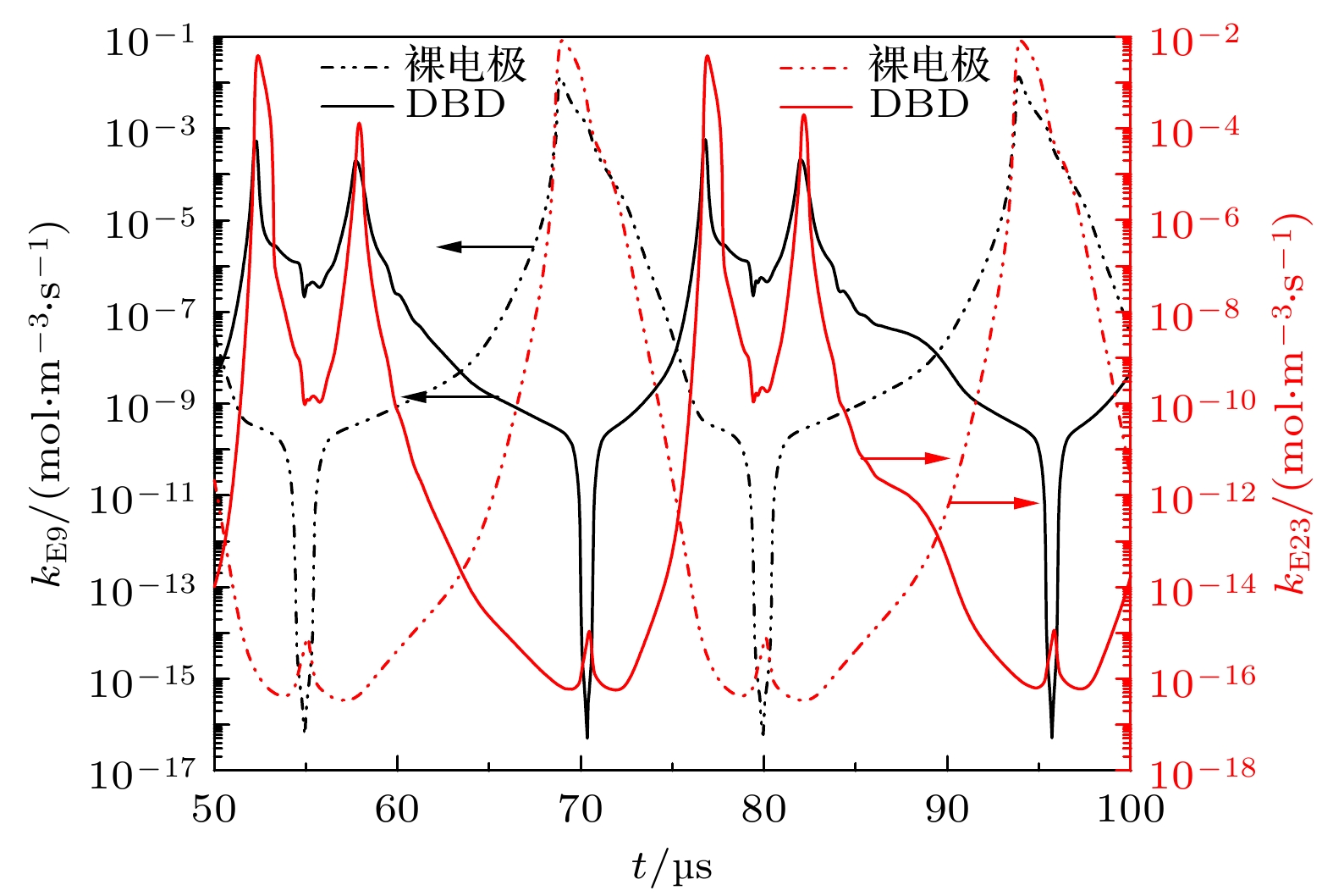 中性粒子 CO2, CO, O, C, O2 离子 CO${}^+_2 $, O–, O${}^+_2 $, O${}^-_2 $, CO${}^-_3 $ 激发态粒子 CO2e, CO2v1, CO2v2, CO2v3, CO2v4 基态 模型中的符号 对应振动态 CO2 CO2v1 (010) CO2v2 (100), (020) CO2v3 (001) CO2v4 (n00), (0n0) 放电参数和产物 裸电极 DBD 功率/W 1.0 0.06 电子密度/m–3 1.1 × 1016 3.6 × 1015 振动态密度和/m–3 1.0 × 1021 3.1 × 1019 CO密度/m–3 2.2 × 1017 7.0 × 1015 O2密度/m–3 8.8 × 1016 2.7 × 1015 O密度/m–3 4.2 × 1016 1.5 × 1015 C密度/m–3 3.5 × 1015 6.3 × 1014 序号 反应 速率系数 参考文献 E22 e + CO${}_2^+ $ → CO + O 2.0 × 10–11Te–0.5/Tg [35] E23 e + CO${}_2^+ $ → C + O2 3.94 × 10–13Te–0.4 [36] E24 e + O${}_2^+ $ → O + O 6.0 × 10–13Te–0.5Tg–0.5 [35] E25 e + O2+ M → M + O${}_2^- $ 3.0 × 10–42(M = CO2) [37] 2.0 × 10–42(M = CO, O2) E26 e + O + M → M + O– 1.0 × 10–43 [37] E27 e + O${}_2^+ $ + M → M + O2 1.0 × 10–38 [31,38] 序号 反应 速率系数 参考文献 I1 O–+ CO2+M→ CO${}_3^- $ +M 9.0 × 10–41(M= CO2) [35,39] 3.0 × 10–40(M= CO, O2) I2 O–+ CO → CO2+ e 5.5 × 10–16 [36] I3 CO${}_3^- $ + CO → CO2+ CO2+ e 5.0 × 10–19 [35] I4 O–+M→ O +M+ e 4.0 × 10–18 [39] I5 O–+ O → O2+ e 2.3 × 10–16 [40] I6 O${}_2^- $ + CO${}_2^+ $ → CO + O2+ O 6.0 × 10–13 [35] I7 O + CO${}_2^+ $ → CO + O${}_2^+ $ 1.64 × 10–16 [31,41] I8 O2+ CO${}_2^+ $ → CO2+ O${}_2^+ $ 5.3 × 10–17 [31,41] I9 CO${}_3^- $ + CO${}_2^+ $ → CO2+ CO2+ O 5.0 × 10–13 [35] I10 CO${}_3^- $ + O${}_2^+ $ → CO2+ O2+ O 3.0 × 10–13 [35] I11 CO${}_3^- $ + O → CO2+ O${}_2^- $ 8.0 × 10–17 [35] I12 O${}_2^- $ + O${}_2^+ $ → O2+ O2 2.0 × 10–13 [40] I13 O${}_2^- $ + O${}_2^+ $ → O + O + O2 4.2 × 10–13 [35] I14 O${}_2^- $ + O${}_2^+ $ +M→ O2+ O2+M 2.0 × 10–37 [38] I15 O–+ O${}_2^+ $ → O + O2 1.0 × 10–13 [35] I16 O–+ O${}_2^+ $ → O + O + O 2.6 × 10–14 [40] I17 O${}_2^- $ + O → O–+ O2 3.3 × 10–16 [38] I18 O${}_2^- $ + O2→ O2+ O2+e 2.18 × 10–24 [38] I19 O${}_2^- $ +M→ O2+M+e 2.7 × 10–16(Tg/300)0.5exp(–5590/Tg) [36] 序号 反应 速率系数 α 参考文献 N1 CO2+M→ CO + O +M 3.91 × 10–16exp(–49430/Tg) 0.8 [31] N2 CO2+ O → CO + O2 2.8 × 10–17exp(–26500/Tg) 0.5 [31,36] N3 CO2+ C→ CO + CO 1.0 × 10–21 — [39] N4 O + CO +M→ CO2+M 1.6 × 10–45exp(–1510/Tg) (M=CO2) [37] 8.2 × 10–46exp(–1510/Tg) (M=CO, O2) N5 O + C +M→ CO +M 2.14 × 10–41(Tg/300)–3.08exp(–2114/Tg) [36] N6 O + O +M→ O2+M 1.27 × 10–44(Tg/300)–1exp(–170/Tg) [42] N7 O2+ CO → CO2+ O 4.2 × 10–18exp(–24000/Tg) [36] N8 O2+ C → CO + O 3.0 × 10–17 [37] 序号 反应 速率系数 参考文献 V1 CO2v1 + CO2→ CO2+ CO2 7.14 × 10–14exp(–177Tg–1/3+451Tg–2/3) [43] V2 CO2v1 + CO → CO + CO2 0.7 × 7.14 × 10–14exp(–177Tg–1/3+451Tg–2/3) [43] V3 CO2v1 + O2→ O2+ CO2 0.7 × 7.14 × 10–14exp(–177Tg–1/3+451Tg–2/3) [43] V4 CO2v2 + CO2→ CO2+ CO2 1.071 × 10–15exp(–137Tg–1/3) [43] V5 CO2v2 + CO → CO + CO2 3.1 × 1.071 × 10–15exp(–137Tg–1/3) [43] V6 CO2v2 + O2→ O2+ CO2 3.1 × 1.071 × 10–15exp(–137Tg–1/3) [43] V7 CO2v2 + CO2→ CO2+ CO2v1 1.942 × 10–13exp(–177Tg–1/3+451Tg–2/3) [43] V8 CO2v2 + CO → CO + CO2v1 0.7 × 1.942 × 10–13exp(–177Tg–1/3+451Tg–2/3) [43] V9 CO2v2 + O2→ O2+ CO2v1 0.7 × 1.942 × 10–13exp(–177Tg–1/3+451Tg–2/3) [43] V10 CO2v3 + CO2→ CO2+ CO2v2 8.57 × 10–7exp(–404Tg–1/3+1096Tg–2/3) [43] V11 CO2v3 + CO → CO + CO2v2 0.3 × 8.57 × 10–7exp(–404Tg–1/3+1096Tg–2/3) [43] V12 CO2v3 + O2→ O2+ CO2v2 0.4 × 8.57 × 10–7exp(–404Tg–1/3+1096Tg–2/3) [43] V13 CO2v3 + CO2→ CO2+ CO2v4 1.431 × 10–11exp(–252Tg–1/3+685Tg–2/3) [43] V14 CO2v3 + CO → CO + CO2v4 0.3 × 1.431 × 10–11exp(–252Tg–1/3+685Tg–2/3) [43] V15 CO2v3 + O2→ O2+ CO2v4 0.4 × 1.431 × 10–11exp(–252Tg–1/3+685Tg–2/3) [43] V16 CO2v3 + CO2→ CO2v1 + CO2v2 1.06 × 10–11exp(–242Tg–1/3+633Tg–2/3) [43] V17 CO2v3 + CO2→ CO2+ CO2v1 4.25 × 10–7exp(–407Tg–1/3+824Tg–2/3) [43] V18 CO2v3 + CO → CO + CO2v1 0.3 × 4.25 × 10–7exp(–407Tg–1/3+824Tg–2/3) [43] V19 CO2v3 + O2→ O2+ CO2v1 0.4 × 4.25 × 10–7exp(–407Tg–1/3+824Tg–2/3) [43] V20 CO2v4 + CO2→ CO2+ CO2v2 2.897 × 10–13exp(–177Tg–1/3+451Tg–2/3) [43] V21 CO2v4 + CO → CO + CO2v2 0.7 × 2.897 × 10–13exp(–177Tg–1/3+451Tg–2/3) [43] V22 CO2v4 + O2→ O2+ CO2v2 0.7 × 2.897 × 10–13exp(–177Tg–1/3+451Tg–2/3) [43] V23 CO2v4 + CO2→ CO2+ CO2v1 1.071 × 10–15exp(–137Tg–1/3) [43] V24 CO2v4 + CO → CO + CO2v1 3.1 × 1.071 × 10–15exp(–137Tg–1/3) [43] V25 CO2v4 + O2→ O2+ CO2v1 3.1 × 1.071 × 10–15exp(–137Tg–1/3) [43] 序号 反应 速率系数 参考文献 E1 e + CO2→ e + CO2 f(σ) [32] E2 e + CO2vi→ e + CO2vi f(σ) [32] E3 e + CO2→ 2e + CO${}_2^+ $ f(σ) [32] E4 e + CO2vi→ 2e + CO${}_2^+ $ f(σ) [32] E5 e + CO2→ e + CO2e f(σ) [32] E6 e + CO2vi→ e + CO2e f(σ) [32] E7 e + CO2→ e + O + CO f(σ) [32] E8 e + CO2vi→ e + O + CO f(σ) [32] E9 e + CO2→ O–+ CO f(σ) [32] E10 e + CO2vi→ O–+ CO f(σ) [32] E11 e + CO2→ e + CO2v1 f(σ) [32] E12 e + CO2→ e + CO2v2 f(σ) [32] E13 e + CO2→ e + CO2v3 f(σ) [32] E14 e + CO2→ e + CO2v4 f(σ) [32] E15 e + CO → e + CO f(σ) [33] E16 e + CO → e + C + O f(σ) [33] E17 e + CO → C + O– f(σ) [33] E18 e + O2→ e + O2 f(σ) [34] E19 e + O2→ e + O + O f(σ) [34] E20 e + O2→ O + O– f(σ) [34] E21 e + O2→ 2e + O${}_2^+ $ f(σ) [34] 波长/nm 振动能级(ν'→ν'') Δν 200.5 1→8 7 208.9 5→12 7 221.6 3→12 9 224.7 8→16 8 228.6 6→15 9 235.6 5→15 10 波长/nm 振动能级(ν'→ν'') Δν 244.5 1→3 2 247.4 2→4 2 253.0 4→6 2 257.7 1→4 3 波长/nm 振动能级(ν'→ν'') Δν 283 0→0 0 297 0→1 1 313 0→2 2 波长/nm 振动能级(ν'→ν'') Δν 451 0→0 0 483 0→1 1 520 0→2 2 561 0→3 3 608 0→4 4 -