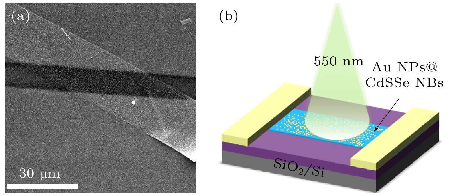 dratio, responsivity, external quantum efficiency and detectivity of the device are increased by 5.4, 11.8, 11.8 and 10.6 times, respectively, and the rise time and fall time are both reduced to half of counterparts of single CdSSe nanobelt. Finally, the microscopic physical mechanism of the enhanced optoelectronic performance of the device is explained based on localized surface plasmon resonance of Au nanoislands. After the combination of gold nanoislands and CdSSe nanobelt, the difference in Fermi level between them results in the transfer of electrons from CdSSe nanobelt to Au nanoislands, thus forming an internal electric field at the interface, which is directed from CdSSe nanobelt to Au nanoislands. Under illumination, the electrons in the Au nanoislands acquire enough energy to jump over the Schottky barrier because of localized surface plasmon resonance. These photoexcited hot electrons are trapped and stored in extra energy levels above the conduction band minimum, and then are cooled down to the band edge, thus realizing the transfer of electrons from Au nanoislands to CdSSe nanobelt. Moreover, the internal electric field also greatly promotes the transfer of hot electrons from Au nanoislands to CdSSe nanobelt, and inhibits the recombination of carriers at the interface, resulting in large photocurrent. Our work provides an effective strategy for fabricating high-performance photodetectors without increasing the device area.