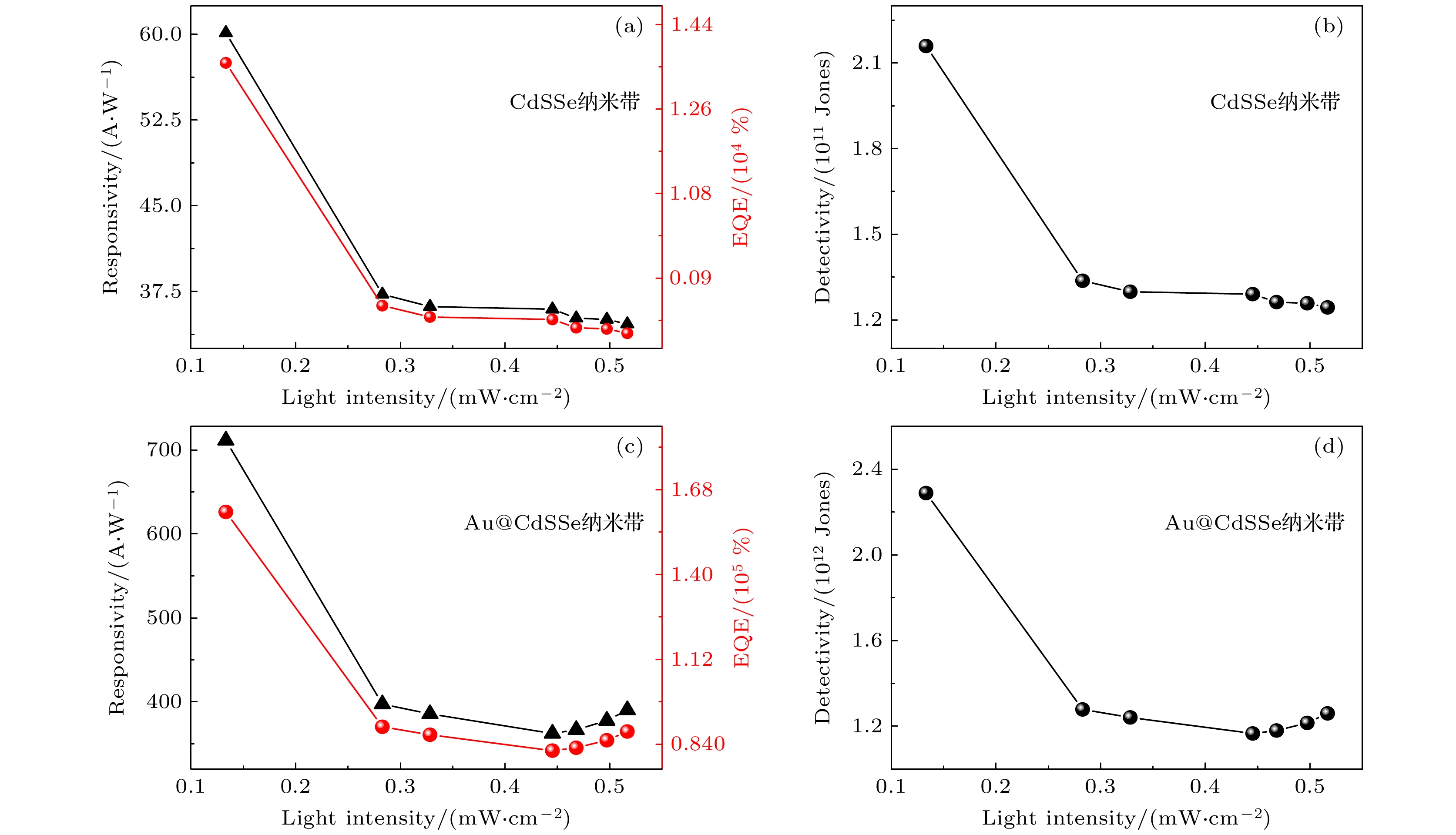 11Jones. Its rise time and fall time are about 41.1/41.5 ms, respectively. Secondly, after the CdSSe nanobelt is decorated by Au nanoislands, the optoelectronic performance of the device is significantly improved. Under 550 nm illumination and 1 V bias, the