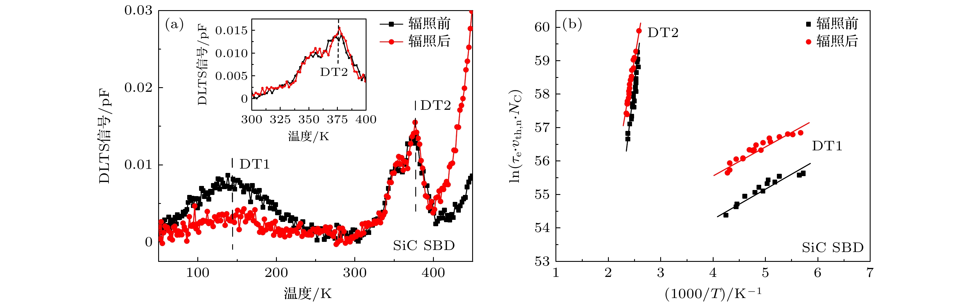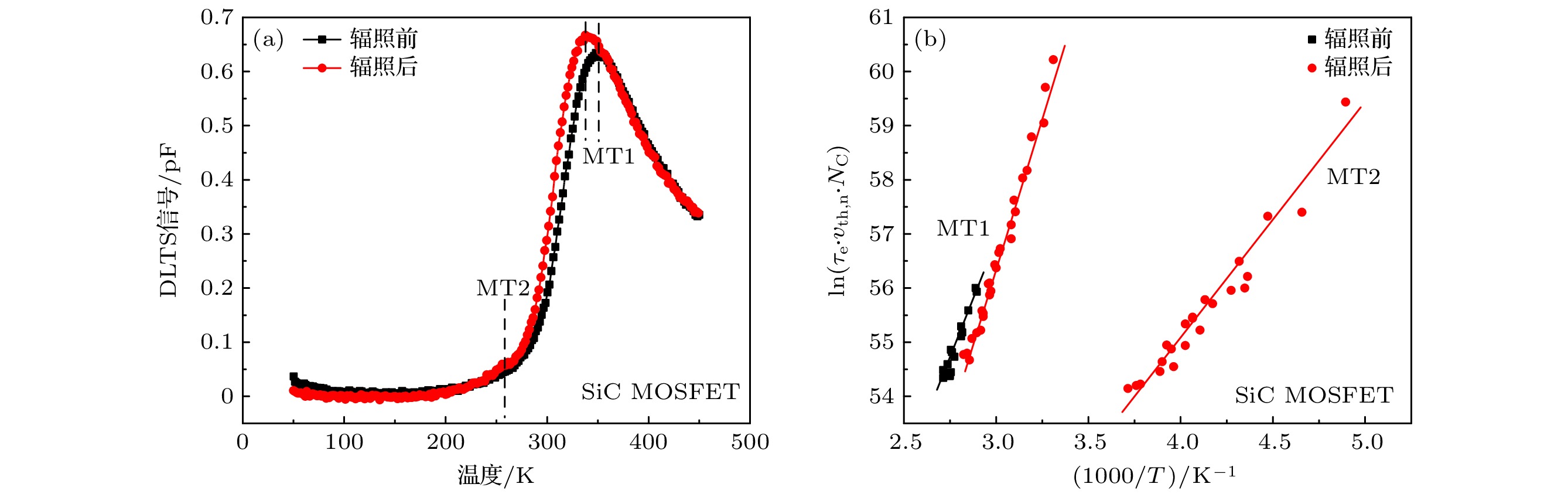 \begin{document}$ E_{\rm{C}} - 1.034 $\end{document} eV is observed after irradiation by deep level transient spectroscopy (DLTS) testing, which is corresponding to the neutron-induced defect cluster in SiC. This deep level defect may cause the Fermi level of n-type doping drift region to move toward the mid-gap level. It ultimately results in the decrease of the Schottky barrier and the increase of the reverse leakage current. In addition, neutron-induced gate leakage increase is also observed for SiC MOSFET. The gate current corresponding to Vgs = 15 V after irradiation increases nearly 3.3 times that before irradiation. The donor-type defects introduced by neutron irradiation in the oxide layer result in the difference in the conductivity mechanism of gate oxygen between before and after irradiation. The defects have an auxiliary effect on carrier crossing the gate oxide barrier, which leads to the increase of gate leakage current. The defects introduced by neutron irradiation are neutral after capturing electrons. The trapped electrons can cross a lower potential well and enter the conduction band to participate in conduction when the gate is positively biased, thus causing the gate current to increase with the electric field increasing. After electrons captured by donor-type defects enter the conduction band, positively charged defects are left from the gate oxide, leading to the negative shift of the transfer characteristics of SiC MOSFET. The results of DLTS testing indicate that the neutron irradiation can not only cause the intrinsic defect state of SiC material to change near the channel of MOSFET, but also give rise to new silicon vacancy defects. However, these defects are not the main cause of device performance degradation due to their low density relative to the intrinsic defect’s."> - 必威体育下载