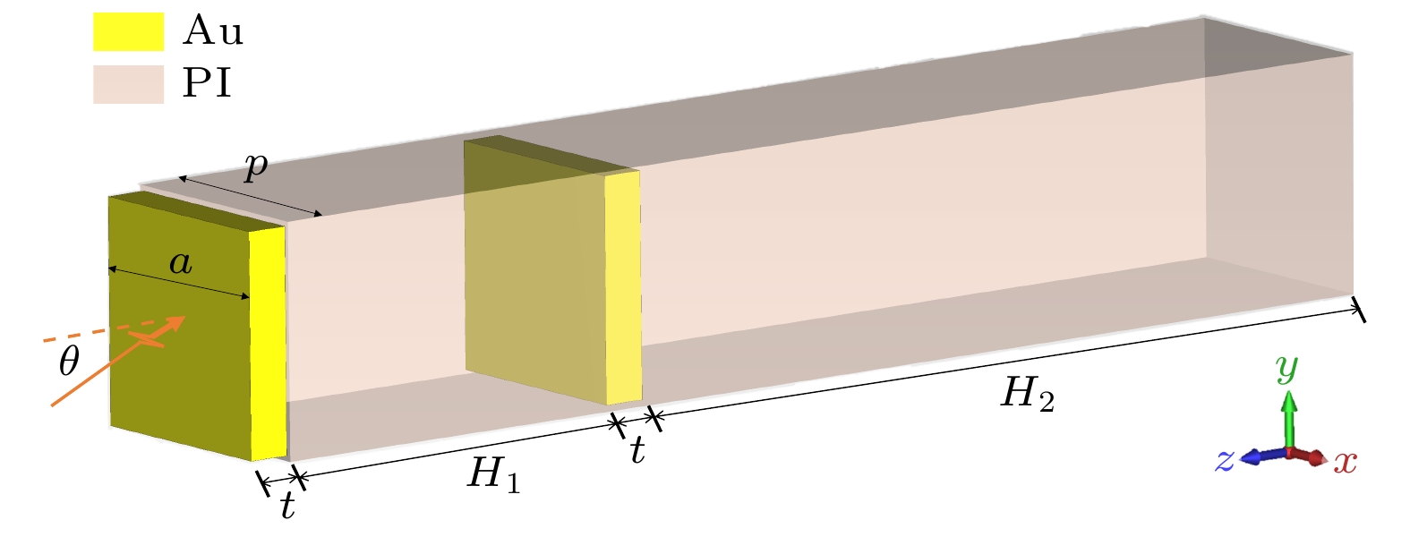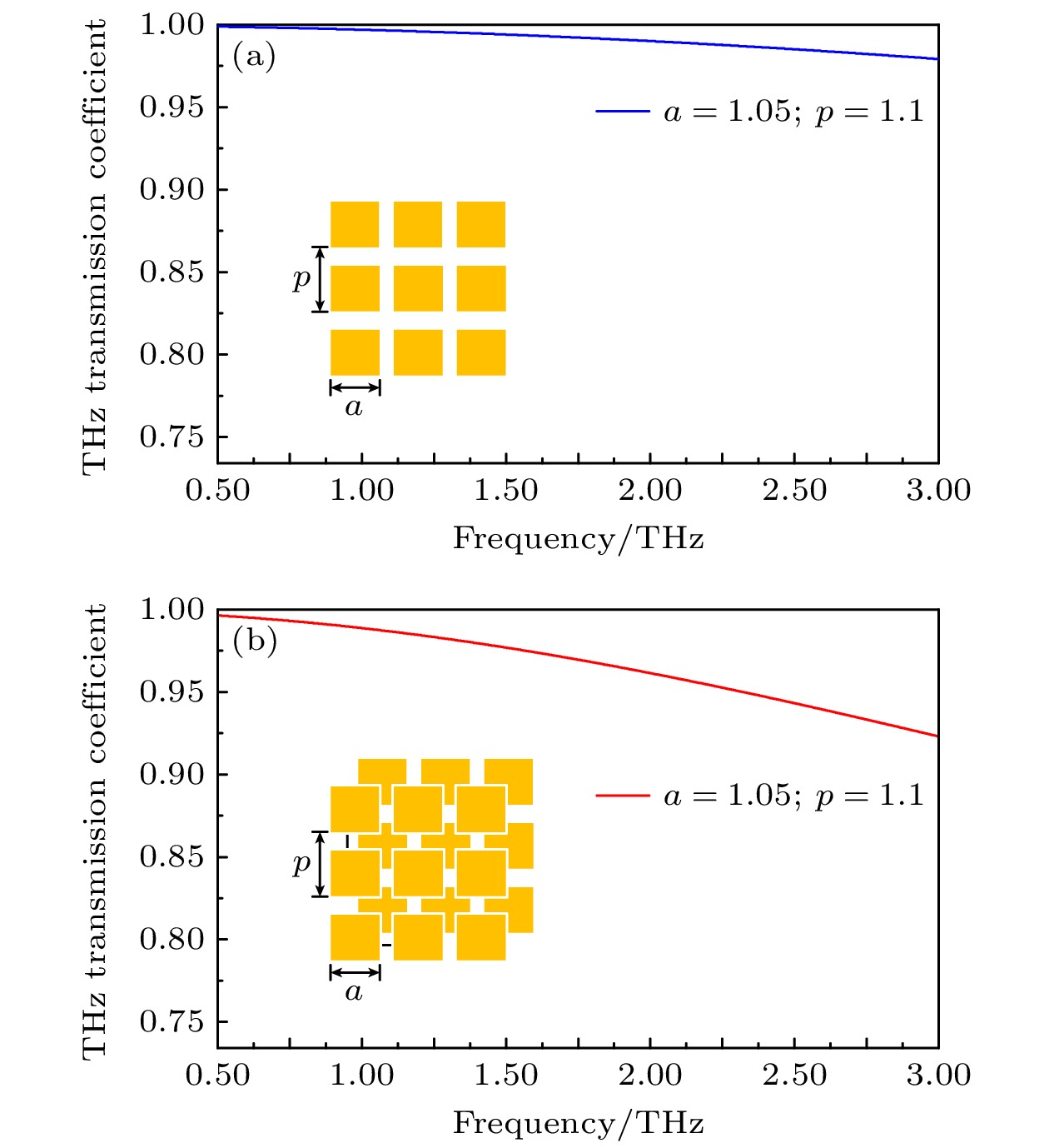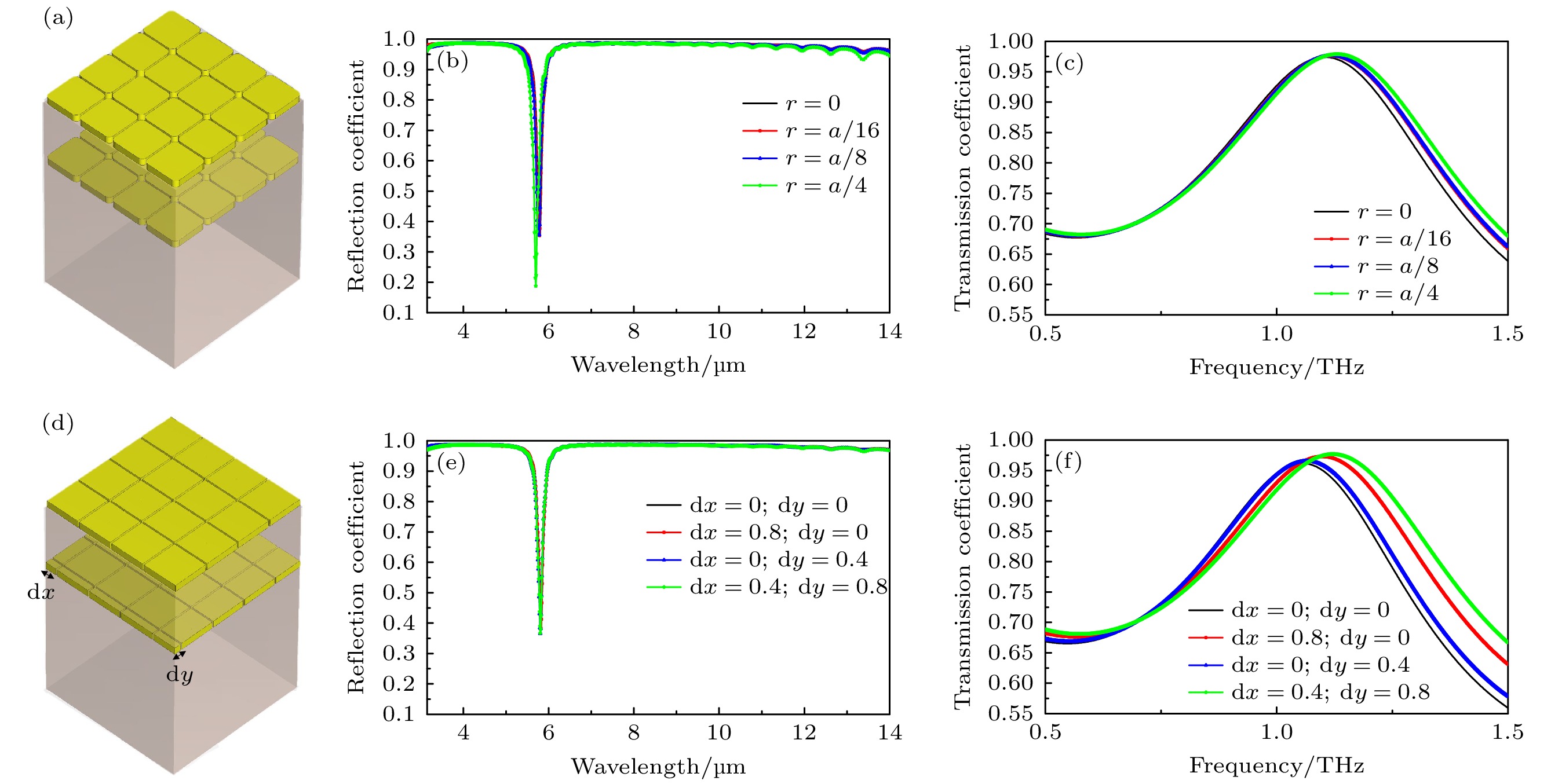 The multi-mode composite imaging technology integrates the advantages of different sensors, and thus has the advantages of high image quality, strong information acquisition capability, high target detection and recognition ability, strong adaptability to complex environments, and high stability and robustness of the system. Among them, the terahertz and infrared composite imaging technology combines the characteristics of terahertz band and infrared band, has the advantages of wide spectrum coverage, high resolution and strong penetration, and has broad application prospects. As one of the key components of the common aperture composite imaging system, the efficient optical splitters in terahertz and infrared band are still lacking at present, and their performance needs to be improved urgently. In this paper, a kind of dichroic metasurface with a simple structure and high performance is proposed by combining simulation experiment and theoretical explanation. When used as a spectroscopic device at an incident angle of 45°, it achieves a transmission coefficient greater than 97% near the center frequency of 1.1 THz, and a reflection coefficient greater than 98% in a wavelength range of 3–5 μm for medium-wave infrared and 8–14 μm for long-wave infrared. The design has good robustness to structural mismatches and machining errors such as structural misalignment, structural fillet, small magnification scaling, and polarization insensitivity. When the incident angle changes in a range of 0–60°, the device still maintains excellent spectral characteristics. In this paper, based on Babinet theorem and equivalent circuit model, the electromagnetic response characteristics of the metasurface are analyzed theoretically, and the analysis results are in agreement with the simulation results. The results of this study prove the feasibility of metasurface as a spectral device in the multiwavelength composite imaging system of terahertz and infrared bands, and provide support for future studying new composite imaging detection technology. In addition, the metasurface structure described in this paper has broad application prospects in many fields such as multi-band infrared stealth, laser and pump light separation in lasers, and provides a valuable reference for designing terahertz and infrared spectroscopy in various scenarios. In the following figure, for S wave and P wave at an incident angle of 45°, panel (a) shows the reflection coefficients varying with the wavelength of metasurface and panel (b) displays terahertz transmission coefficient changing with frequency.