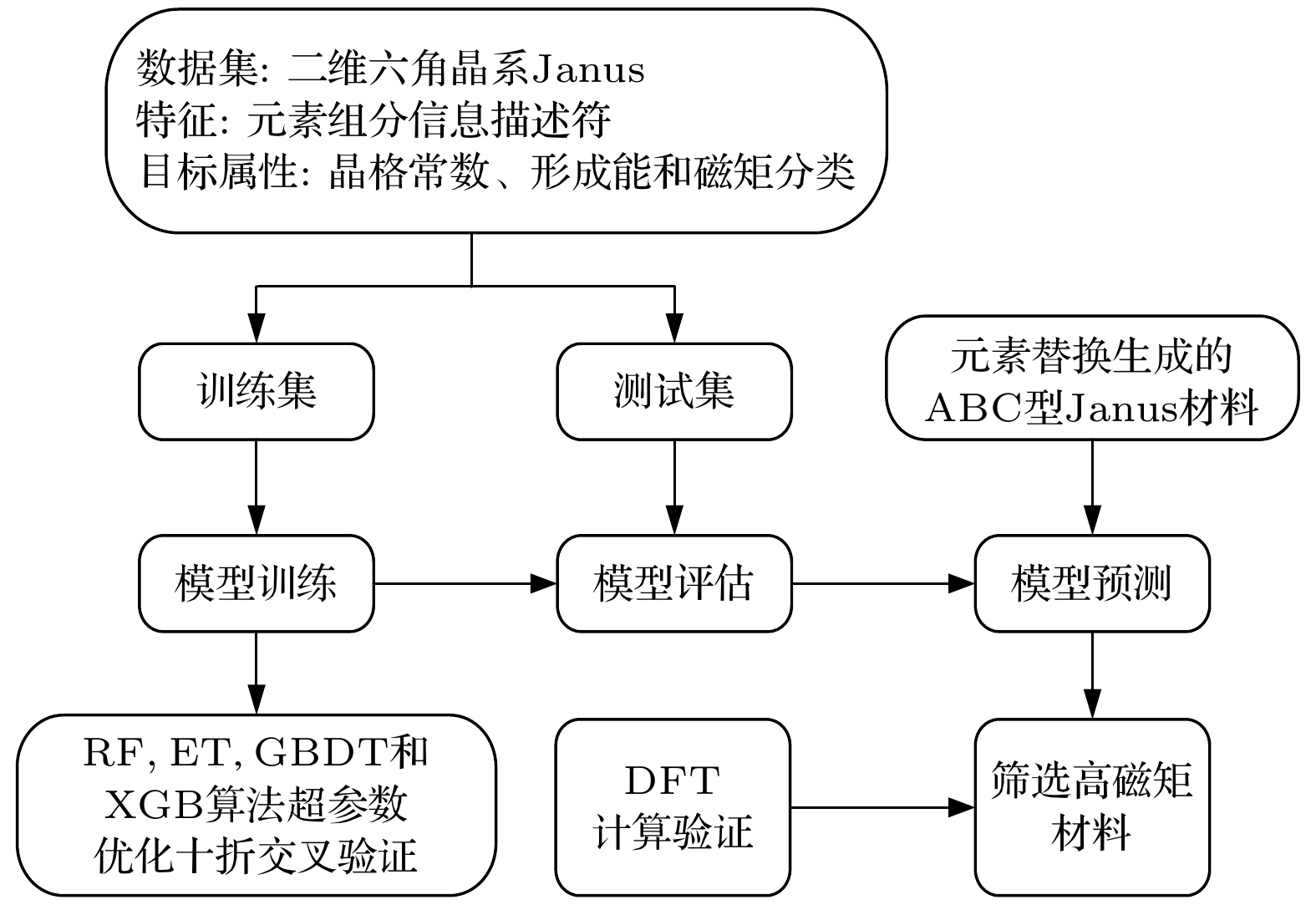 subsample = 0.8, colsample_bytree = 0.49613519模型 Lattice a = b Lattice c MAE RMSE $R^2$ MAE RMSE $R^2$ RF 0.5485 0.8104 0.7375 0.6491 1.0001 0.6872 GBDT 0.4477 0.7350 0.7829 0.6679 0.9924 0.6923 XGB 0.5427 0.7968 0.7462 0.5953 0.9474 0.7186 ET 0.3469 0.6808 0.8137 0.6534 1.0103 0.6817 模型 MAE RMSE $R^2$ RF 0.1054 0.1697 0.8671 GBDT 0.0798 0.1411 0.9070 XGB 0.0959 0.1533 0.8930 ET 0.1120 0.1701 0.8657 模型 Accuracy Precision Recall F1 score RF 0.8770 0.8459 0.7636 0.7862 GBDT 0.8948 0.8498 0.8182 0.8263 XGB 0.8762 0.8398 0.7697 0.7883 ET 0.8795 0.8392 0.7778 0.7965 Formula Lattice constants Formation energy/eV $ |\mu| / \mu_{\mathrm{B}} $ a = b/Å c/Å A B C ErFeTb 3.35 18.25 –2.02 2.51 3.03 6.24 FeNO 2.92 15.00 –11.87 1.17 0.08 0.47 HoRuSr 4.90 18.79 –6.66 3.79 0.02 0.05 DyOsSr 4.18 18.87 –6.89 4.89 0 0.13 EuSbSr 5.43 18.69 –5.53 6.85 0.01 0.05 HoIrSr 4.58 18.79 –7.24 3.72 0 0.05 LiUZn 2.89 18.13 –0.44 0 1.65 0.01 PuSZn 4.52 18.13 –6.75 5.61 0.10 0.01 GdKU 7.46 18.13 –2.39 7.33 0 2.96 LuNbTi 3.02 18.13 –1.76 0.02 0.28 1.67 GdHfSe 5.03 18.93 –8.46 7.33 0.34 0.02 NaTbZn 4.65 18.69 –1.87 0.02 6.00 0 HoNpSr 3.69 18.46 –1.80 3.81 4.38 0.08 -