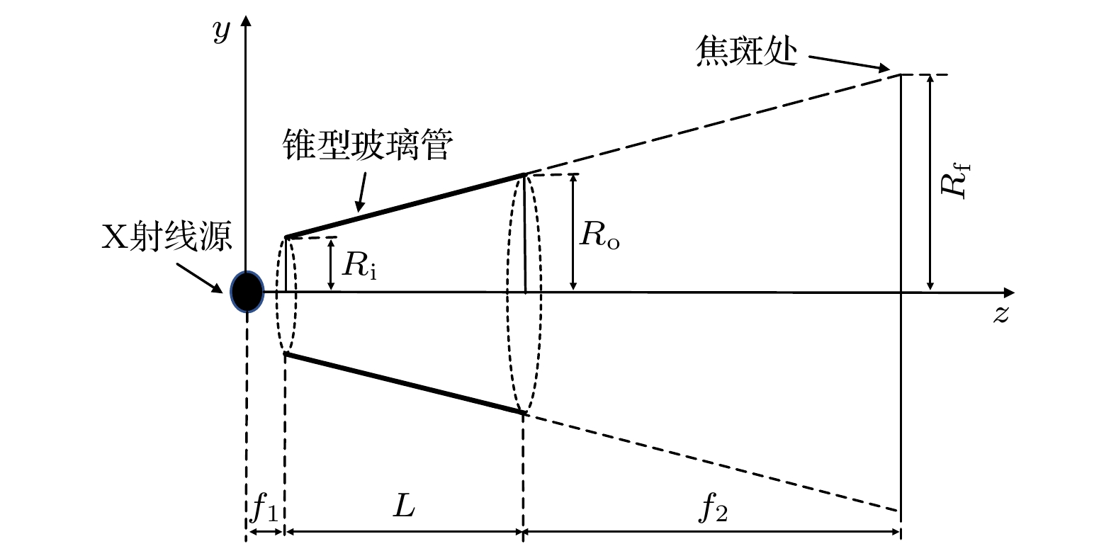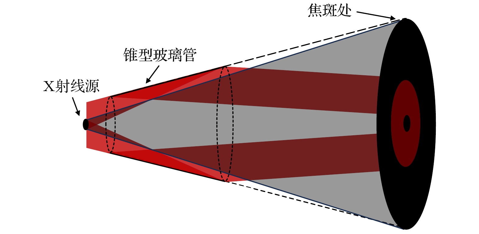In high-energy density physics (HEDP) experiments, accurate diagnostics of physical parameters such as electron temperature, plasma density, and ionization state are essential for understanding matter behavior under extreme conditions. In these cases, X-ray spectroscopic technique, especially those using crystal spectrometers, is widely used to achieve high spectral resolution. However, a common challenge in such experiments lies in the inherent low brightness and poor spatial coherence of laboratory-based X-ray sources, which limit photon throughput, thus the diagnostic accuracy. Therefore, improving the X-ray optical transmission efficiency between the source and the detector is a key step to improve the performance of the whole system. Capillary X-ray optics, which function based on the principle of total internal reflection within hollow glass structures, provides a promising avenue for beam shaping, collimation, and focusing in the soft-to-hard X-ray range. These optical devices are usually divided into polycapillary type and monocapillary type. While polycapillary optics are composed of numerous micro-channels and used primarily for collimating or focusing divergent X-rays, monocapillary lenses—consisting of single curved channels—provide more precise beam control and are particularly suitable for customized X-ray pathways. Depending on the curvature of the inner reflective surface, monocapillaries are classified into conical, parabolic, and ellipsoidal geometries. In this study, we propose and analyze a novel design of a large-caliber conical glass tube, specifically tailored to address the issue of low light utilization in multi-channel focusing spectrographs with spatial resolution (FSSR). The proposed conical glass tube is made of a single large-diameter capillary structure, simplifying alignment requirements and reducing the surface manufacturing precision typically required by complex aspheric lenses. Its geometric configuration enables X-rays from extended or weak sources to be redirected and controlled to convergef, thereby improving photon collection without significantly altering beam divergence. To quantify the performance of this optical system, we develop a detailed mathematical ray-tracing model and implement it in MATLAB. The model combines physical parameters such as capillary inner diameter, taper angle, reflection loss, and source-detector geometry. Numerical simulations show that compared with traditional flat or slit based systems, the new conical design improves source utilization efficiency by 3.1 times. Furthermore, the lens exhibits a ring-shaped enhancement region in the output intensity profile, which can be regulated by adjusting the capillary geometry and source positioning. This feature enables the spatial customization of the beam profile, thereby facilitating optimized coupling with downstream spectroscopic components or imaging systems. In conclusion, the proposed large-aperture conical monocapillary X-ray lens provides a practical and efficient solution for enhancing X-ray optical transport in low-brightness source environments. Its simple construction, tunable focusing characteristics, and compatibility with diverse X-ray source types make it a compelling candidate for integration into a high-resolution X-ray diagnostic system, particularly in HEDP and laboratory-scale X-ray spectroscopy. This work not only introduces a novel optical approach but also provides a robust theoretical and simulation framework for guiding future experimental design and application of capillary-based X-ray optics.