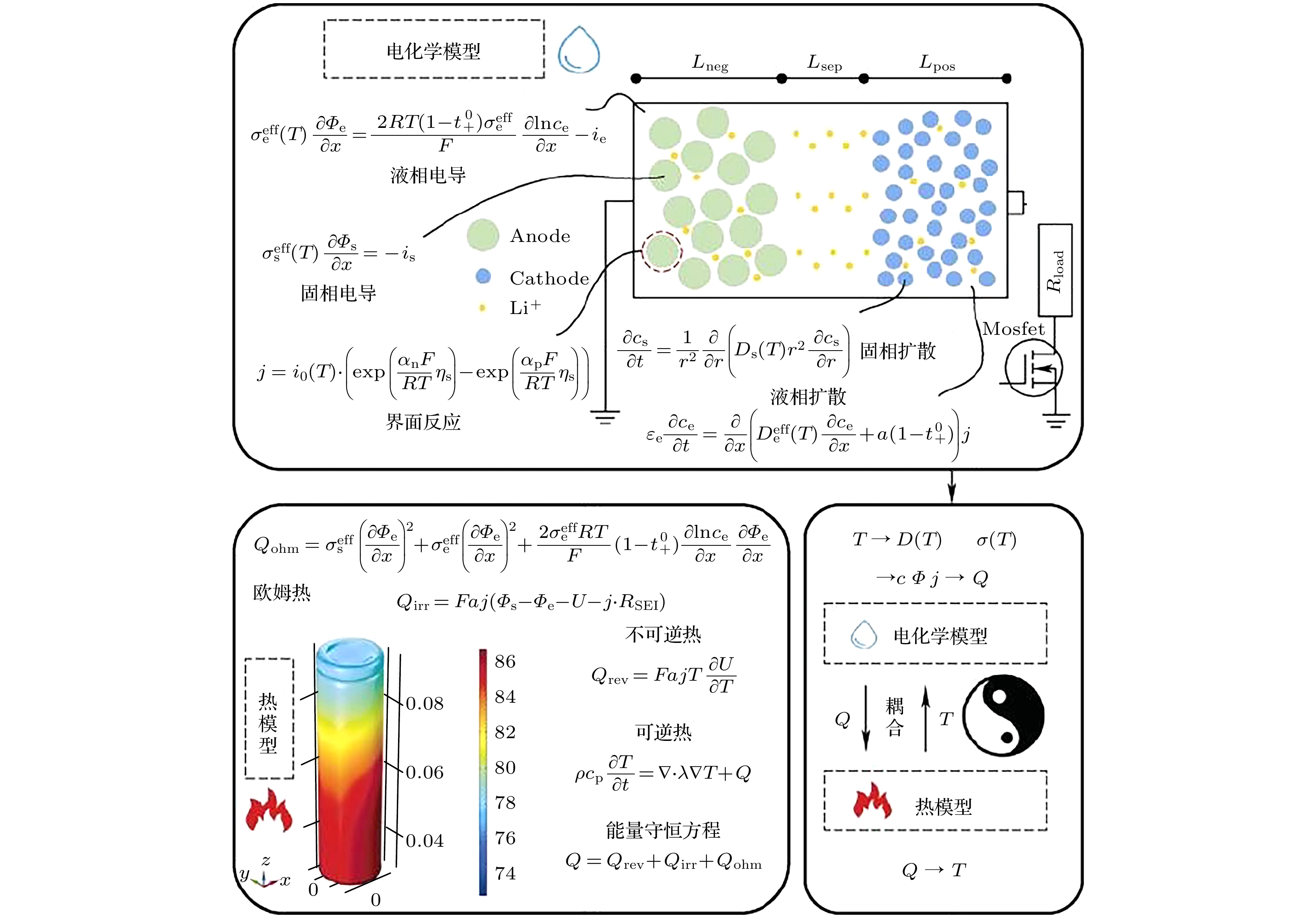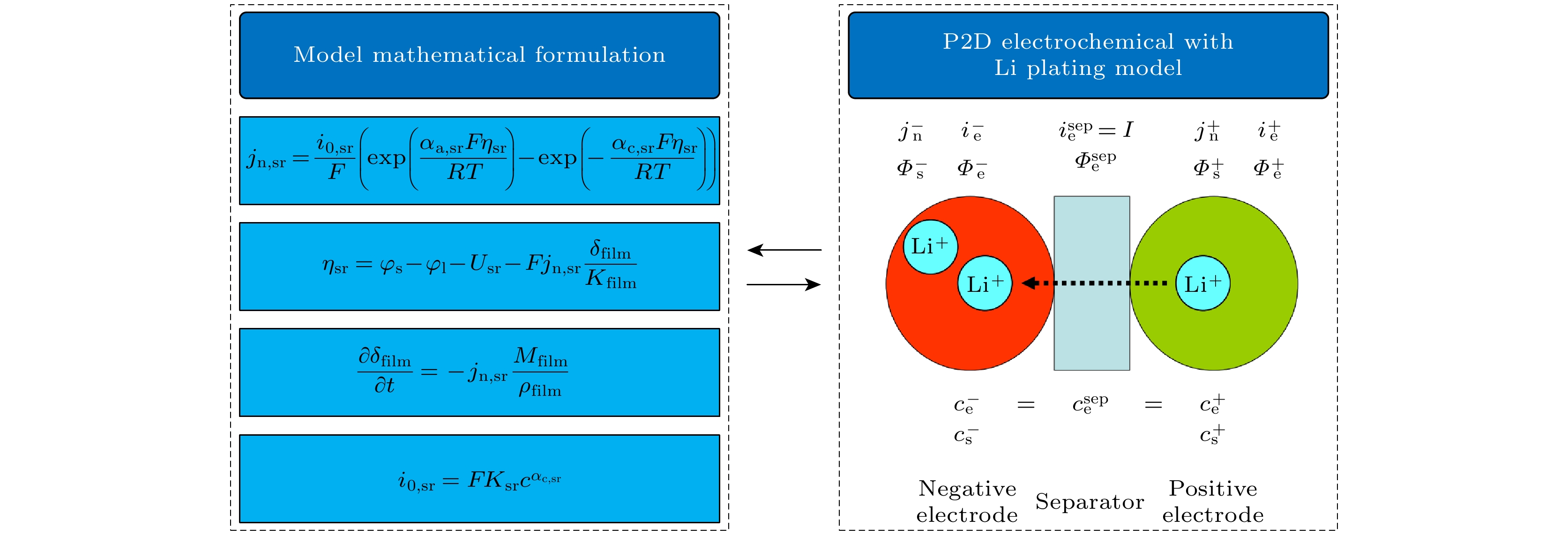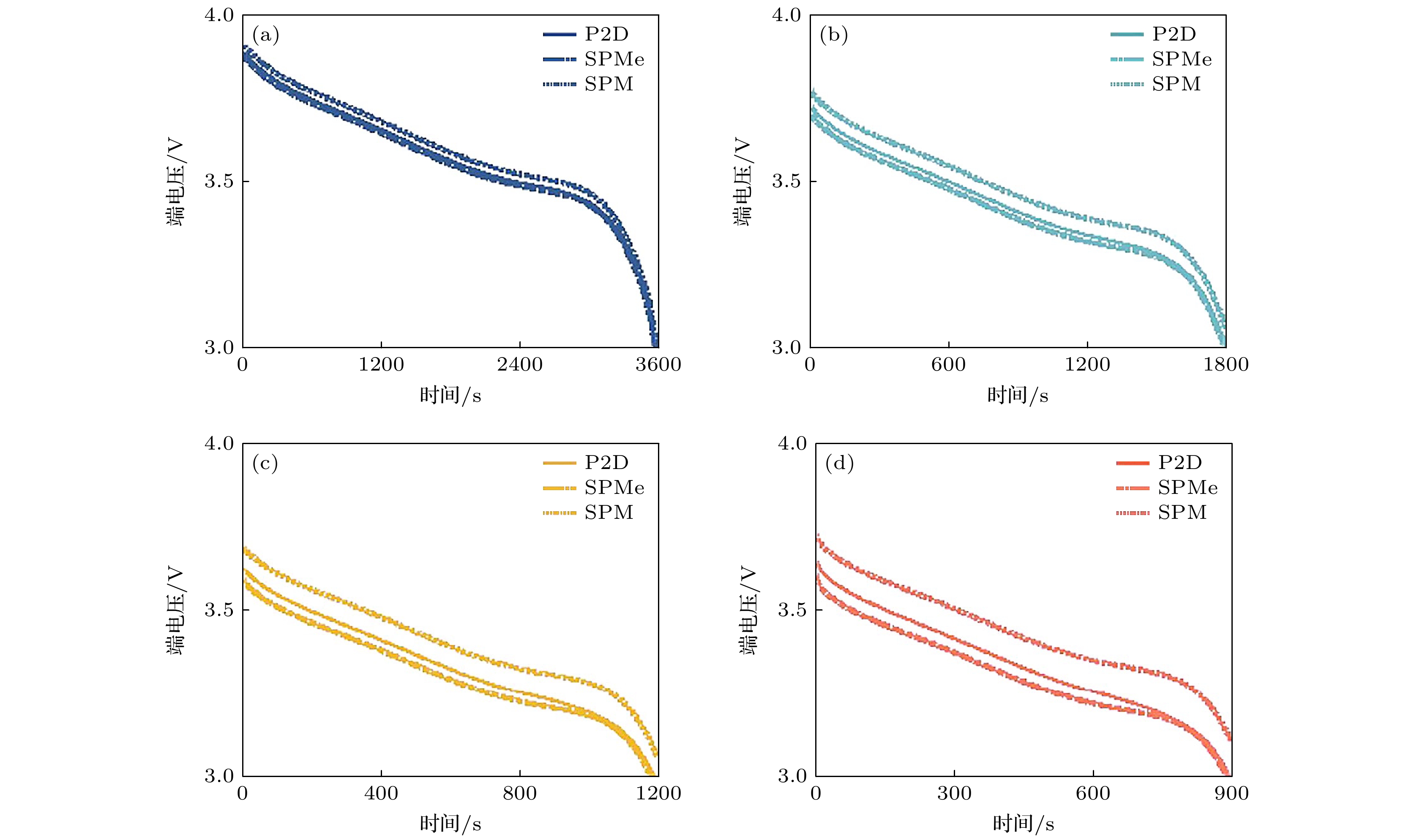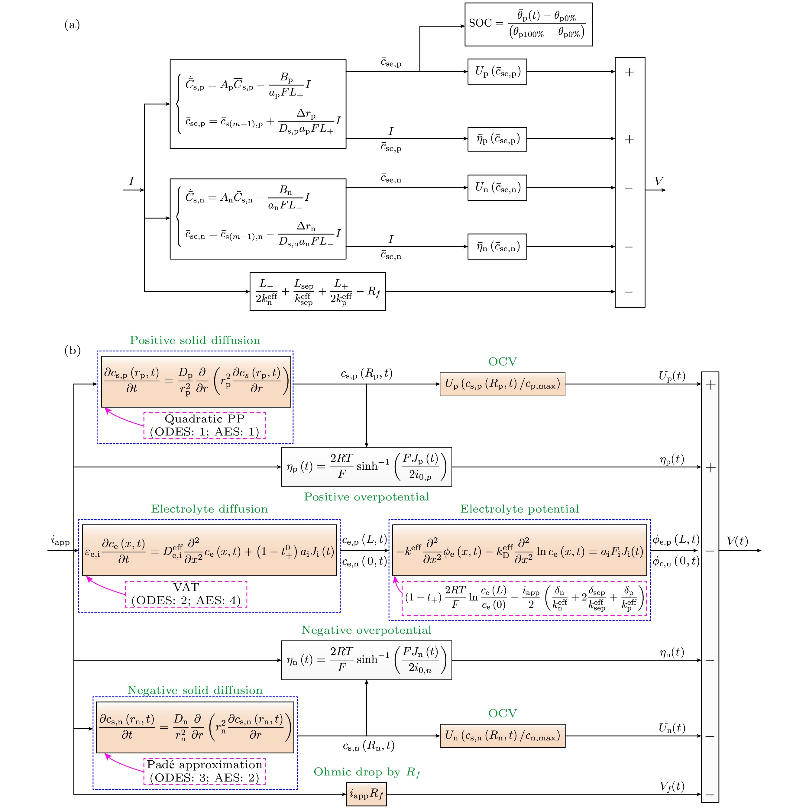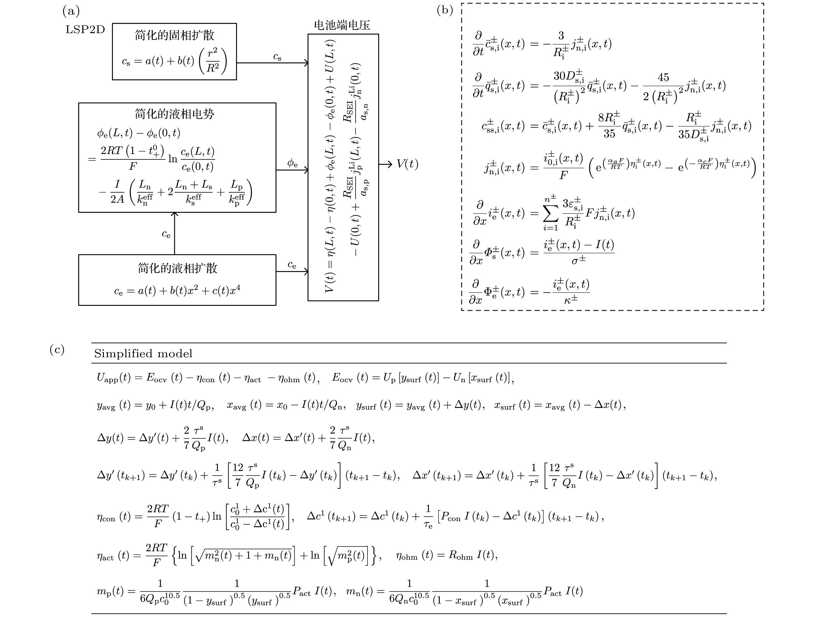 [34,43]在高倍率下忽略固相锂离子浓度的动态变化会进一步造成过电位的偏差. 平均交换电流密度 用平均值描述整体的交换电流密度, 忽略了其在不同电极位置处的差异性. 在高倍率下实际交换电流密度严重偏离平均值, 导致极化电压预测偏差. SPM+SPMe+电化学平均值模型 平均反应电流密度 用平均值描述整体的反应电流密度, 忽略了其在不同电极位置处的差异性. [43,33]
