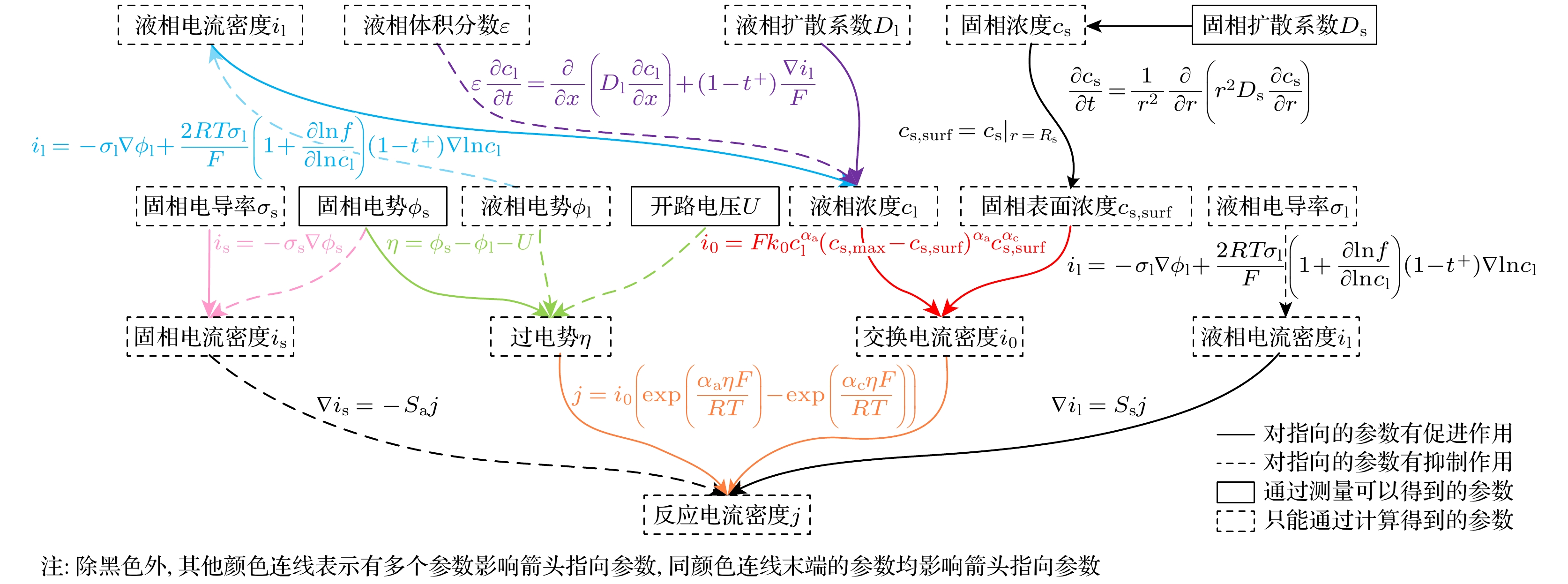 [34,47]在高倍率情况下会导致局部过电位的变化被忽略, 进而影响模型输出电压. SPM+电化学平均值模型 平均液相锂离子浓度 用平均值描述整体的液相锂离子浓度, 忽略了其动态变化. [43,47] 在高倍率情况下, 电解液浓度梯度变化显著, 平均化会低估浓差极化, 进而影响输出电压. LSP2D 体积平均浓度 描述固相锂离子浓度的体积平均值, 体现在微观颗粒层面. [51,52] 直接影响模型在稳态下的容量预测, 会导致SOC估计偏差. 表面浓度 描述固相颗粒表面的锂离子浓度. 会影响交换电流密度和极化电压的计算进而影响输出端电压. 体积平均浓度通量 描述固相锂离子浓度相对于系统中位置的平均变化. 和浓度梯度密切相关, 会导致扩散极化现象的预测偏差. -