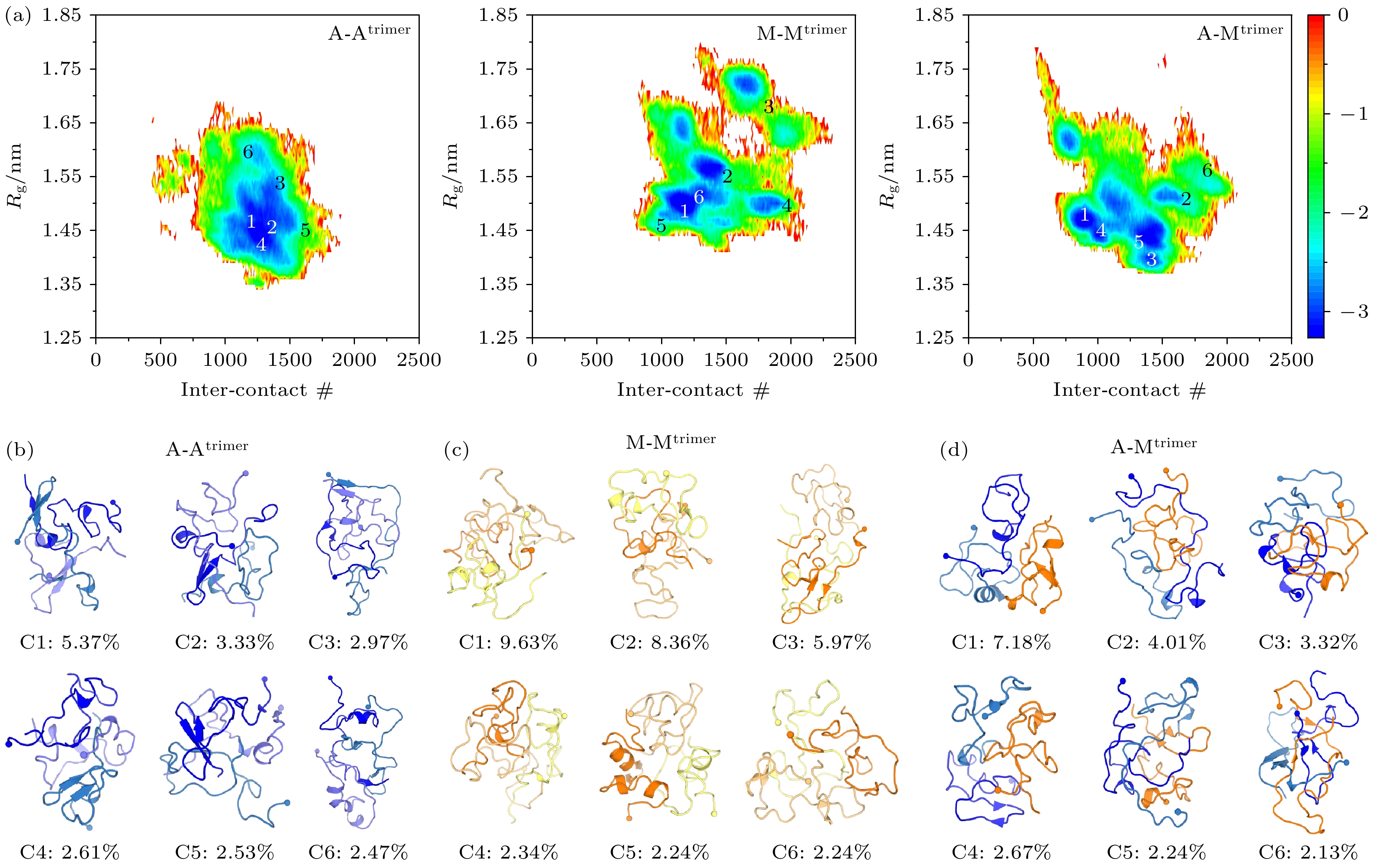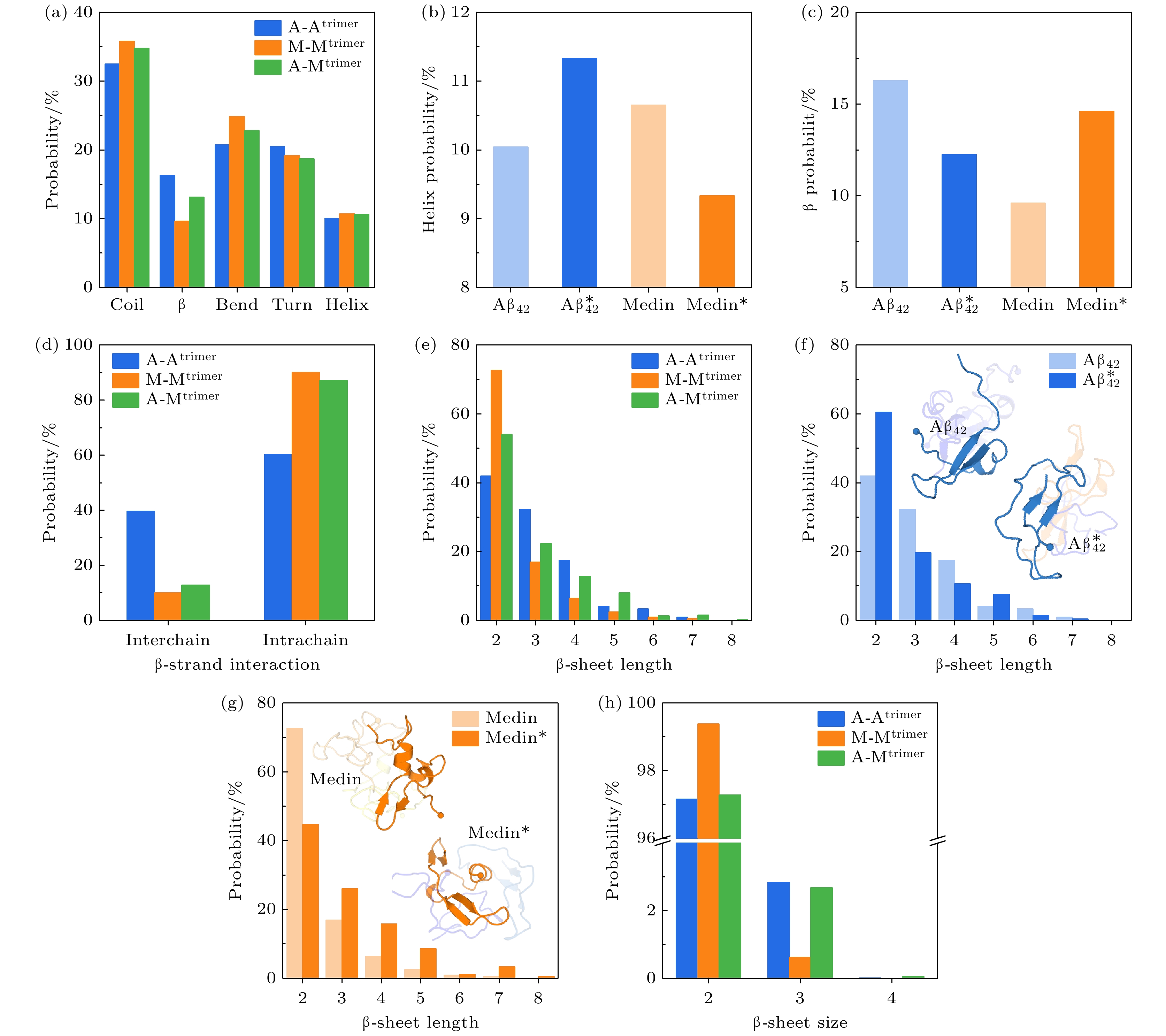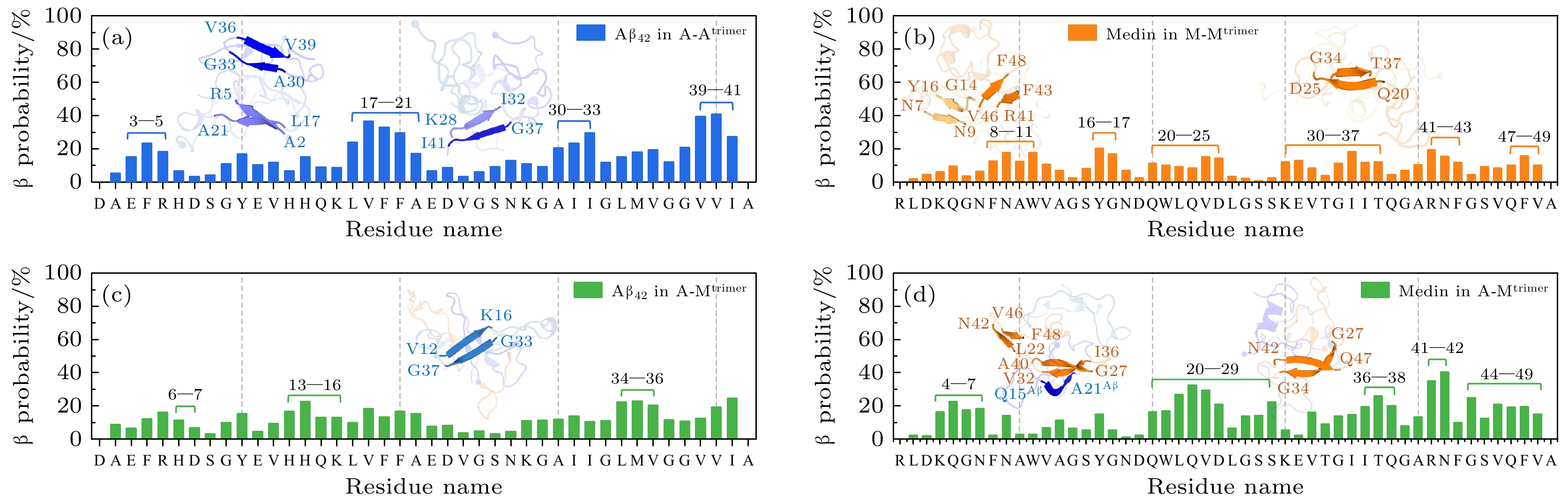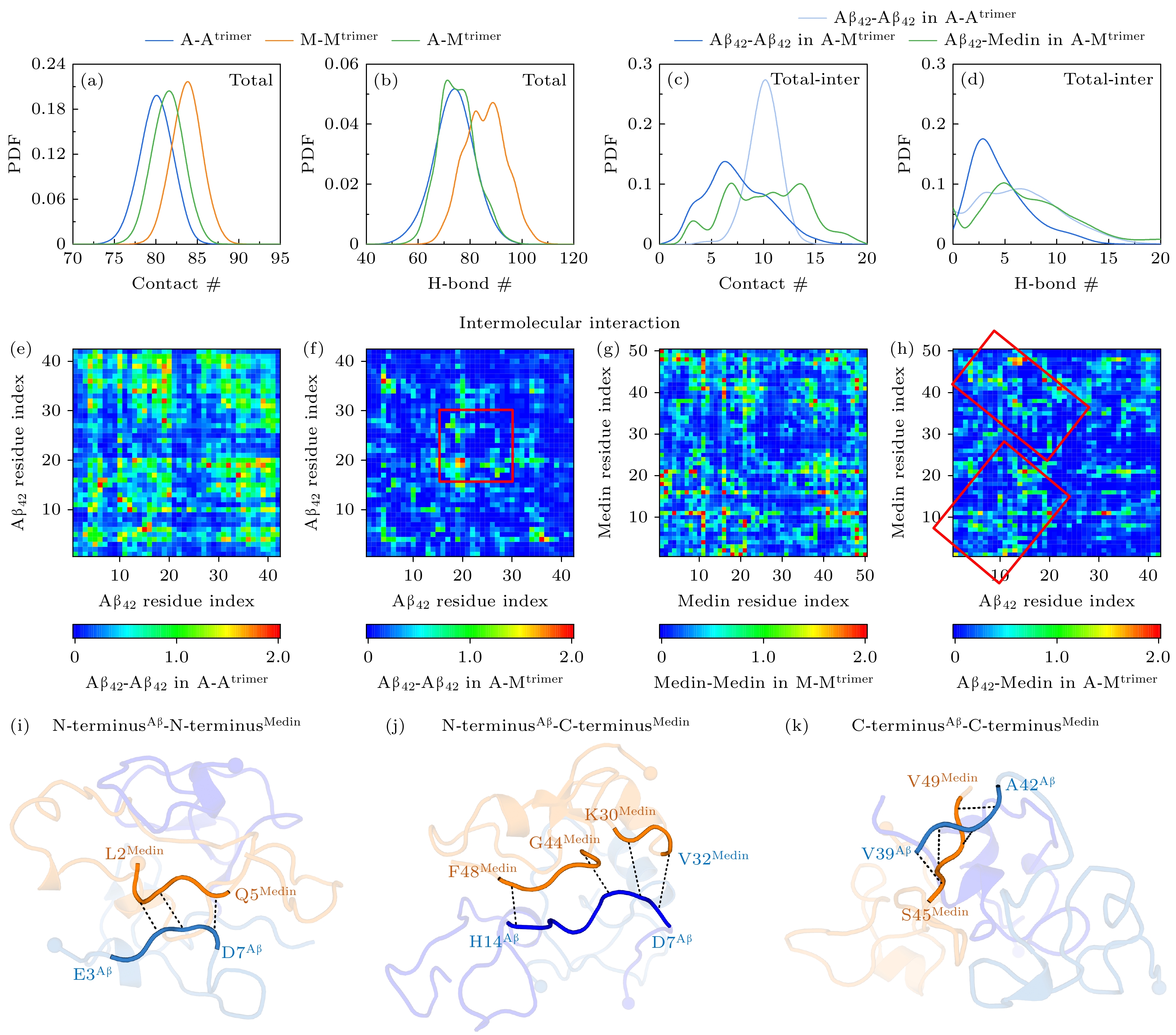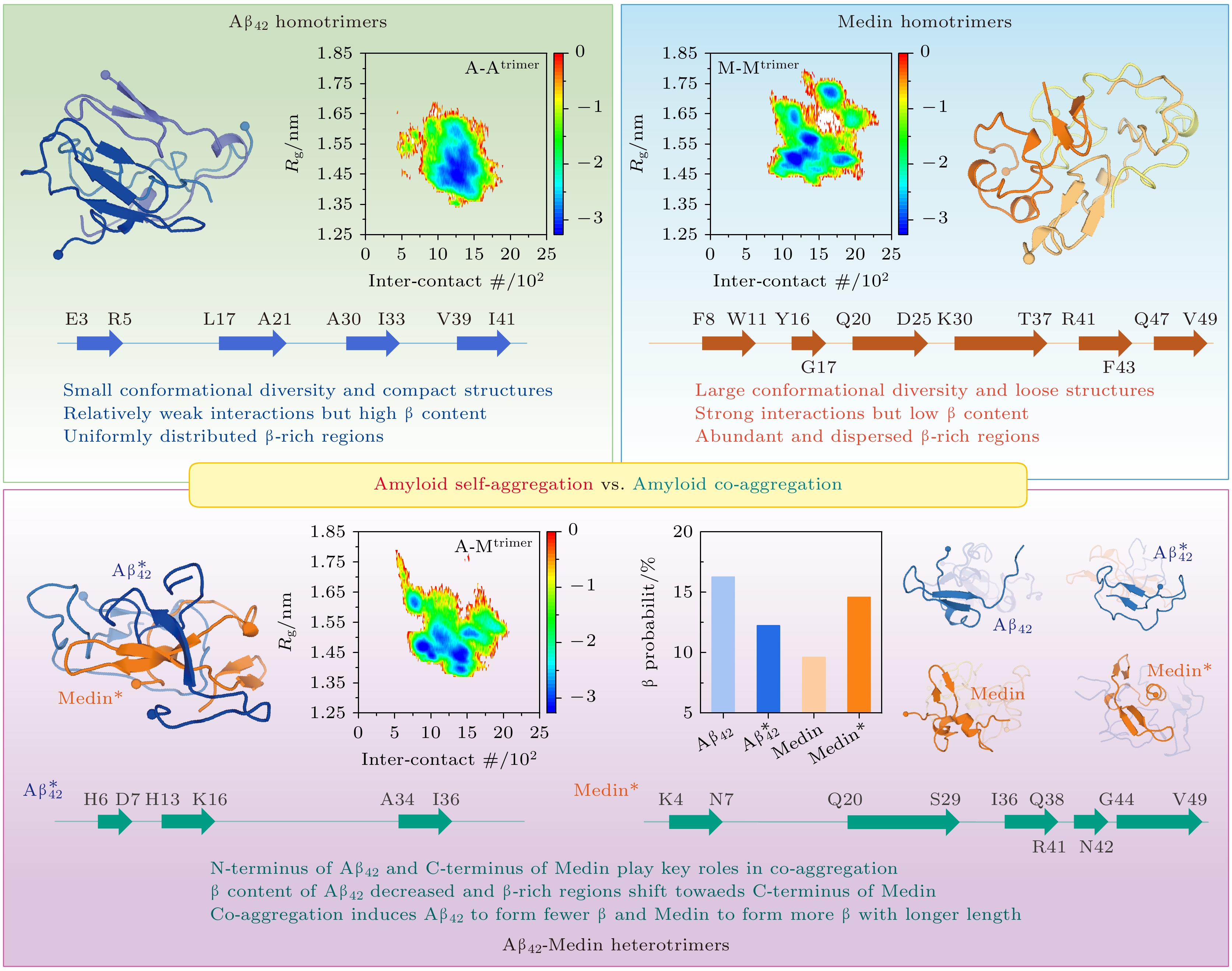 • The aggregation of Medin is closely related to the arterial wall degeneration and cerebrovascular dysfunction. In patients with vascular dementia or Alzheimer’s disease, the concentration of medin in cerebral arterioles increases, and Medin is co-localized with vascular amyloid-β (Aβ) deposits. Previous study demonstrates that Medin interacts directly with Aβ, forming heterologous fibrils with Aβ and promoting Aβ aggregation. However, the basic mechanism of the co-aggregation between Medin and Aβ remains largely elusive. Here, we explore the interactions and conformational ensembles of Aβ42/Medin trimers in different peptide environments (self-aggregation vs. co-aggregation) by performing all-atom replica exchange molecular dynamic simulation on Aβ42/Medin homotrimers and Aβ42-Medin heterotrimer with an accumulated simulation time of 72 μs. Our results reveal that Aβ42 exhibits higher affinity with Medin, and Aβ42 and Medin have similar molecular recognition sites in self-aggregation and co-aggregation. The N-terminus of Aβ42 and the C-terminus of Medin play critical roles in Aβ42-Medin cross-talk. More importantly, co-aggregation significantly changes the interaction strength, binding patterns and structural characteristics of Aβ42 and Medin. Intermolecular interactions of Aβ42 trimers are relatively weak among three trimers, and the binding sites are concentrated between N- and N-termini, between N- and C-termini, and between C- and C-termini of Aβ42. In contrast, intermolecular interactions of Medin trimers are the strongest, and the binding sites are widely and uniformly distributed in Medin peptides. Intermolecular interactions of Aβ42 in Aβ42-Medin heterotrimer decrease compared with those of Aβ42 trimers, only the binding of the hydrophobic core regions (16KLVFFA21) is retained and other regions of Aβ42 gain increase flexibility. Two-dimensional free energy landscapes reveal distinct conformational diversities between the homo- and heterotrimers, with the order of diversity being Medin/Aβ42-Medin trimers > Aβ42 trimers. The Rg of Aβ42 trimers is smaller than those of the other two trimers, implying that Aβ42 trimers possess a more compact structure, whereas Medin/Aβ42-Medin trimers exhibit a relatively loose conformation. The Aβ42 trimers possess the highest β content whereas Medin trimers exhibit the lowest β probability. It is found that Aβ42-Medin co-aggregation induces Medin to form more β-structures with longer lengths and fewer helices, while promoting Aβ42 to form more helices and fewer β-structures. High β-propensity regions of Medin in heterotrimers shift towards the C-terminus of Medin, suggesting that Medin utilizes its C-terminal β region as a core motif to drive its co-aggregation with Aβ42. These results elucidate the detailed influences of co-aggregation on the interactions and conformations of Aβ42 and Medin. This work provides key insights into the molecular mechanism of Aβ42-Medin co-aggregation and the pathological mechanisms of cross-linking between related diseases.
