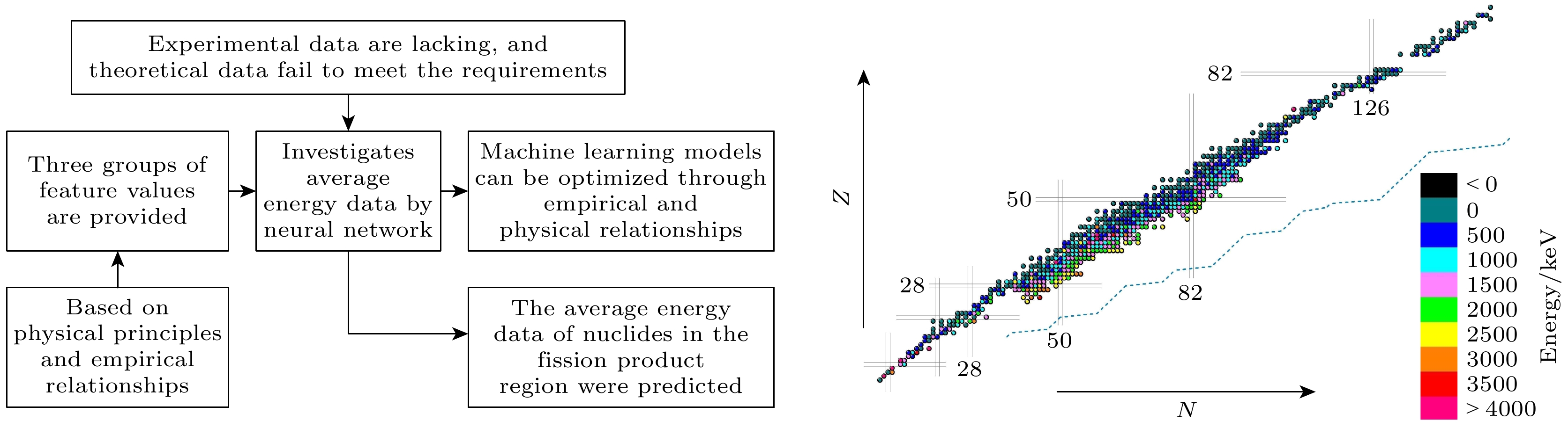 The average β energy data and average γ energy data of the β--decay released nuclei play an important role in many fields of nuclear technology and scientific research, such as the decay heat and antineutrino spectrum calculation for different kinds of reactors. However, the reliable experimental measurements of the average energies for many nuclei are lacking, and the theoretical calculation needs to be improved to meet the requirements for accuracy in the technical applications.In this study, the average β, γ and neutrino energies of the β–-decay released nuclei are investigated by the neural network method based on the newly evaluated experimental data of 543 nuclei that are selected from a total of 1136 β–-decay nuclei. In the neural network approach, three different characteristic groups are used for model training. Each characteristic group contains a characteristic value (one of the $T_{1/2}$, $\left( \dfrac{1}{T_{1/2}} \right)^{1/5}$, and $\dfrac{1}{3}Q$), along with five identical characteristic values (Z, N, parity of Z, parity of N, and $\Delta Z$).The three characteristic values are selected based on the physical mechanism below. 1) The average energy is obviously related to Q value and approximately taken as $\dfrac{1}{3}Q$ in the reactor industry. Therefore, the $\dfrac{1}{3}Q$ is chosen as one characteristic value. 2) The half-live is related to the Q value of β--decay, and $T_{1/2}$ is considered. 3) According to the Sargent’s law, $\left( \dfrac{1}{T_{1/2}} \right)^{1/5} \propto Q$, a more accurate $\left( \dfrac{1}{T_{1/2}} \right)^{1/5}$ value is selected.As a result, for the characteristic group of $T_{1/2}$, the training results for all three types of average energies are unsatisfactory. For the other groups, the relative errors of the average β energy data, are 19.32% and 28.11% for $\left( \dfrac{1}{T_{1/2}} \right)^{1/5}$ and $\dfrac{1}{3}Q$ feature groups in the training set, and 82% and 56.9% in the validation set; the relative errors of the average γ energy are 28.9% and 76.9% for $\left( \dfrac{1}{T_{1/2}} \right)^{1/5}$ and $\dfrac{1}{3}Q$ characteristic groups, respectively, and they are both >100% in the validation set; for the average neutrino energy, the relative errors in the training set are 27.82% and 35.33% for $\left( \dfrac{1}{T_{1/2}} \right)^{1/5}$ and $\dfrac{1}{3}Q$ feature group, and 76.32% and 37.76% in the validation set, respectively.Considering the accuracy comparison of the three groups, the $\dfrac{1}{3}Q$ characteristic group is chosen to predict the average energy data of nuclei in the fission product region (mass numbers range from 66 to 172), which lacks reliable experimental data. As a result, the average energy data with predicted values for 291 nuclei are supplemented. Besides, a comparison is made between the calculated data and the evaluated experimental data through the nuclide chart. It is found that the neural network accurately predicts the experimental data for the average β and neutrino energies which exhibit relatively strong regularity. However, the average β energy significantly deviates from the prediction of the average γ energy (relative error in the training set is 76.9%). Large deviation also emerges in the odd-odd nuclei and nuclei near magic numbers. This study confirms that integrating empirical relationships and physical principles can effectively improve the performance of the neural network, and simultaneously reveals the relationship between data regularity and model generalization capability. These findings provide a basis for using physical mechanisms to optimize machine learning models in the future.