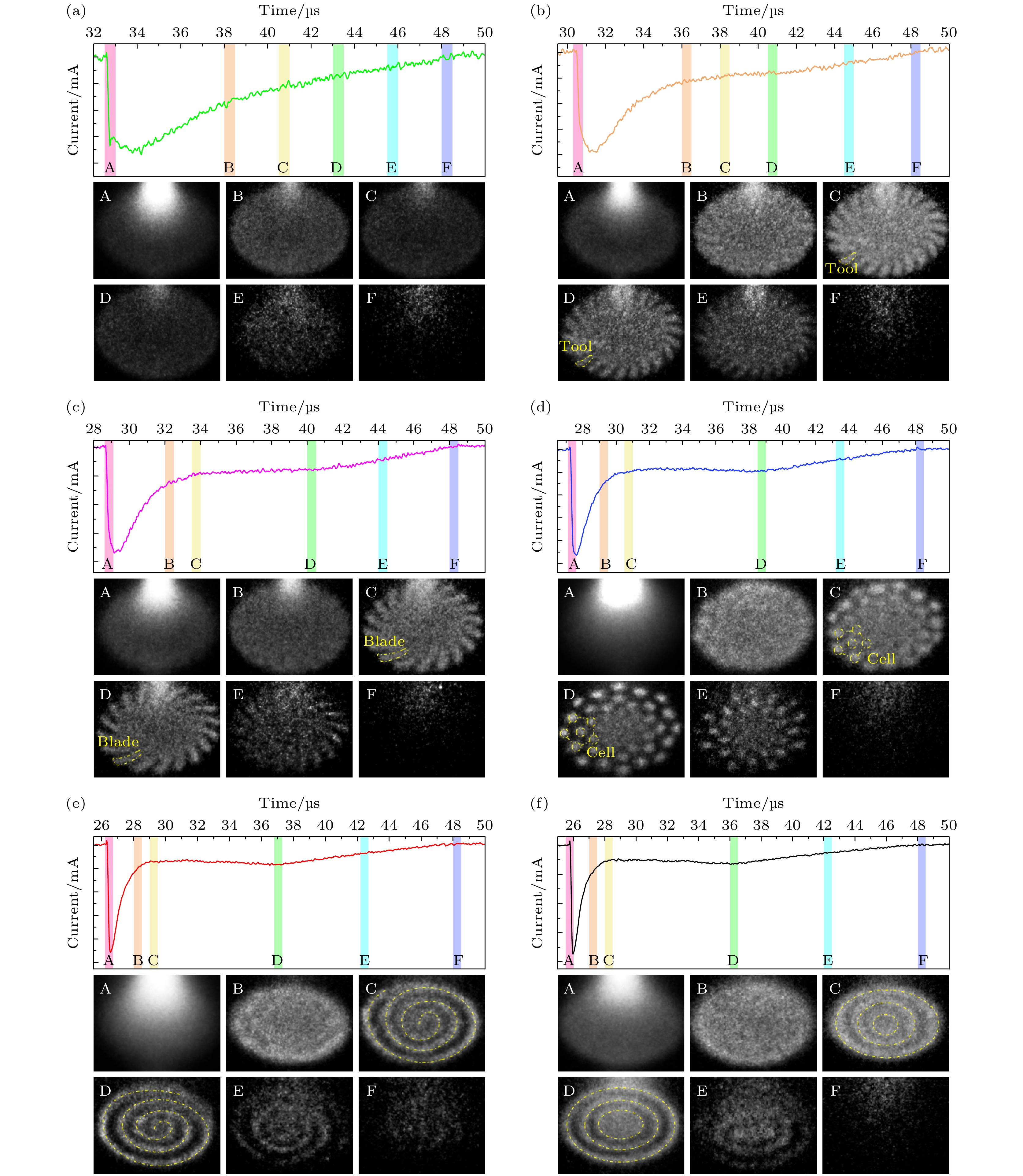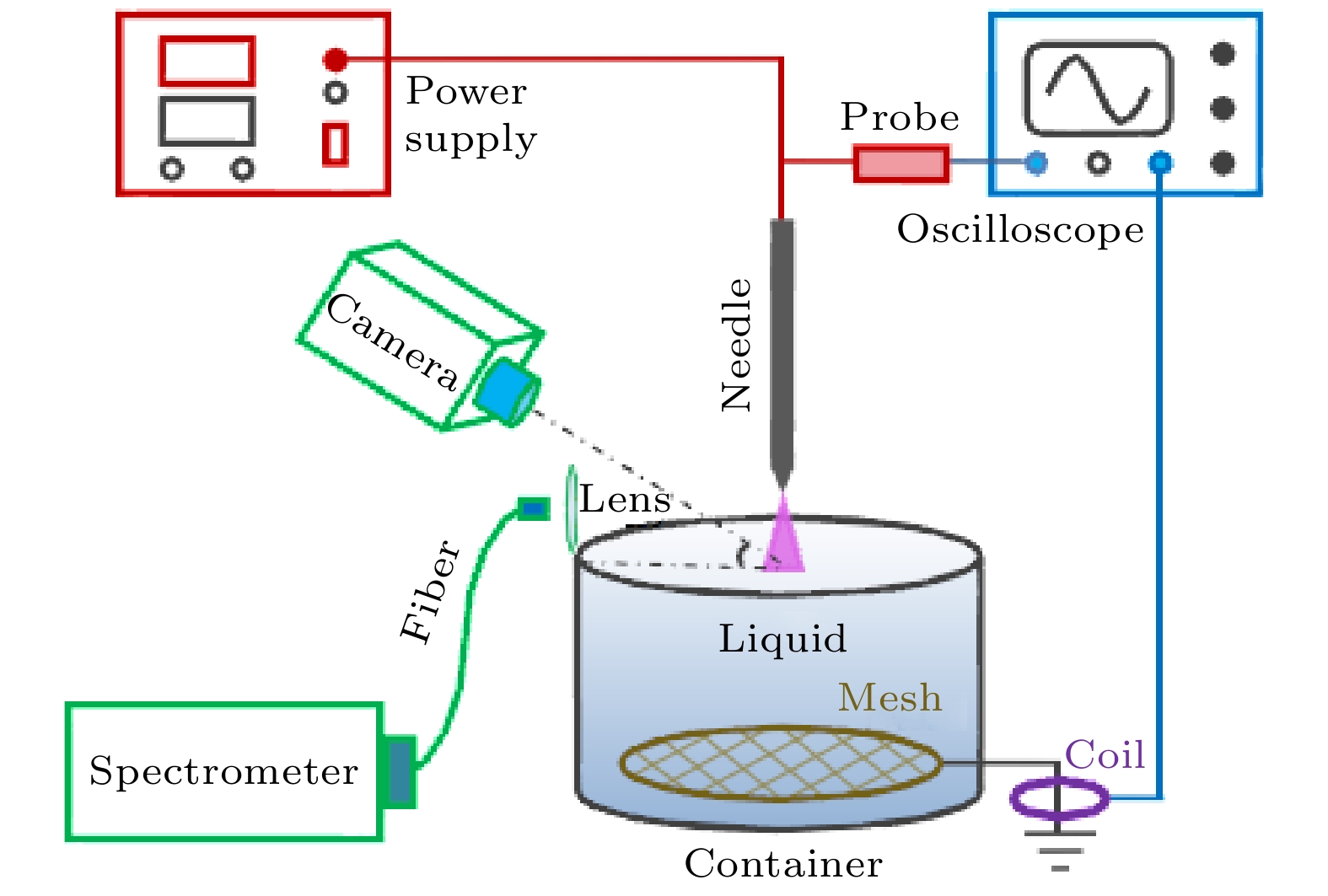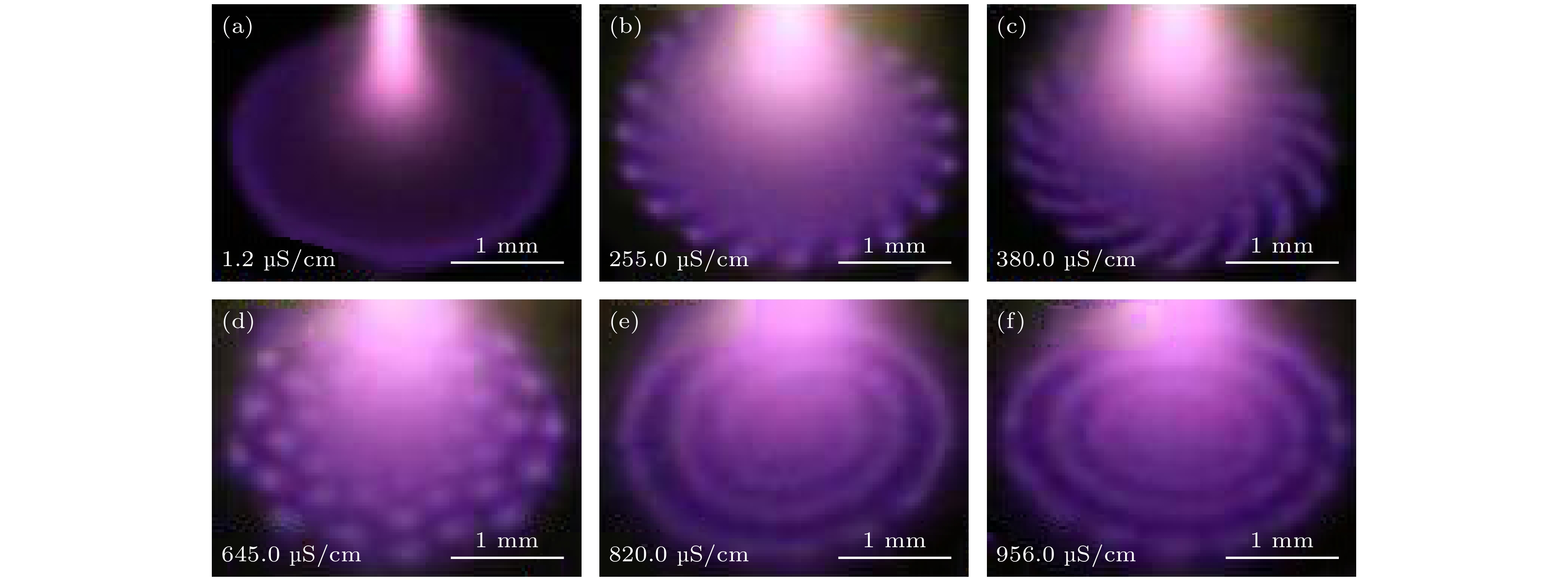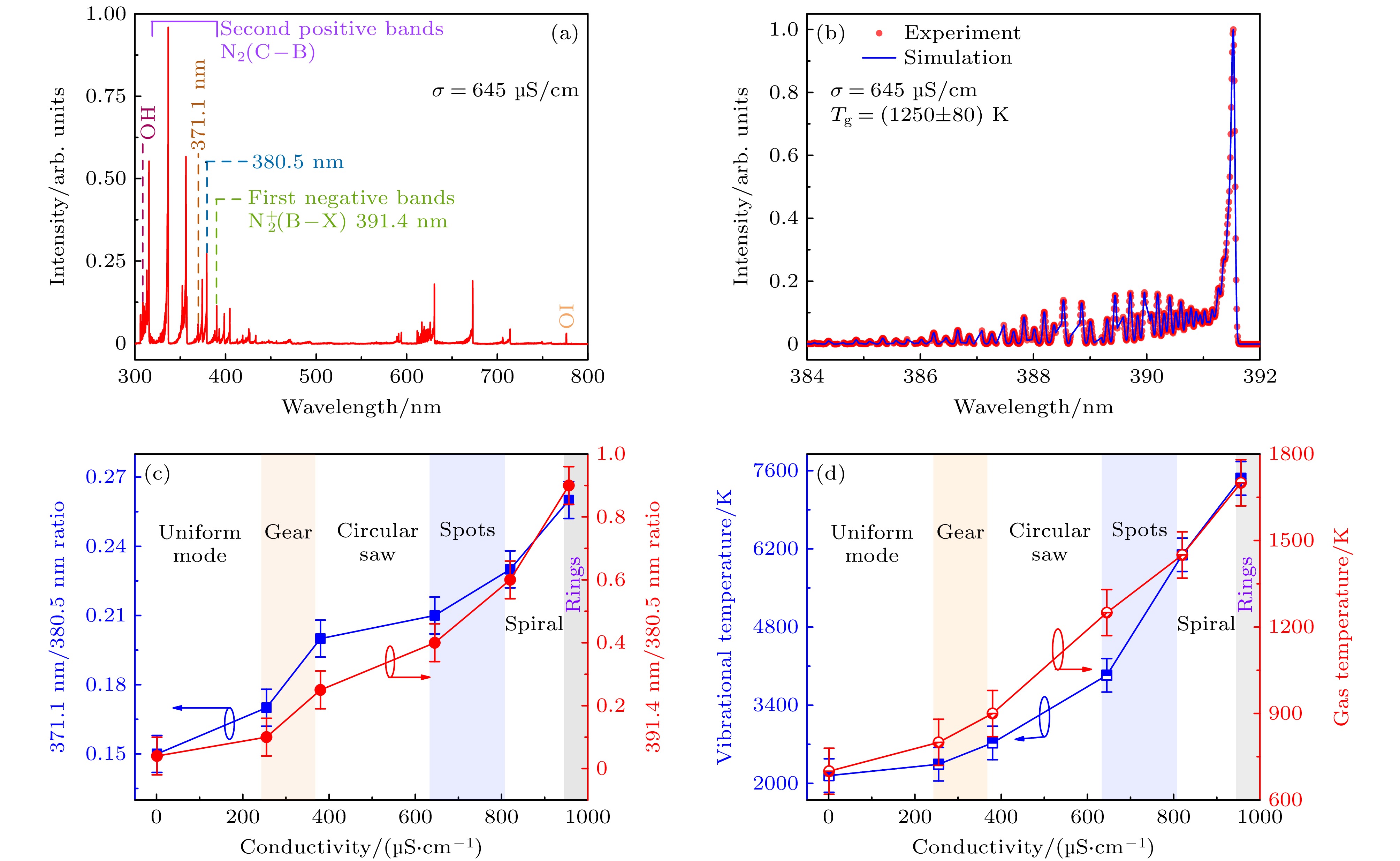 A liquid-electrode discharge system excited by an alternating-current sinusoidal voltage is employed to investigate the discharge modes with varying liquid conductivity (σ). The results indicate that with σ increasing, the discharge transitions from the uniform mode to the pattern mode, which undergoes various self-organized patterns such as gear, circular saw, discrete spots, single-arm spiral, and concentric rings on the liquid surface. The voltage and current waveforms reveal that the discharge occurs only in the negative half-cycle of applied voltage (when the liquid acts as the instantaneous anode). After gas breakdown, the discharge current rises rapidly to a peak, and then slowly decreases. For the uniform mode, the current decreases monotonically. However, during the current decreasing in the pattern mode, there appears a plateau in which the current keeps almost invariant with time. As σ increases, the values of the peak current and the plateau increase, and the breakdown moment advances. In addition, fast photography achieved through an intensified charge-coupled device (ICCD) shows that regardless of the discharge mode, a uniform disk is initially generated on the liquid surface, and various non-uniform patterns are formed during the plateau stage. Based on the reaction-diffusion model, numerical simulations are carried out through changing ion strength and current strength, which are related to the variables m and l. The simulated discharge modes are well in line with those obtained in the experiments. Moreover, spectral line intensity ratios related to electron temperature and electron density are determined through the spectra emitted from the discharge near the liquid surface. By fitting the spectra, gas temperature and molecular vibration temperature are obtained, which show an increasing trend with σ increasing.