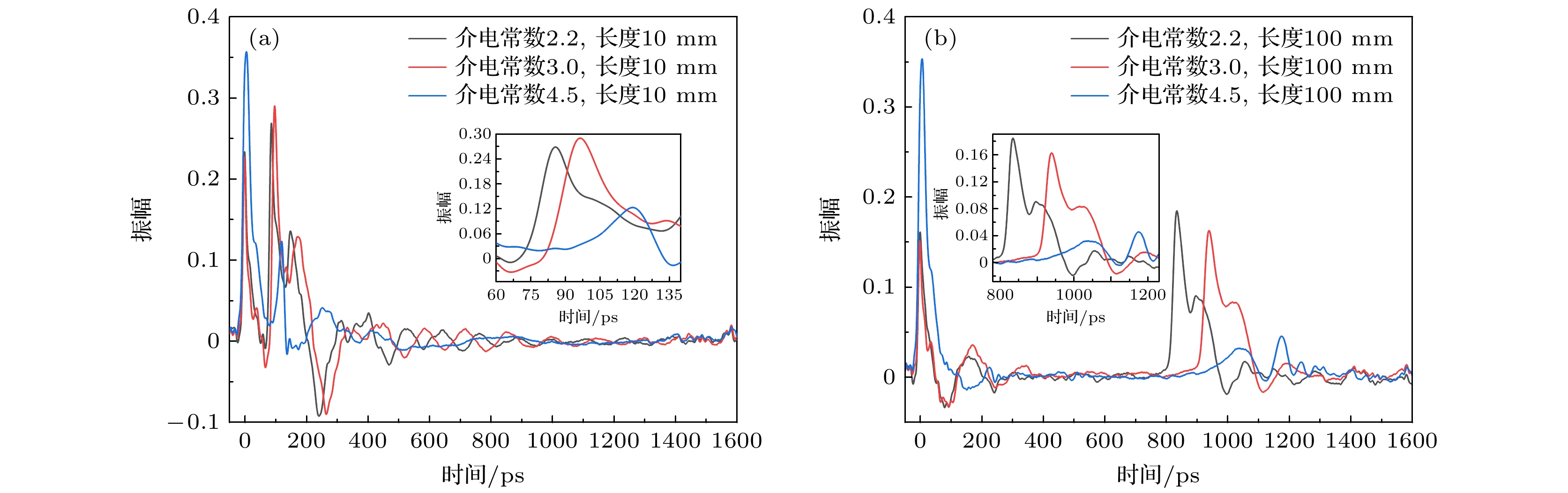 Terahertz waves have broad application prospects in fields such as food quality, biomedicine, and security communication. However, the dispersion and loss during transmission limit the development of terahertz systems. This study focuses on the dispersion characteristics of microstrip lines in the terahertz low-frequency range. By combining theoretical modeling, numerical simulation, and experimental verification, the dispersion mechanism and key influencing factors of microstrip lines are systematically analyzed, providing theoretical support for low dispersion, high-performance terahertz integrated circuits and systems. This study is based on electromagnetic field theory, dividing microstrip line dispersion into dielectric dispersion, geometric dispersion, and conductor dispersion, and introducing a modified model to overcome the limitations of traditional quasi-static theory in the high frequency range. In this study, the CST time-domain finite difference simulation and terahertz time-domain pulse reflection (TDR) technology are employed to conduct multidimensional simulation and examine three different dielectric constant substrates (2.2, 3, 4.5), wire widths (100–1600 μm), lengths (10–150 mm) and other parameters. The pulse broadening coefficient is introduced to quantitatively evaluate the dispersion characteristics of microstrip lines. The results indicate that the increase in substrate dielectric constant significantly enhances the dispersion effect. When εr increases from 2.2 to 4.5, the increase in equivalent dielectric constant leads to a decrease in pulse transmission speed. When the wire width increases from 100 μm to 1600 μm, the pulse broadening coefficient dominated by geometric dispersion increases from 3.12 to 5.12, with an increase of 38%. However, when the wire length increases from 10 mm to 150 mm, the cumulative dispersion increases the broadening coefficient from 2.12 to 3.18, with an increase of 33%, verifying the sensitivity of width to dispersion control. The simulation result once again shows that due to the small skin depth of terahertz waves on metal surfaces, the difference in conductivity among the three conductor materials of gold, silver, and copper (4.1×107–6.3×107 S/m) can be ignored in terms of dispersion effect. According to the actual measurement and fitting results, the geometric dispersion of microstrip lines is more significant than the dispersion loss caused by length accumulation. In addition, simulation, experimental testing, and theoretical analysis are all in good consistency with each other. The conclusion indicates that optimizing the design of microstrip lines requires priority control of the dielectric constant and wire width of substrate material to suppress the synergistic effect of geometric dispersion and dielectric dispersion, providing quantifiable design criteria for high bandwidth and low distortion transmission in terahertz communication systems, and laying experimental and theoretical foundations for the engineering application of terahertz integrated circuits.