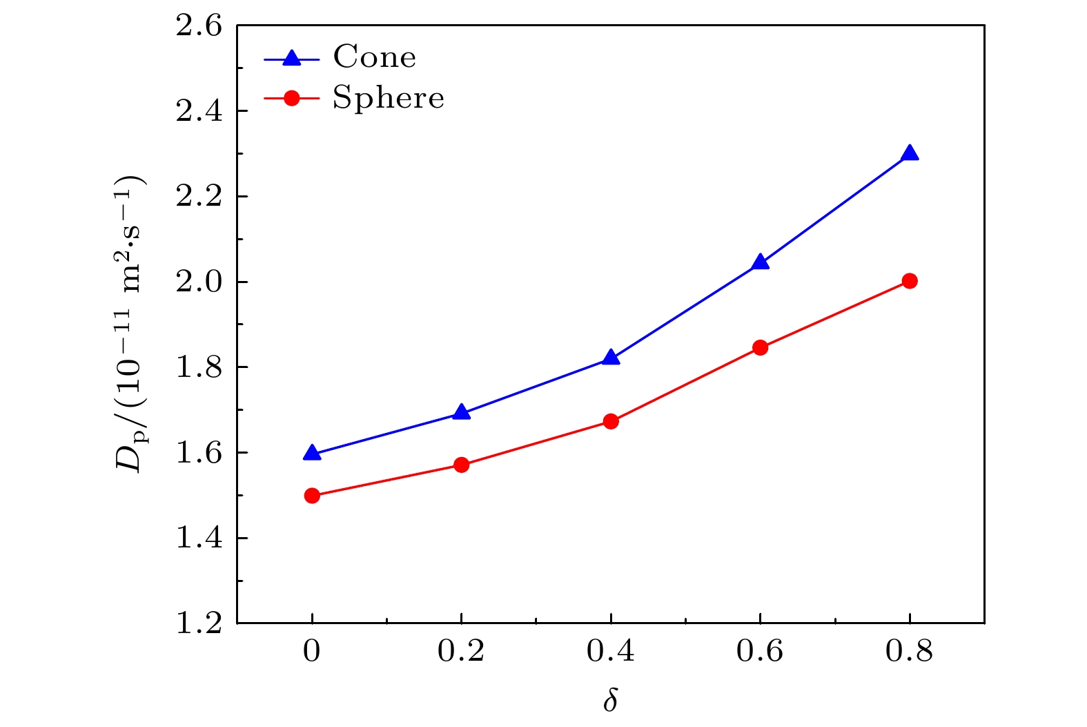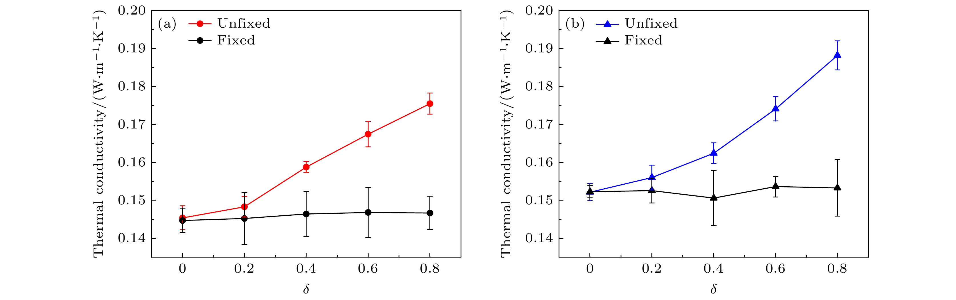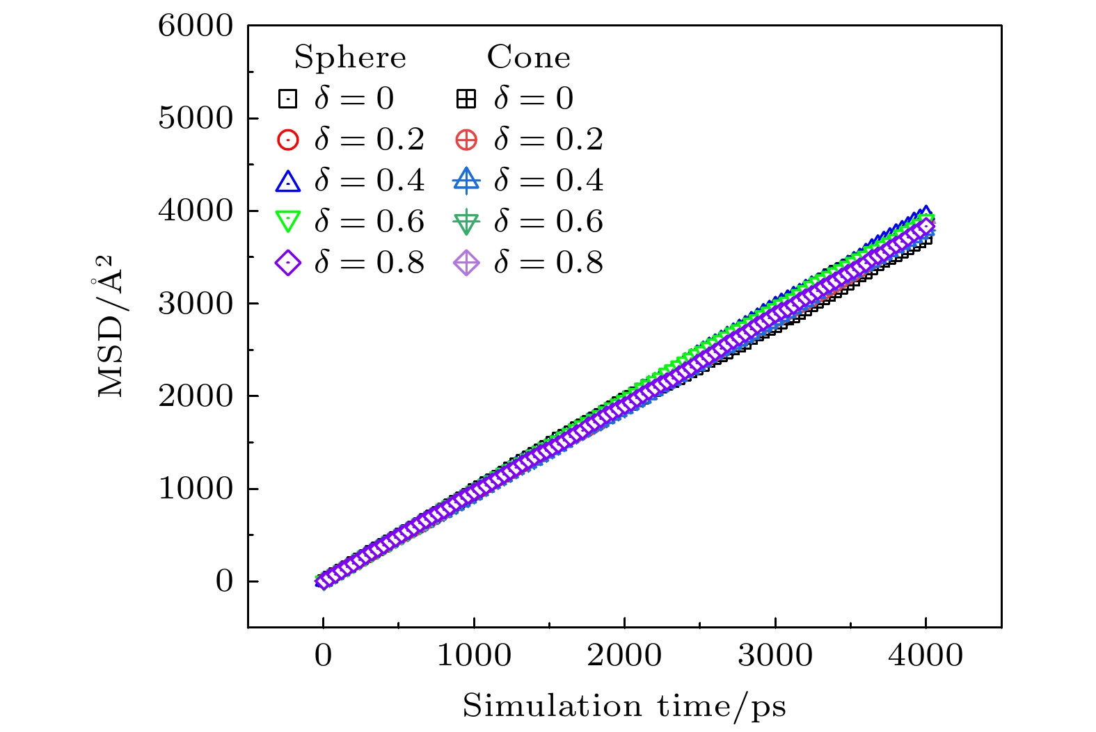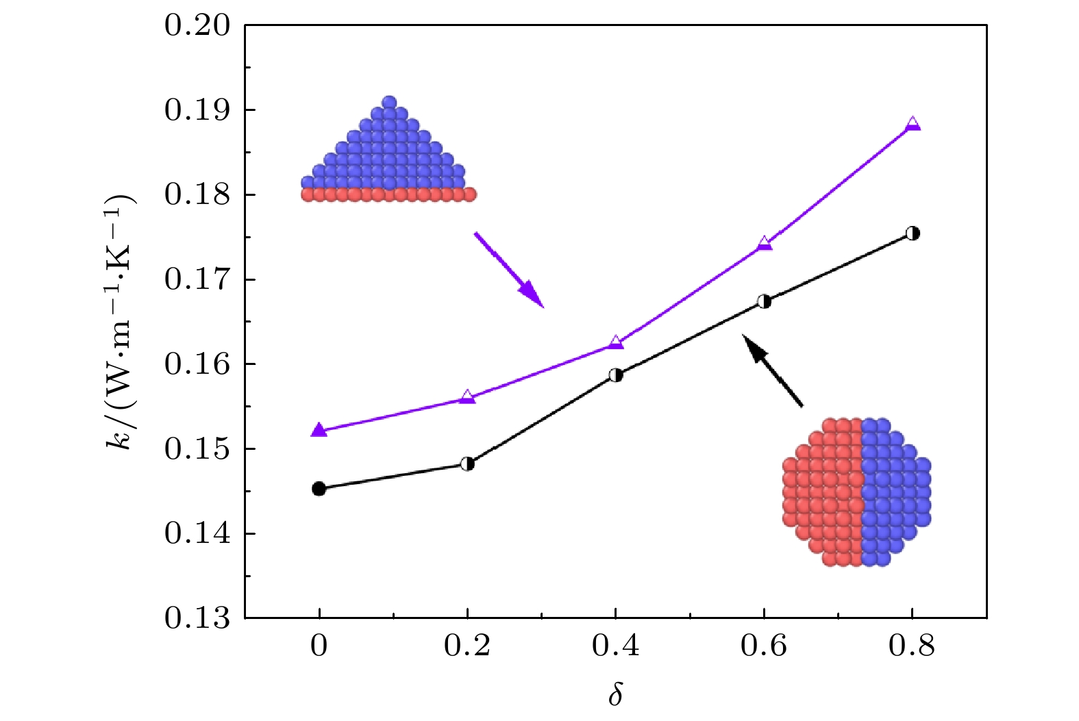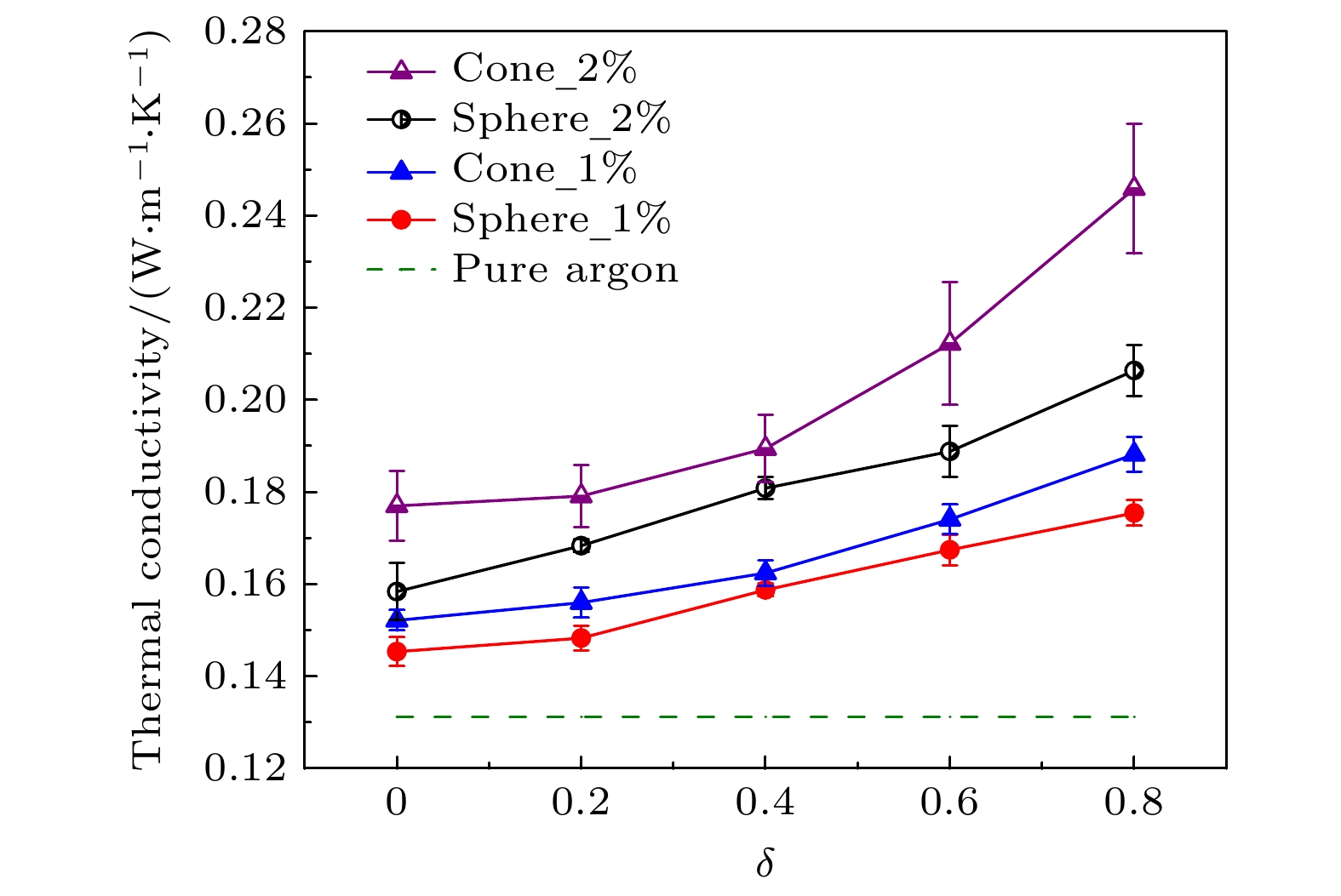 It has been reported that the thermal conductivity of the nanofluids can be enhanced by adding Janus nanoparticles into the base fluid. Additionally, the non-spherical nanoparticles also affect the thermal characteristics of nanofluids. In this work, conical nanoparticles are designed as Janus nanoparticles with hydrophilic side and hydrophobic bottom, which are suspended in the base fluid to form cone-shaped Janus nanofluids. By using molecular dynamics (MD) simulations, it is found that the thermal conductivity of conical Janus nanofluids can be enhanced by 43.4% compared with that of the base fluid, whereas the spherical Janus nanofluids indicate an increase of 33.7% under the same volume fraction. According to MD simulation results of the RDF and diffusion coefficients of solid particle and base fluid, the increased thermal conductivity observed in conical nanofluids can be attributed to the higher liquid layer density and the enhanced Brownian motion of the conical particles. For Janus nanofluids, the asymmetrical structure of Janus nanoparticles leads to higher diffusion coefficient than that of normal particles, which enhances the colliding possibility of Janus nanoparticles with surrounding liquid molecules, thus resulting in enhanced heat transfer in Janus nanofluids. In this paper, both fixed and unfixed particles are considered to explore the influence of particle diffusion on nanofluids. Under the fixed condition, the Brownian motion of the nanoparticles is artificially excluded, while under the unfixed condition, the particle can diffuse in the base liquid. It is found that for both spherical and conical Janus nanofluids, the thermal conductivity of Janus nanofluids gradually increases with the augment of asymmetry parameter δ under unfixed conditions. However, under fixed conditions, the thermal conductivity of Janus nanofluids is almost independent of the parameter δ. Therefore, the enhanced Brownian motion of the non-spherical particles is a likely reason of the increased thermal conductivity observed in conical Janus nanofluids. The combination of non-spherical particles and Janus particles provides a promising idea for designing nanofluids with high thermal conductivity.