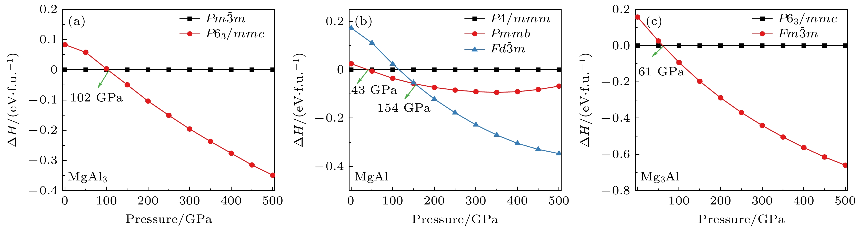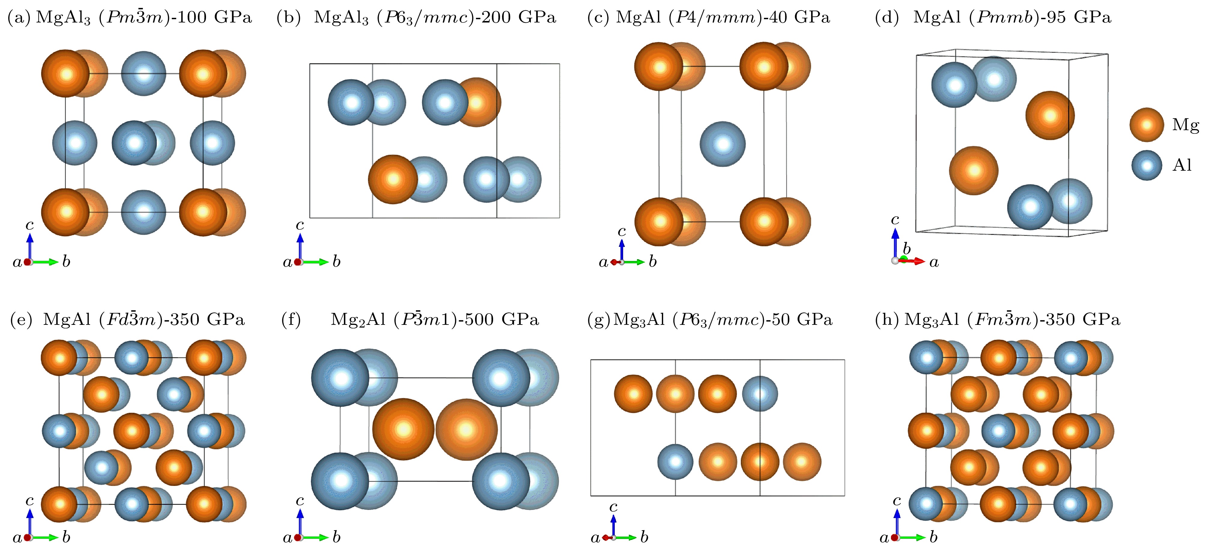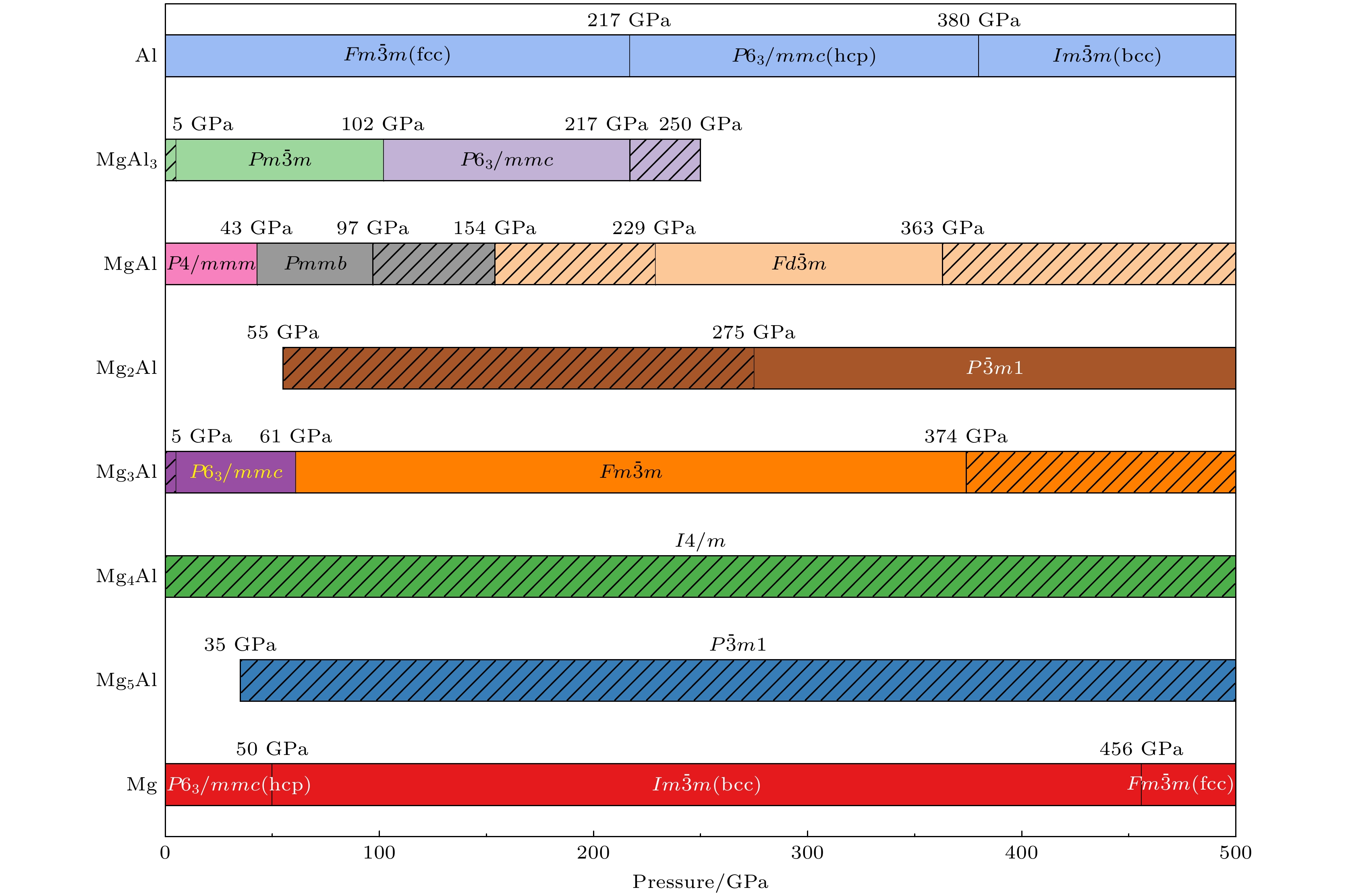 Magnesium and aluminum are abundant metals in the Earth’s crust and widely utilized in industrial engineering. Under high pressure, these elements can form elemental compounds into single substances, resulting in a variety of crystal structures and electronic properties. In this study, the possible structures of magnesium-aluminum alloys are systematically investigated in a pressure range of 0–500 GPa by using the first-principles structure search method, with energy and electronic structure calculations conducted using the VASP package. Bader charge analysis elucidates atomic and interstitial quasi-atom (ISQ) valence states, while lattice dynamics are analyzed using the PHONOPY package via the small-displacement supercell approach. Eight stable phases(MgAl3-Pm${\bar {3}} $m, MgAl3-P63/mmc, MgAl-P4/mmm, MgAl-Pmmb, MgAl-Fd${\bar {3}} $m, Mg2Al-P${\bar {3}} $m1, Mg3Al-P63/mmc, Mg3Al-Fm${\bar {3}} $m) and two metastable phases (Mg4Al-I4/m, Mg5Al-P${\bar {3}} $m1) are identified. The critical pressures and stable intervals for phase transitions are precisely determined. Notably, MgAl-Fd${\bar {3}} $m, Mg2Al-P${\bar {3}} $m1, Mg4Al-I4/m and Mg5Al-P${\bar {3}} $m1 represent newly predicted structures. Analysis of electronic localization characteristics reveals that six stable structures (MgAl3-Pm${\bar {3}} $m, MgAl3-P63/mmc, MgAl-Pmmb, MgAl-Fd${\bar {3}} $m, Mg2Al-P${\bar {3}} $m1 and Mg3Al-P63/mmc) exhibit electronic properties of electrides. The ISQs primarily originate from charge transfer of Mg atoms. In the metastable phase Mg4Al-I4/m, Al atoms are predicted to achieve an Al5–valence state, filling the p shell. This finding demonstrates that by adjusting the Mg/Al ratio and pressure conditions, a transition from traditional electrides to high negative valence states can be realized, offering new insights into the development of novel high-pressure functional materials. Furthermore, all Mg-Al compounds display metallic behaviors, with their stability attributed to Al-p-d orbital hybridization, which significantly contributes to the Al-3p/3d orbitals near the Fermi level. Additionally, LA-TA splitting is observed in MgAl3-Pm${\bar {3}} $m, with a splitting value of 45.49 cm–1, confirming the unique regulatory effect of ISQs on lattice vibrational properties. These results elucidate the rich structural and electronic properties of magnesium-aluminum alloys as electrodes, offering deeper insights into their behavior under high pressure and inspiring further exploration of structural and property changes in high-pressure alloys composed of light metal elements and p-electron metals.