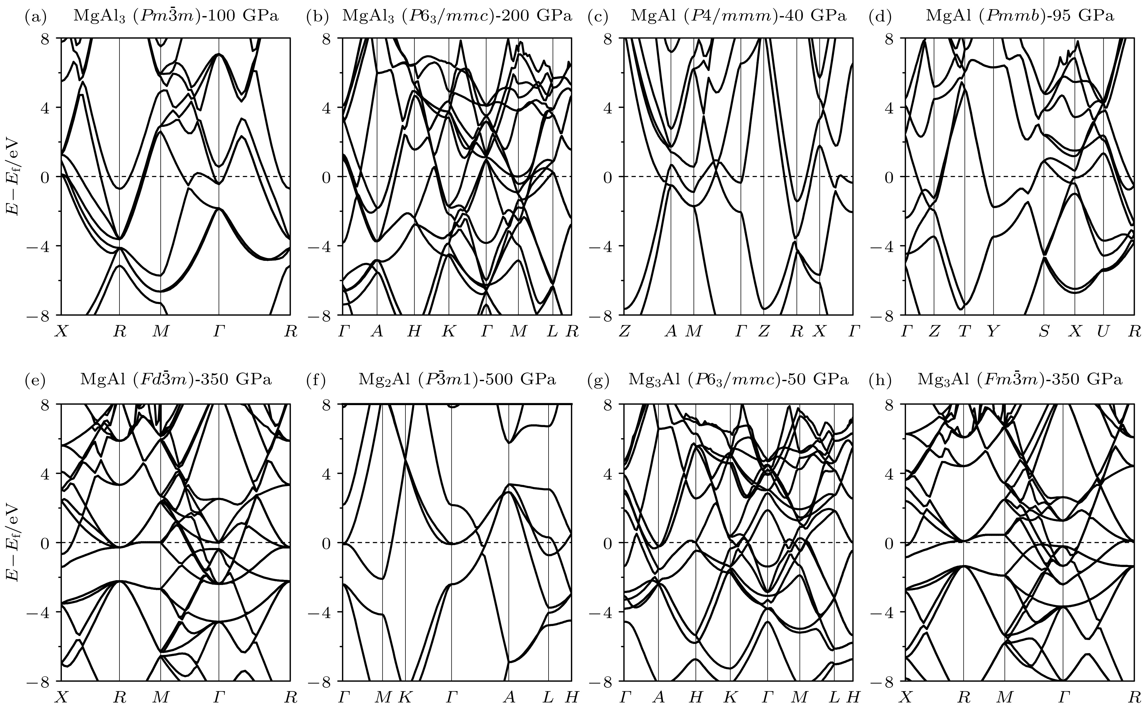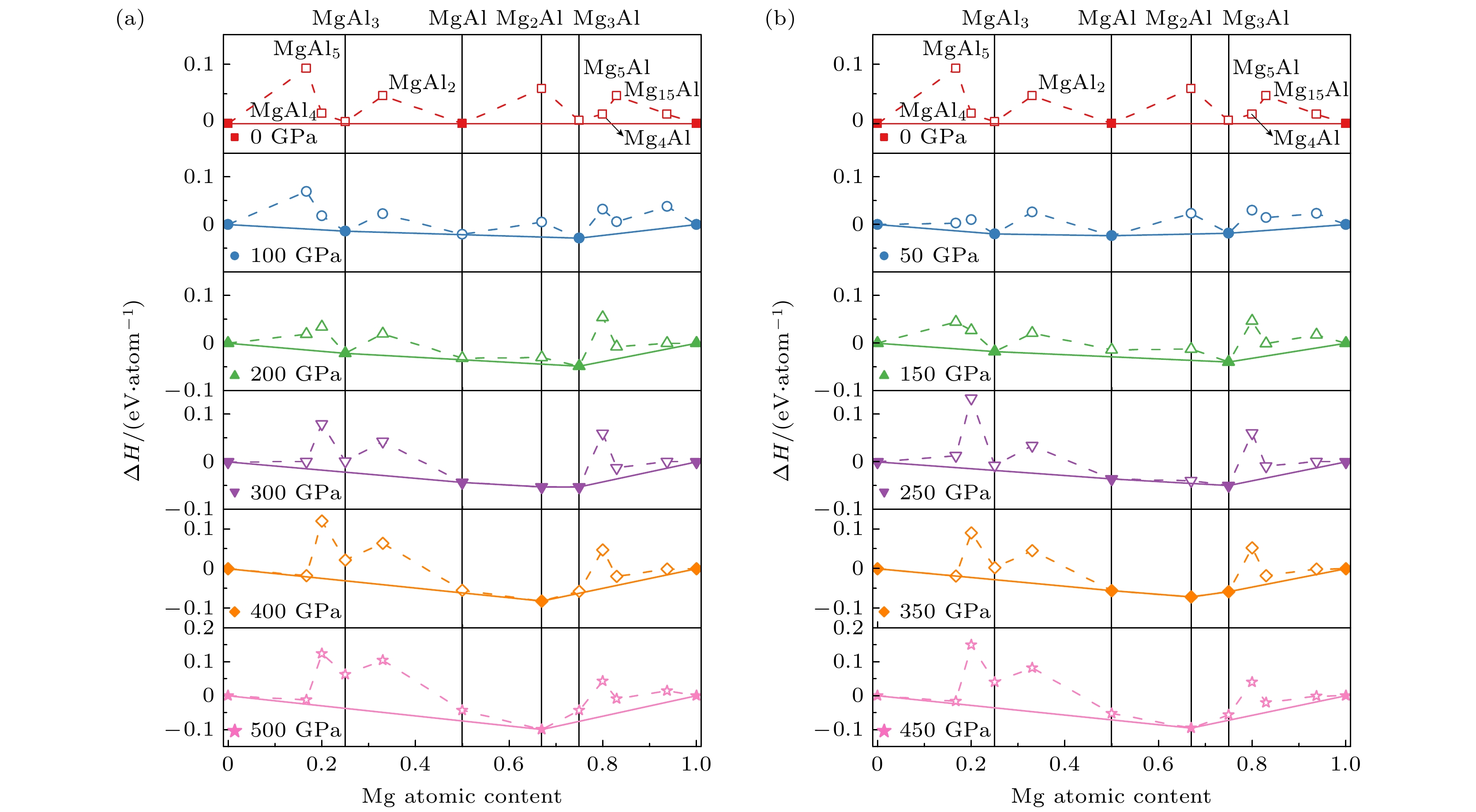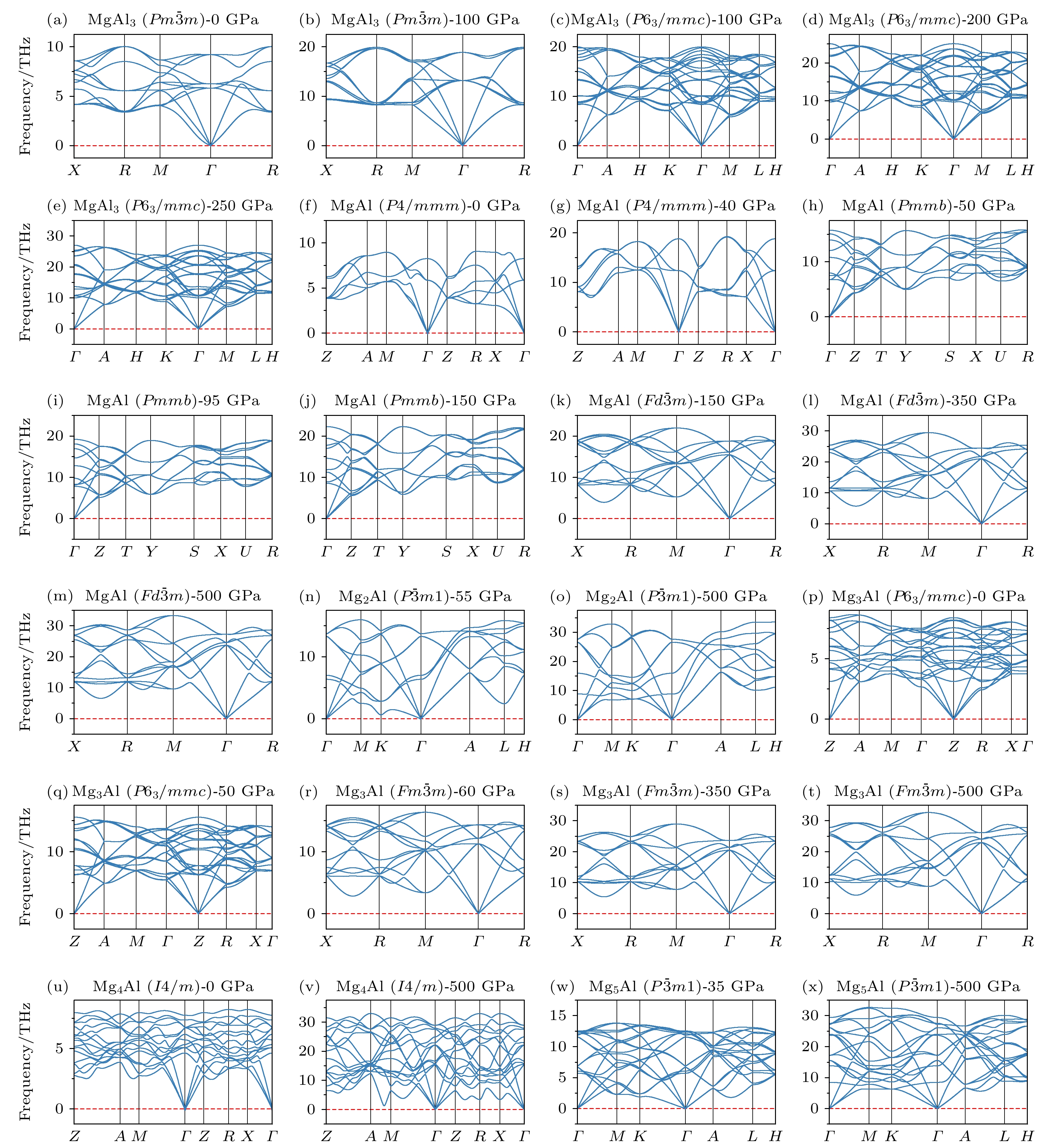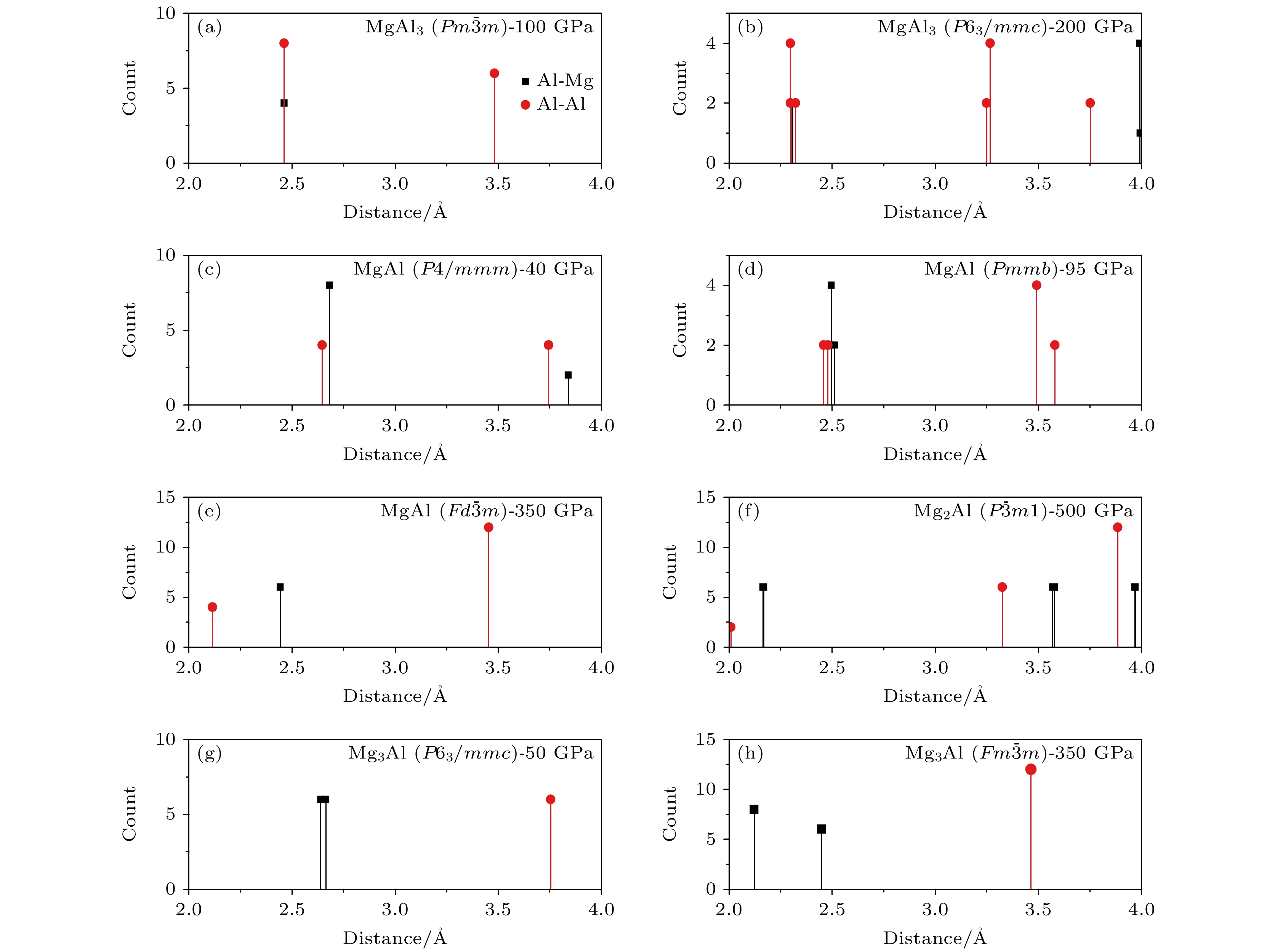 Magnesium and aluminum are abundant metals in the Earth’s crust and widely utilized in industrial engineering. Under high pressure, these elements can form elemental compounds into single substances, resulting in a variety of crystal structures and electronic properties. In this study, the possible structures of magnesium-aluminum alloys are systematically investigated in a pressure range of 0–500 GPa by using the first-principles structure search method, with energy and electronic structure calculations conducted using the VASP package. Bader charge analysis elucidates atomic and interstitial quasi-atom (ISQ) valence states, while lattice dynamics are analyzed using the PHONOPY package via the small-displacement supercell approach. Eight stable phases(MgAl3-Pm${\bar {3}} $m, MgAl3-P63/mmc, MgAl-P4/mmm, MgAl-Pmmb, MgAl-Fd${\bar {3}} $m, Mg2Al-P${\bar {3}} $m1, Mg3Al-P63/mmc, Mg3Al-Fm${\bar {3}} $m) and two metastable phases (Mg4Al-I4/m, Mg5Al-P${\bar {3}} $m1) are identified. The critical pressures and stable intervals for phase transitions are precisely determined. Notably, MgAl-Fd${\bar {3}} $m, Mg2Al-P${\bar {3}} $m1, Mg4Al-I4/m and Mg5Al-P${\bar {3}} $m1 represent newly predicted structures. Analysis of electronic localization characteristics reveals that six stable structures (MgAl3-Pm${\bar {3}} $m, MgAl3-P63/mmc, MgAl-Pmmb, MgAl-Fd${\bar {3}} $m, Mg2Al-P${\bar {3}} $m1 and Mg3Al-P63/mmc) exhibit electronic properties of electrides. The ISQs primarily originate from charge transfer of Mg atoms. In the metastable phase Mg4Al-I4/m, Al atoms are predicted to achieve an Al5–valence state, filling the p shell. This finding demonstrates that by adjusting the Mg/Al ratio and pressure conditions, a transition from traditional electrides to high negative valence states can be realized, offering new insights into the development of novel high-pressure functional materials. Furthermore, all Mg-Al compounds display metallic behaviors, with their stability attributed to Al-p-d orbital hybridization, which significantly contributes to the Al-3p/3d orbitals near the Fermi level. Additionally, LA-TA splitting is observed in MgAl3-Pm${\bar {3}} $m, with a splitting value of 45.49 cm–1, confirming the unique regulatory effect of ISQs on lattice vibrational properties. These results elucidate the rich structural and electronic properties of magnesium-aluminum alloys as electrodes, offering deeper insights into their behavior under high pressure and inspiring further exploration of structural and property changes in high-pressure alloys composed of light metal elements and p-electron metals.