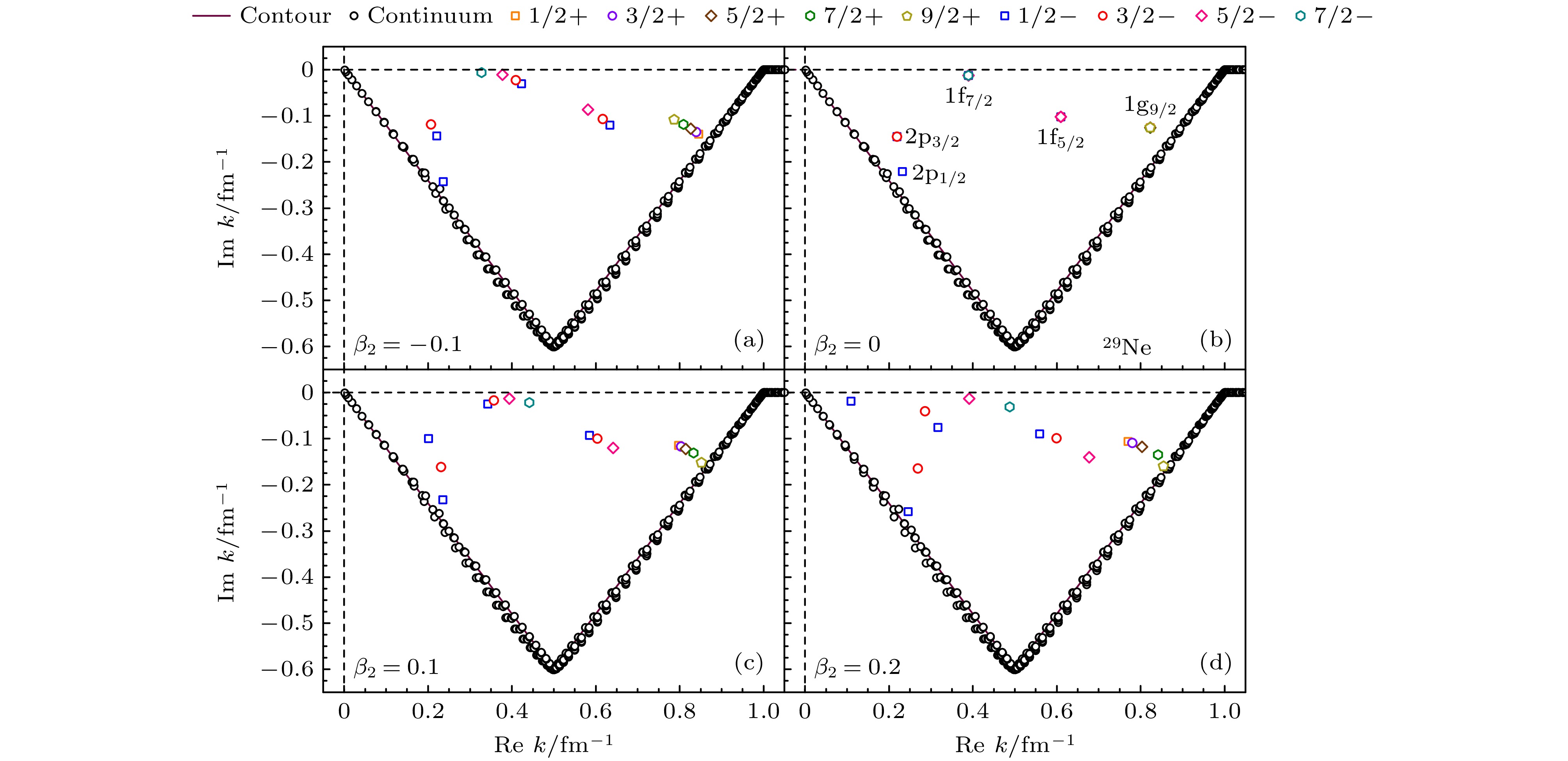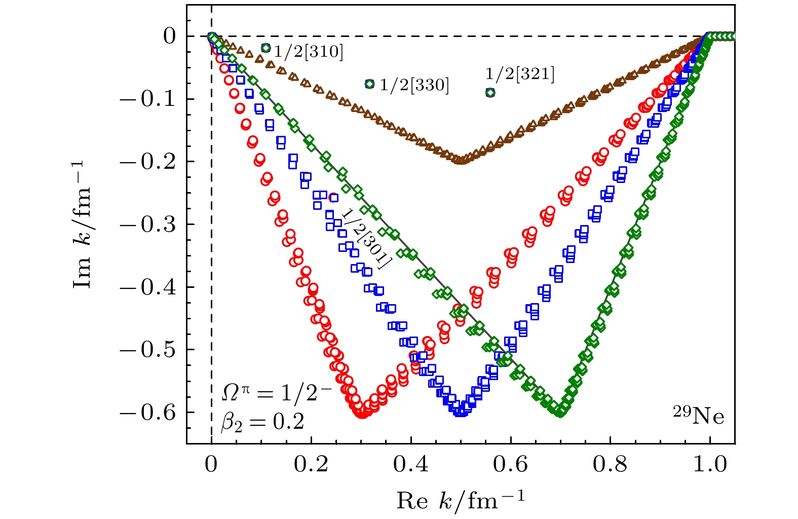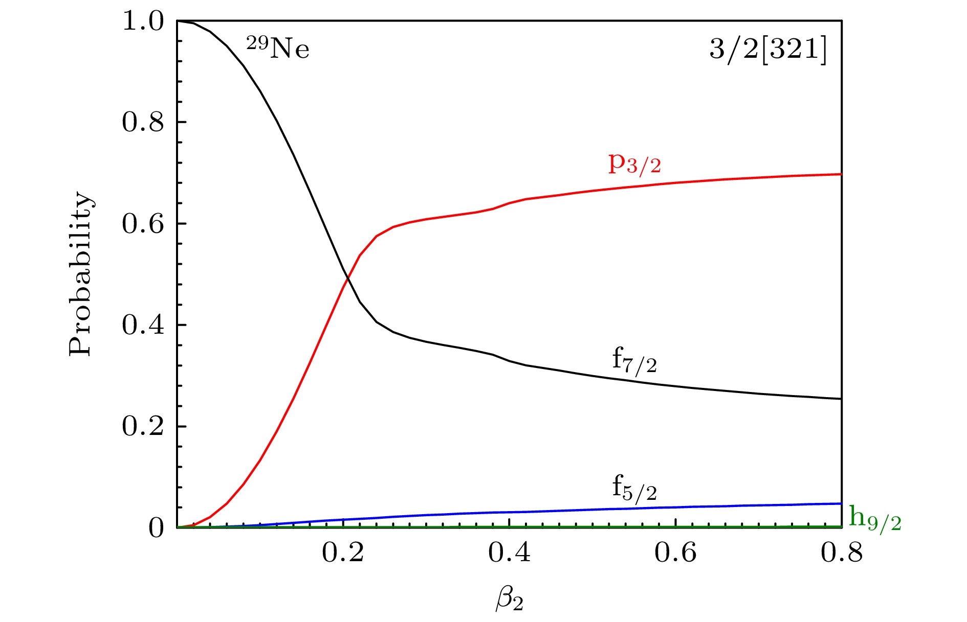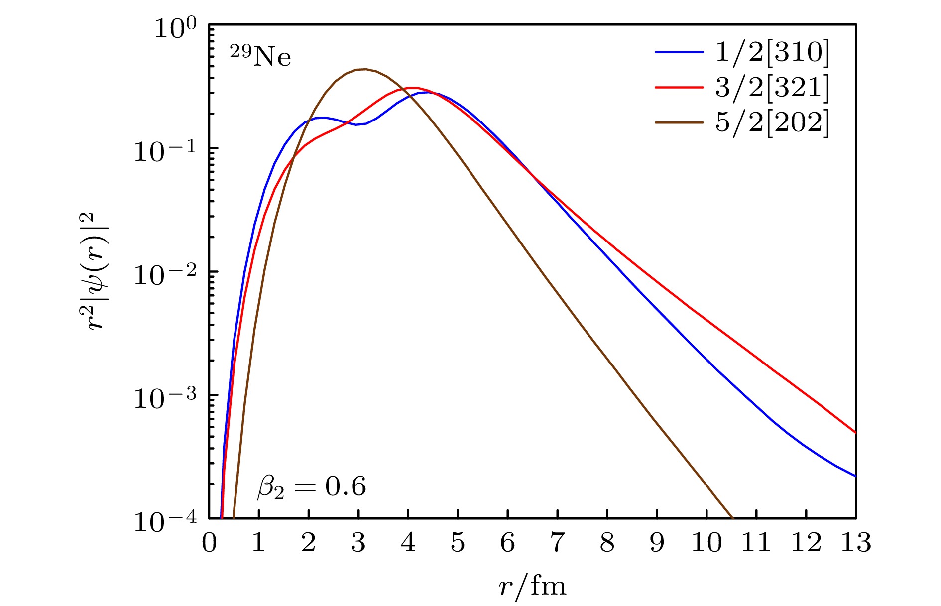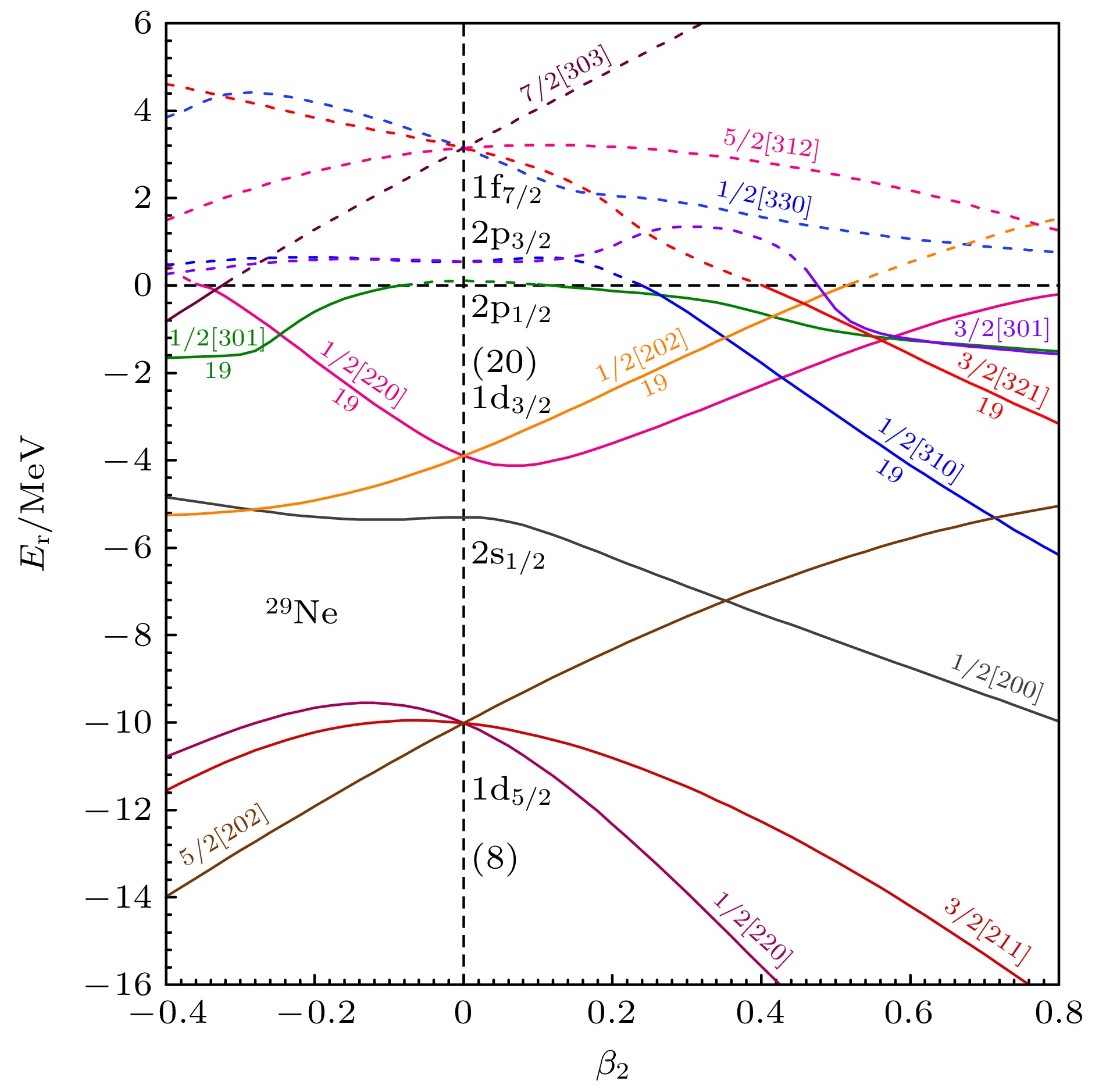 The neutron-rich nucleus 29Ne, located in the $N = 20$ “island of inversion” challenges traditional shell-model predictions by exhibiting a ground-state valence neutron configuration primarily influenced by the $2{\mathrm{p}}_{3/2}$ orbital rather than the anticipated $1{\mathrm{f}}_{7/2}$ orbital. This study aims to reveal the mechanisms behind this shell inversion and explore the potential halo structure in 29Ne, by using the interplay between weak binding, deformation, and low-$\ell$ orbital occupancy.The complex-momentum representation (CMR) method is used within a relativistic framework by integrating relativistic mean-field (RMF) theory with Woods-Saxon potentials to describe bound states, resonances, and continuum states. The model combines quadrupole deformation (β2) to analyze single-particle energy evolution, orbital mixing, and radial density distribution. Key parameters are calibrated based on experimental data, including binding energy and neutron separation energy.The key results are presented below.1) Shell inversion: In the spherical limit ($\beta_2 = 0$), the $2{\mathrm{p}}_{1/2}$ and $2{\mathrm{p}}_{3/2}$ orbitals drop below the $1{\mathrm{f}}_{7/2}$ orbital, confirming the collapse of the $N = 20$ shell gap.2) Deformation-driven halo: For β2 ≥ 0.58, the valence neutrons occupy 3/2[321] orbital (derived from 1f7/2), but due to strong l-mixing, the p3/2 component accounts for 68%. This orbital exhibits a diffuse radial density distribution, indicating a halo structure.3) Experimental consistency: The predicted ground-state spin-parity ($3/2^-$) and low separation energy (~1 MeV) align with measurements, supporting 29Ne as a deformation-induced halo.From this study, some conclusions are obtained as shown below. The 29Ne’s anomalous structure arises from the synergy of p-wave dominance and quadrupole deformation, which reduces centrifugal barriers and enhances spatial dispersion. The CMR method provides a unified description of bound and resonant states, offering new insights into the island of inversion and halo formation. Future work will include pairing correlations and experimental validation of density distributions.This work advances the understanding of exotic nuclear structures near drip lines and highlights the role of deformation in halo phenomena, which is of great significance for future experiments detecting neutron-rich nuclei.