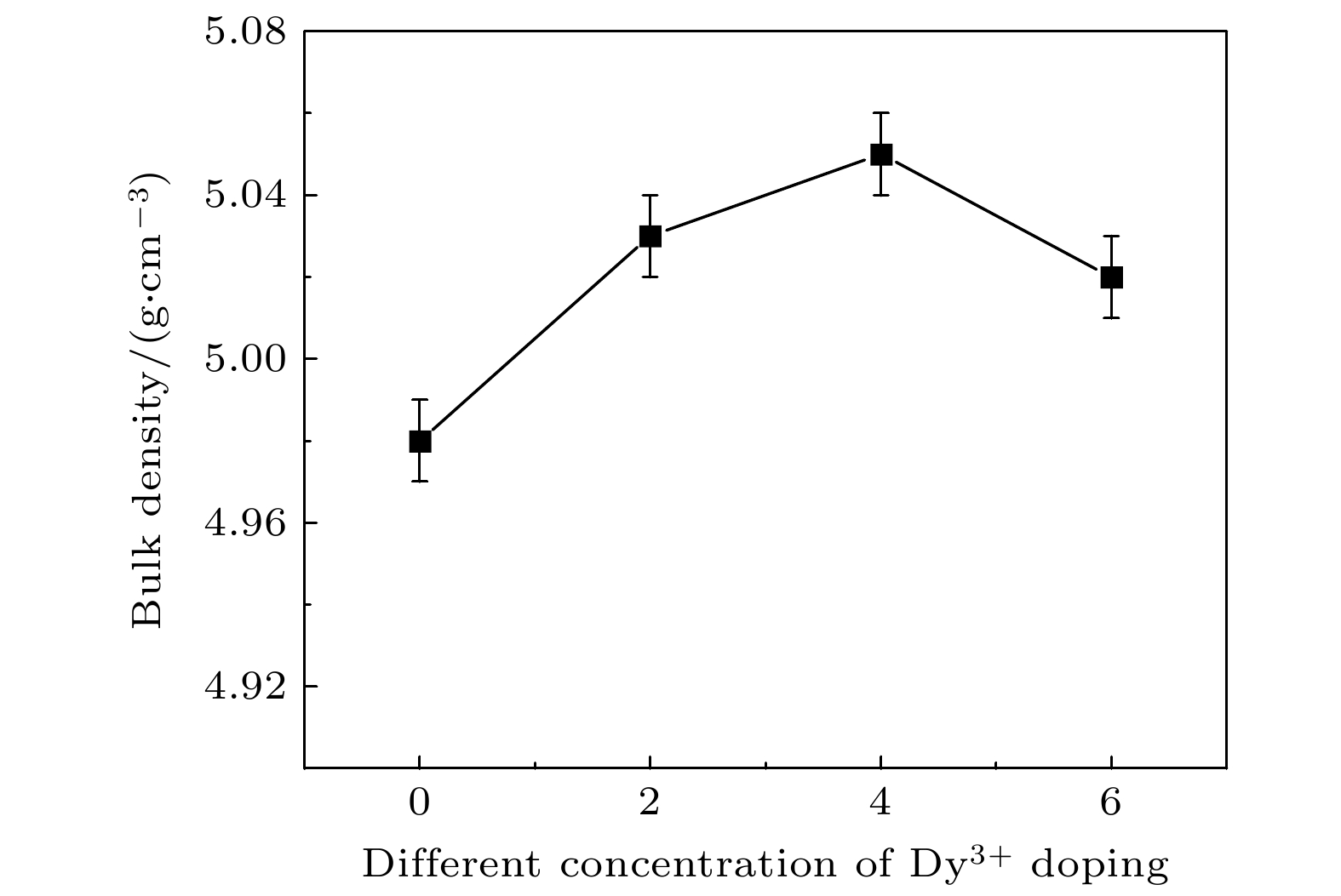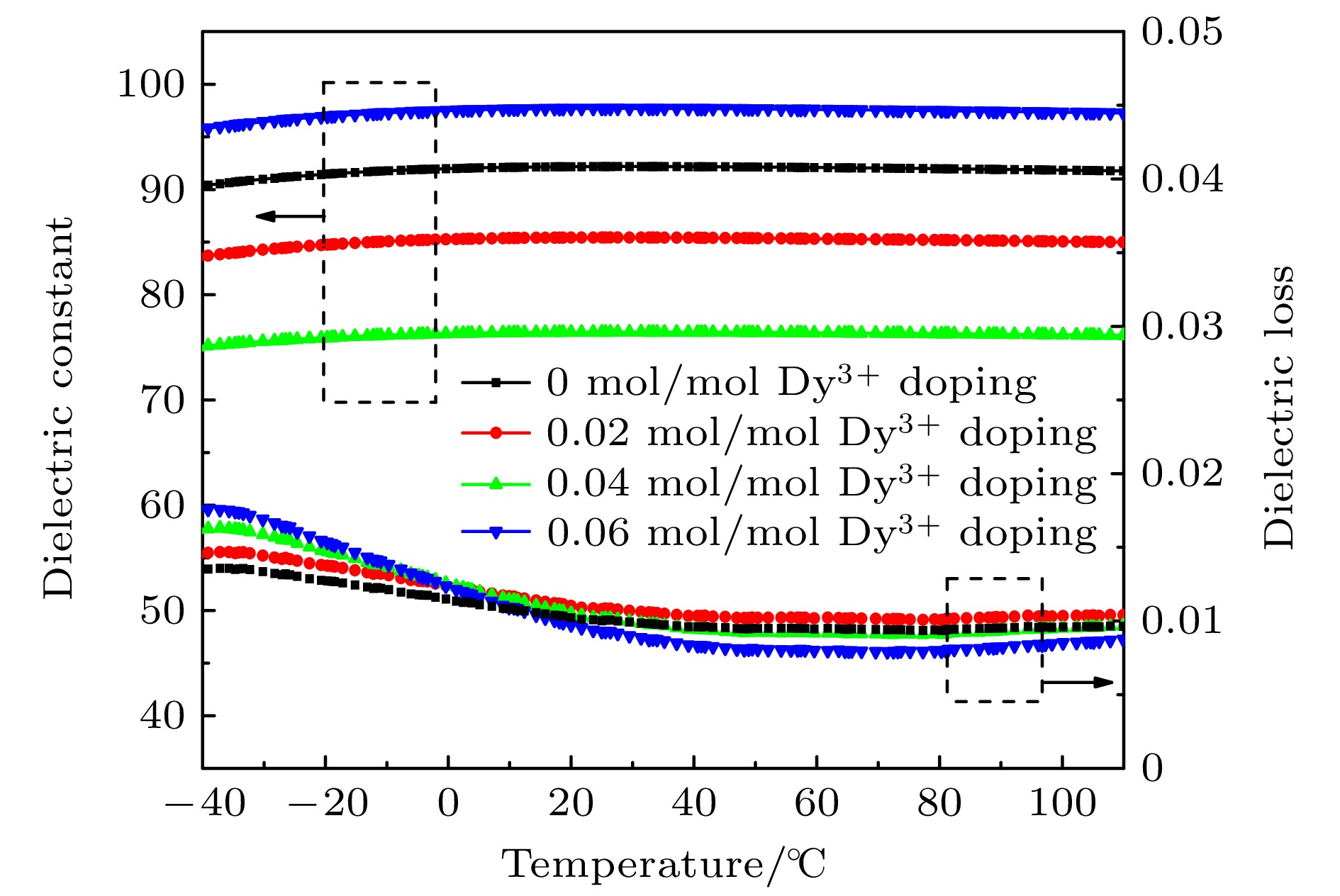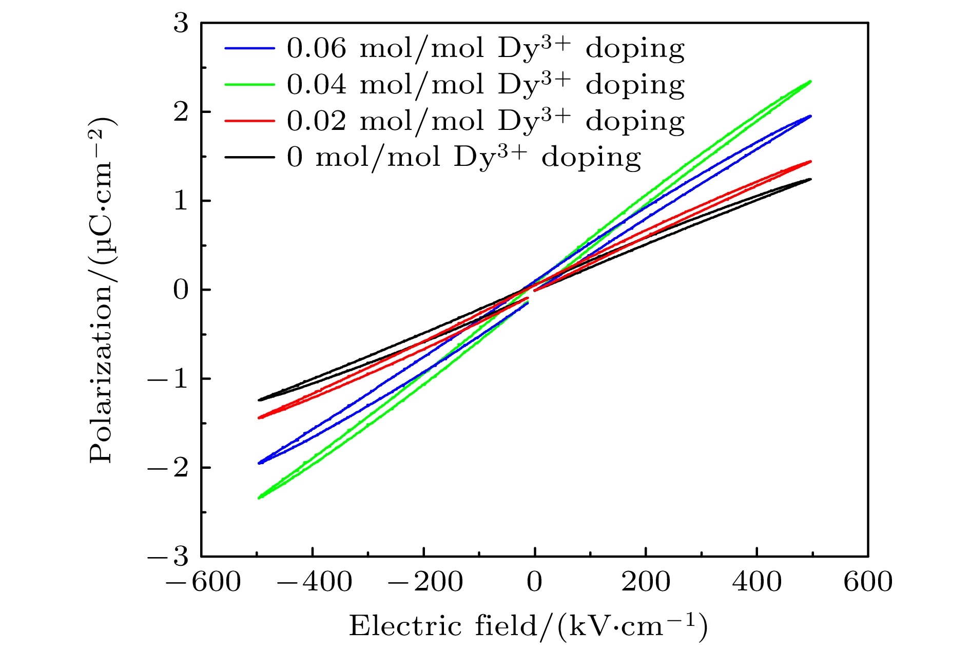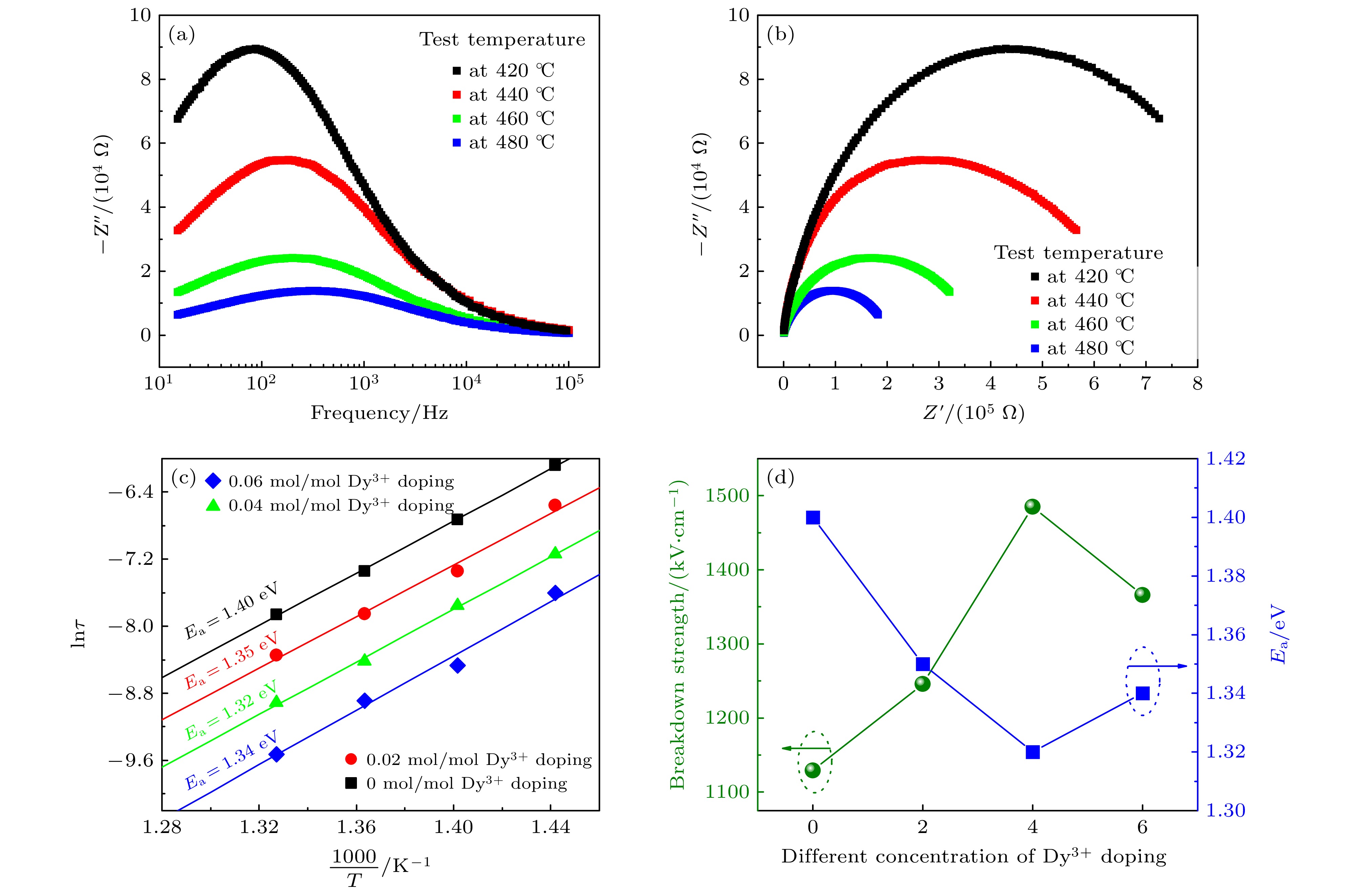 Dielectric glass ceramics that combine high power density and high energy density have important application value in achieving lightweight, miniaturization, and integration of pulse power devices. Compared with dielectric ceramics and polymers, dielectric glass-ceramics are composites consisting of a ceramic phase dispersed within a glass phase. Through the high-temperature melting, rapid cooling, and specific-temperature crystallization, the ceramic phase becomes uniformly distributed within the dense glass matrix, resulting in a composite structure characterized by low porosity, uniform grain size, and high density. Owing to the introduction of the high-dielectric-constant ceramic phase, the glass-ceramics exhibit excellent dielectric response. Furthermore, the pore-free, continuous, and highly insulating glass matrix effectively enhances the overall breakdown resistance of the material. Different molar concentrations of rare earth Dy3+ doped BaO-Na2O-Nb2O5 based glass ceramics are prepared using high-temperature melting combined with temperature-controlled crystallization process. The raw materials of glass ceramics are weighed according to the stoichiometric ratio and homogeneously mixed using a ball mill. The thoroughly mixed raw materials are placed in a high-temperature glass furnace and melted at 1550 ℃ for 2.5 h to ensure complete fusion. The melt is then rapidly cast into a preheated metal mold to obtain bulk glasses. These glasses are annealed at 650 ℃ for 3 h to relieve residual stresses. Subsequently, the transparent bulk glass blocks are cut into thin slices. Finally, these slices are heat-treated at 1100 ℃ for 3 h. Upon cooling, Dy3+ doped -based glass-ceramics with varying molar concentrations of the rare-earth ion are obtained. The effects of different molar concentrations of rare earth Dy3+ doping on the microstructure, crystallization behavior, and dielectric energy storage performance of BaO-Na2O-Nb2O5 based glass ceramics are systematically studied. The test results show that rare earth Dy3+ doping has almost no effect on the phase structure of BaO-Na2O-Nb2O5 based glass ceramics. Moderate rare earth Dy3+ doping can effectively promote the precipitation of Ba2NaNb5O15 ceramic phase in tungsten bronze structure, while improving the crystallinity of glass ceramics and increasing the dielectric constant of glass ceramics. In addition, rare earth Dy3+ doping also has the effect of inhibiting the growth of glass ceramic grains, which can improve the breakdown strength of BaO-Na2O-Nb2O5 based glass ceramics. When the rare earth Dy3+ doping molar concentration is 0.04 mol/mol, the dielectric constant of BaO-Na2O-Nb2O5 based glass ceramic is 97.0, the breakdown strength reaches 1485 kV/cm, and the highest energy storage density arrives at 8.01 J/cm3, which is 1.87 times that of undoped glass ceramics. This result provides experimental basis and technical reference for improving the performance of glass ceramic materials in the field of energy storage.