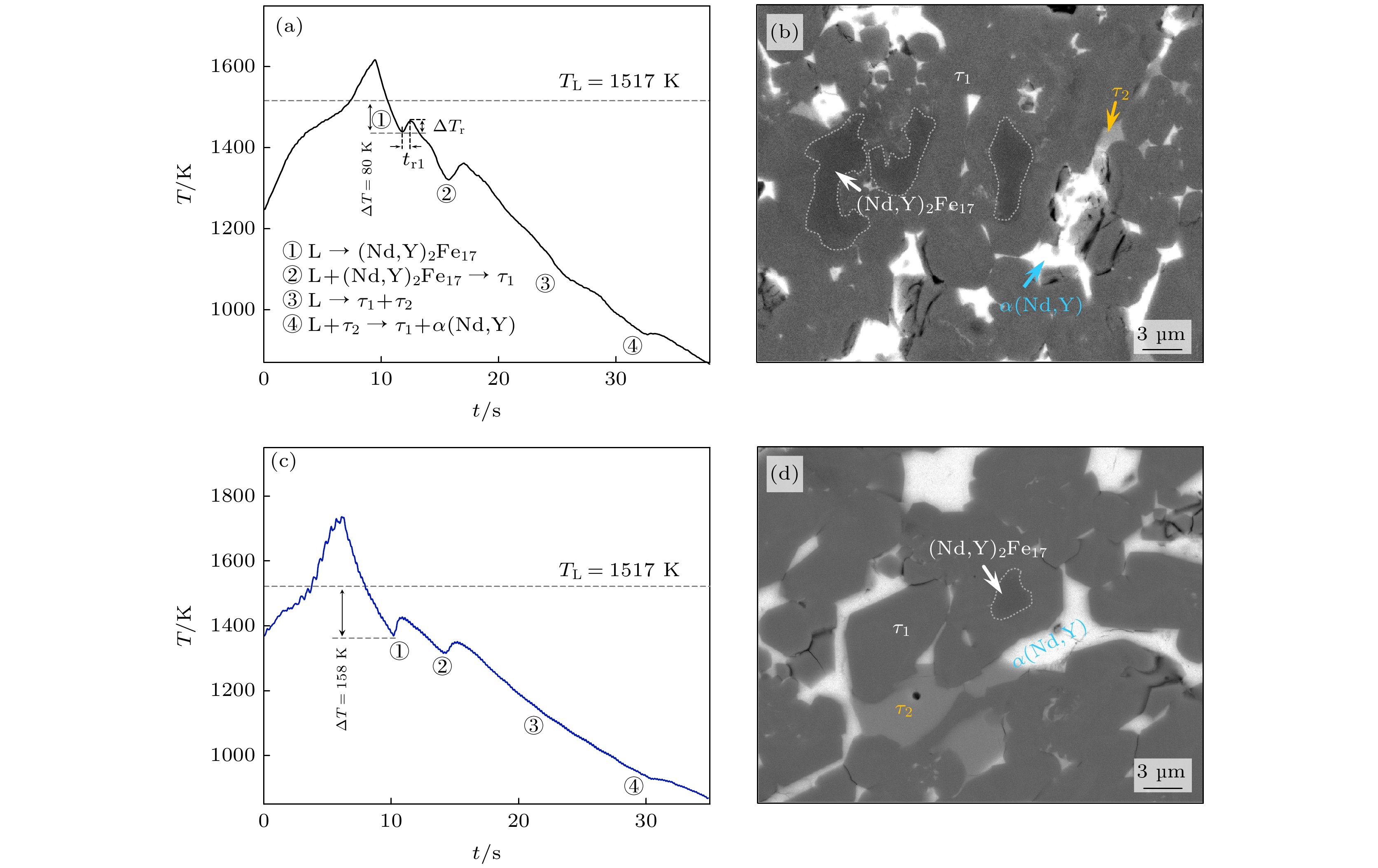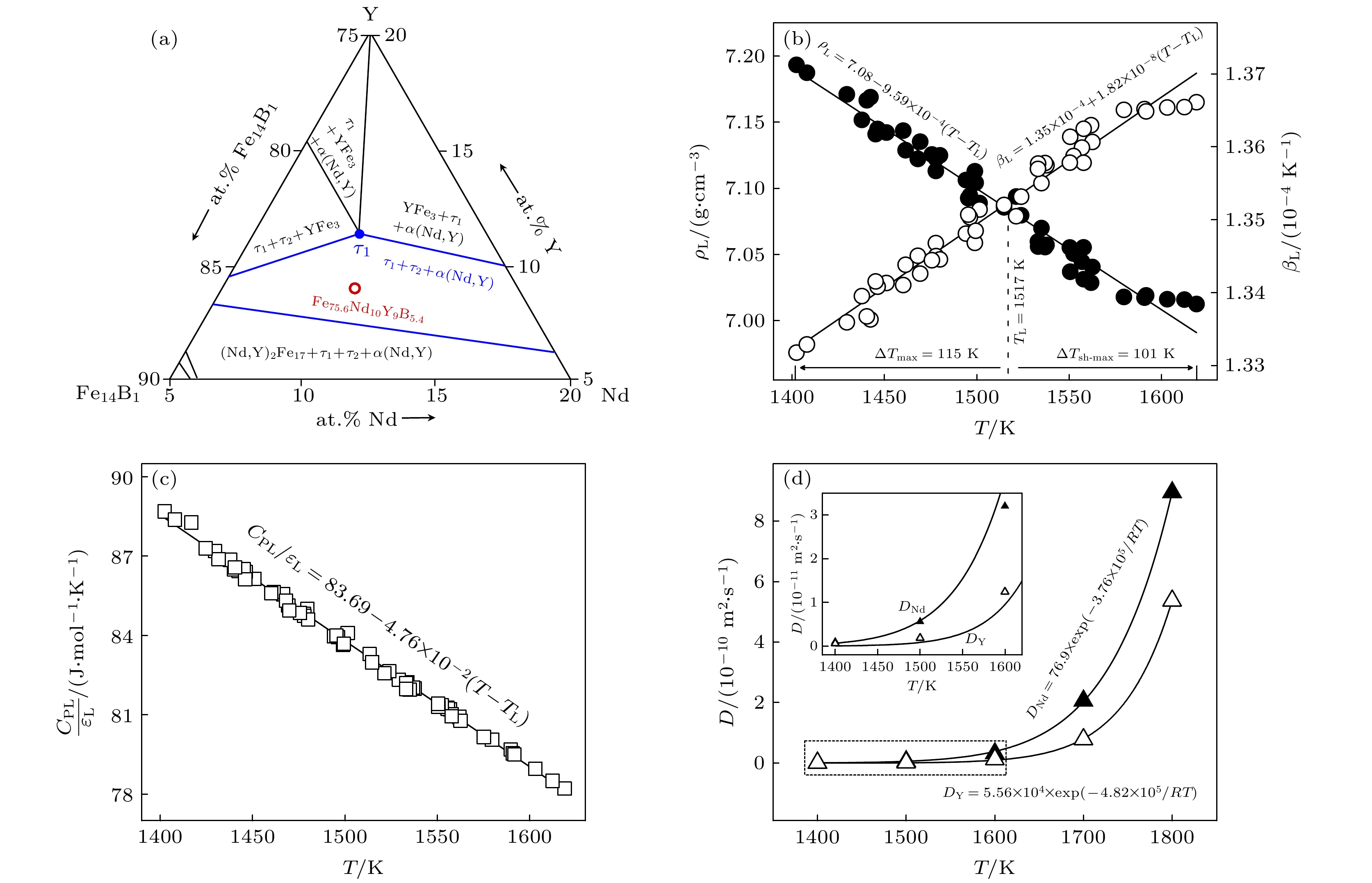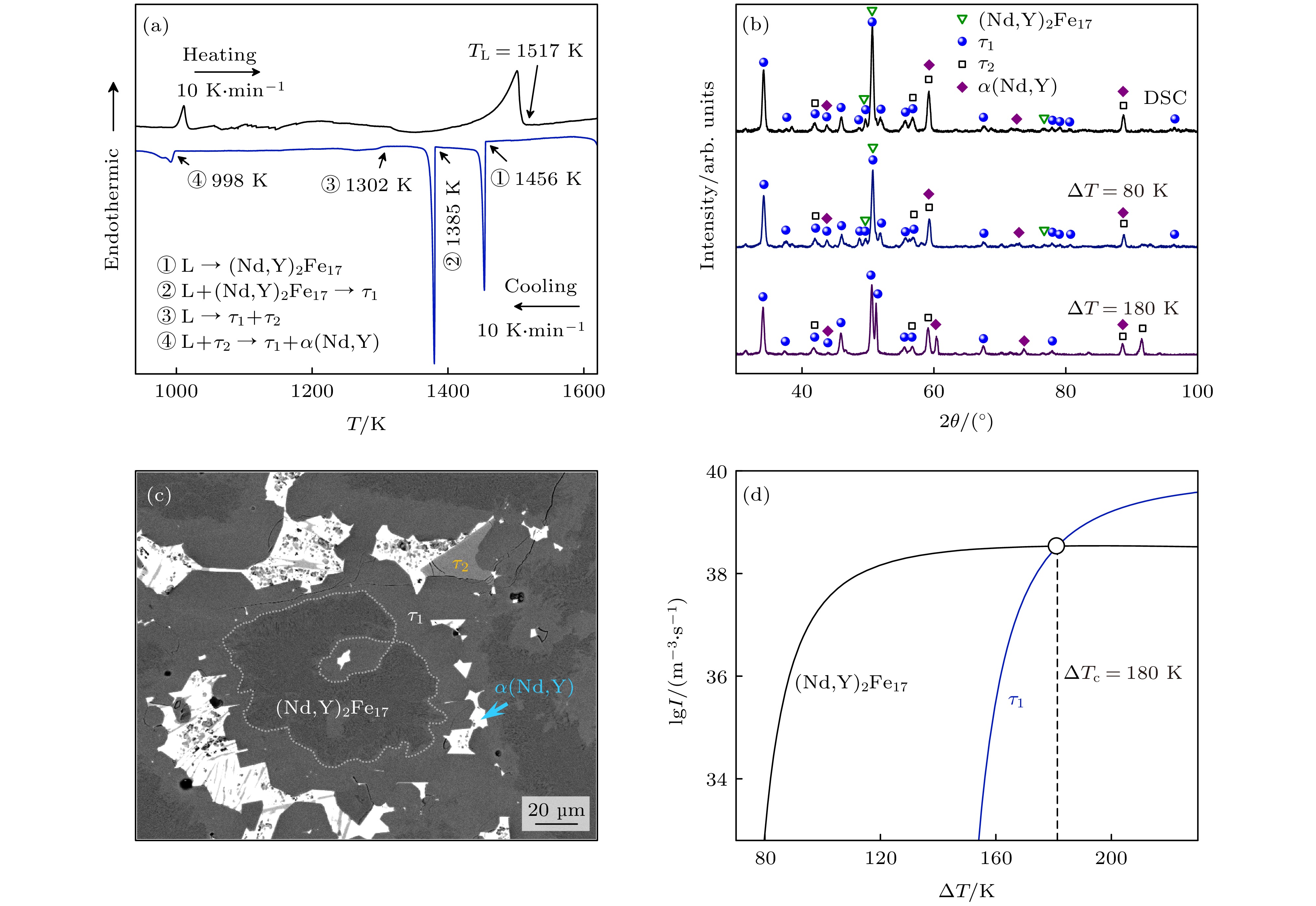 The metastable and stable liquid state thermophysical properties and rapid solidification mechanism of quaternary Fe75.6Nd10Y9B5.4 alloy with a maximum undercooling temperature of 221 K (0.14TL) are investigated using electrostatic levitation technique. The measured results indicate that the density, thermal expansion coefficient and the ratio of specific heat to emissivity of the liquid alloy comply with linear functional relationship with temperature in the range of 1402–1618 K. Molecular dynamics (MD) simulations show that the diffusion coefficients of Nd and Y elements decrease exponentially with temperature decreasing, with the former exhibiting a larger diffusion coefficient at the same temperature. When the liquid undercooling rises from 80 to 158 K, the growth velocity of primary (Nd,Y)2Fe17 phase dendrites increases from 3.8 to 5.7 mm·s–1, while exhibiting significant grain refinement effect. Meanwhile, the increased undercooling also promotes peritectic transformation, leading the volume fraction of peritectic τ1-(Nd,Y)2Fe14B phase to reach up to 75%. Once the undercooling reaches 180 K, the former peritectic τ1 phase, rather than the primary (Nd,Y)2Fe17 phase, becomes the leading phase, which nucleates and grows directly from the undercooled liquid alloy, and its growth velocity increases with undercooling from 2.6 to 11.0 mm·s–1. The calculation results of formation enthalpy show that the solid solution of the Y element can enhance the thermodynamic stability of the (Nd,Y)2Fe17 phase and the τ1 phase, thereby explaining the reason why the content of Y element in both phases is significantly higher than that of Nd element. Nevertheless, the content of Nd element in the τ1 phase slightly increases because its diffusion ability is stronger than that of Y if undercooling is higher than 180 K.