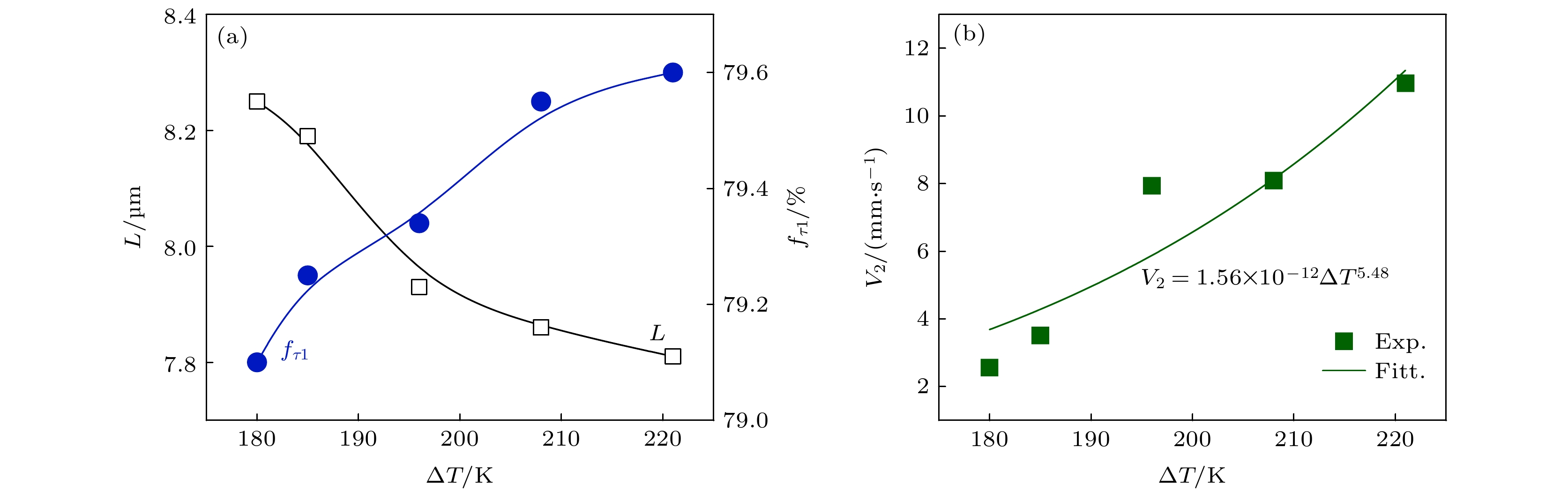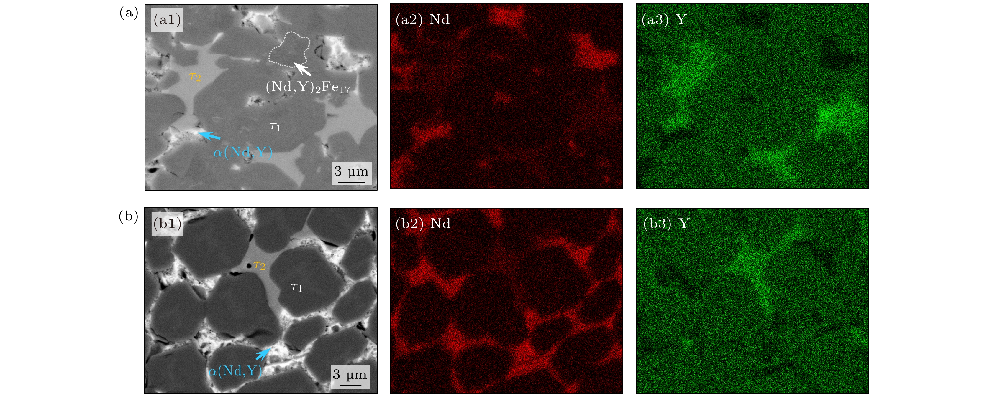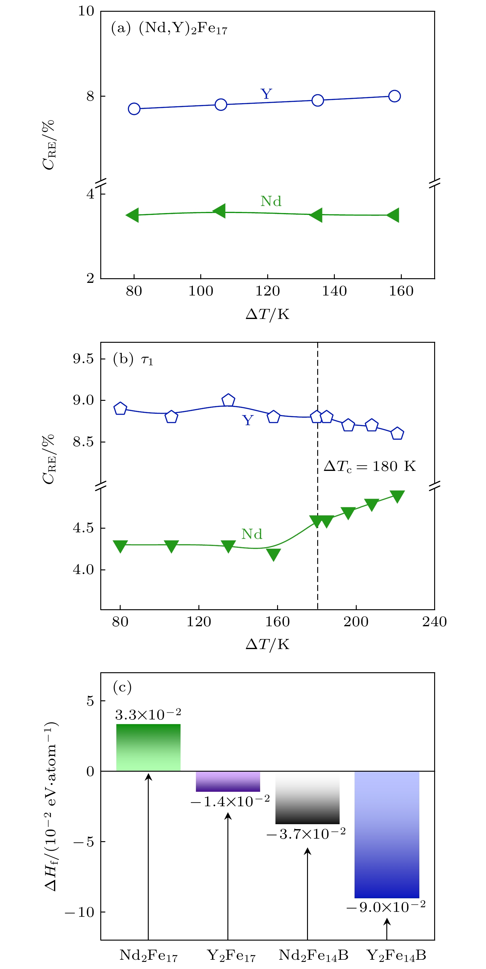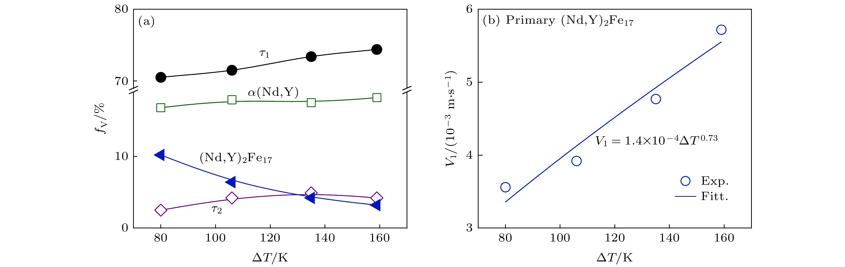 The metastable and stable liquid state thermophysical properties and rapid solidification mechanism of quaternary Fe75.6Nd10Y9B5.4 alloy with a maximum undercooling temperature of 221 K (0.14TL) are investigated using electrostatic levitation technique. The measured results indicate that the density, thermal expansion coefficient and the ratio of specific heat to emissivity of the liquid alloy comply with linear functional relationship with temperature in the range of 1402–1618 K. Molecular dynamics (MD) simulations show that the diffusion coefficients of Nd and Y elements decrease exponentially with temperature decreasing, with the former exhibiting a larger diffusion coefficient at the same temperature. When the liquid undercooling rises from 80 to 158 K, the growth velocity of primary (Nd,Y)2Fe17 phase dendrites increases from 3.8 to 5.7 mm·s–1, while exhibiting significant grain refinement effect. Meanwhile, the increased undercooling also promotes peritectic transformation, leading the volume fraction of peritectic τ1-(Nd,Y)2Fe14B phase to reach up to 75%. Once the undercooling reaches 180 K, the former peritectic τ1 phase, rather than the primary (Nd,Y)2Fe17 phase, becomes the leading phase, which nucleates and grows directly from the undercooled liquid alloy, and its growth velocity increases with undercooling from 2.6 to 11.0 mm·s–1. The calculation results of formation enthalpy show that the solid solution of the Y element can enhance the thermodynamic stability of the (Nd,Y)2Fe17 phase and the τ1 phase, thereby explaining the reason why the content of Y element in both phases is significantly higher than that of Nd element. Nevertheless, the content of Nd element in the τ1 phase slightly increases because its diffusion ability is stronger than that of Y if undercooling is higher than 180 K.