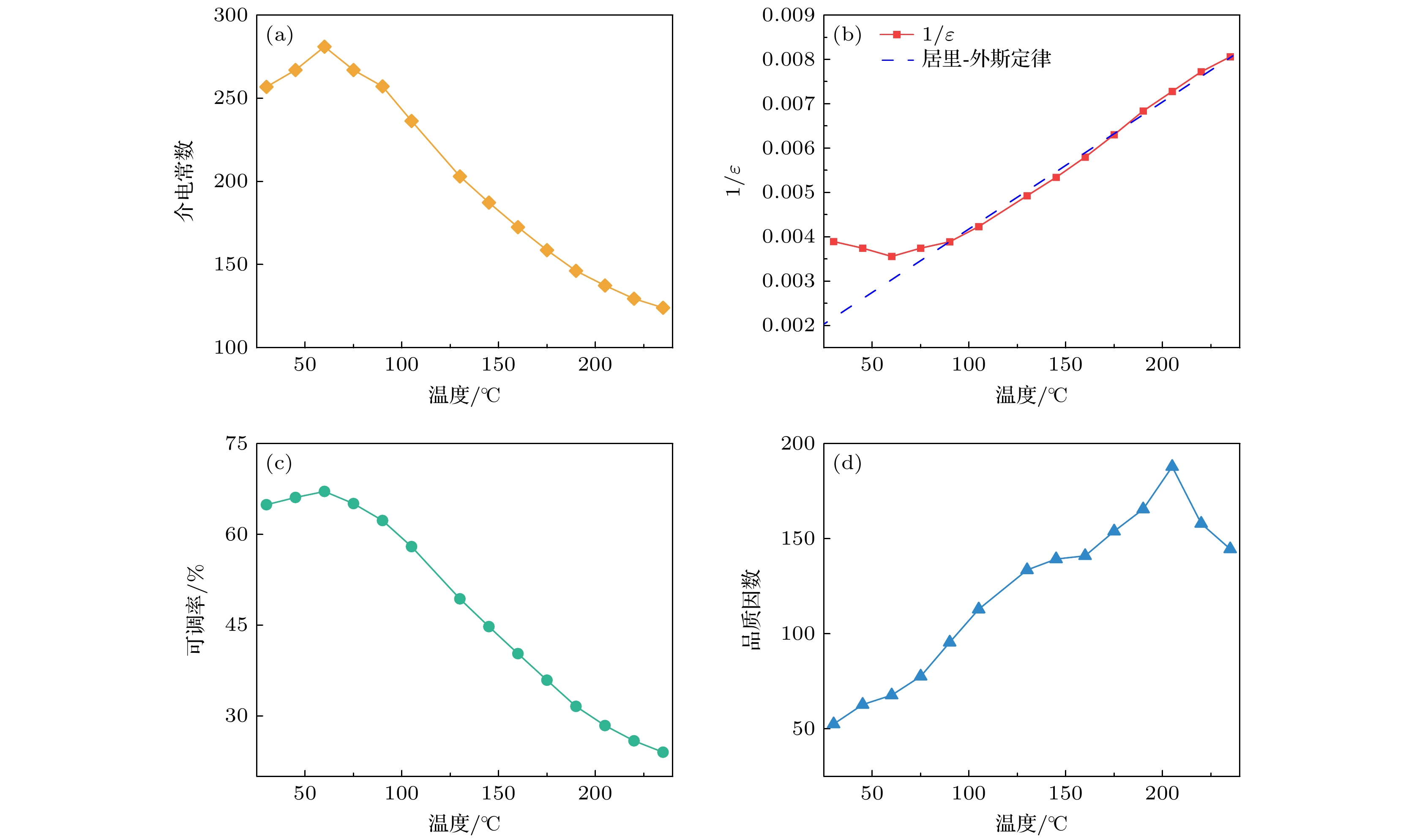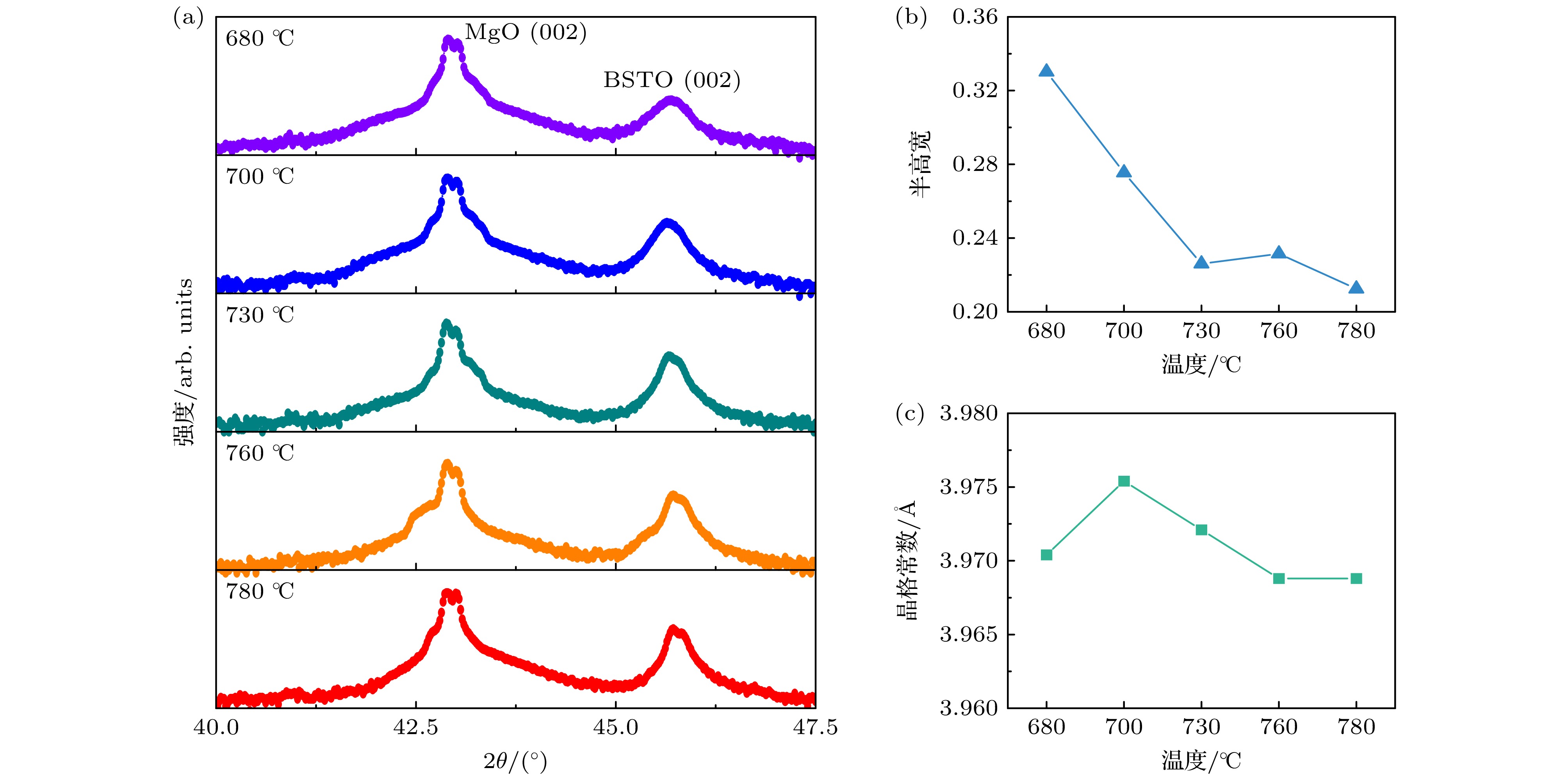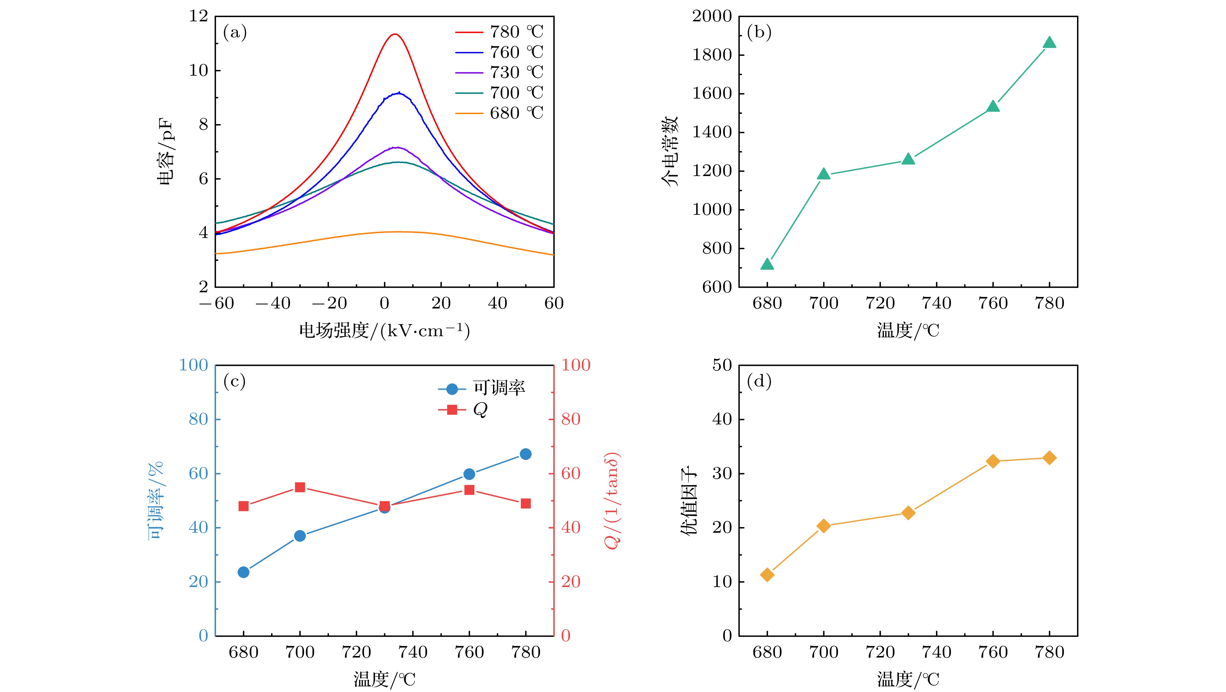 Microwave tunable devices are critical components in phased array antennas and RF front-ends, and essential for the precise controling of frequency, phase and amplitude. Although bulk dielectric ceramic materials are widely used in these devices, they pose challenges for integration. In contrast, dielectric thin films offer significant advantages, including easy integration, low cost, high tuning speed, low power consumption, compact size, and continuous tunability, making them more compatible with modern integrated circuit fabrication processes. Currently, a key prerequisite for designing devices based on dielectric thin films is the use of low-permittivity, low-loss substrates to mitigate their influence on the overall dielectric performance, while enhancing the crystalline quality of the films themselves. However, suitable substrates for epitaxial growth, such as MgO and Si, exhibit a significant lattice mismatch (>5%) with dielectric thin films. This poses a substantial challenge to achieving high-quality epitaxial growth, making it difficult to obtain dielectric thin films with both high tunability and low loss.To address this challenge, pulsed laser deposition (PLD) is used to provide high-energy, non-equilibrium growth conditions. By precisely controlling parameters such as substrate temperature and growth oxygen pressure, a suitable growth window that induce domain matching epitaxy (DME) mechanism can be determined, effectively adapting to mismatched strain, and thus successfully preparing high-performance Ba0.6Sr0.4TiO3 (BSTO) epitaxial thin films on MgO(001) substrates.To investigate the effect of substrate temperature on the properties of the BSTO thin films, a series of films is prepared on MgO(001) substrates at temperatures of 680 ℃, 700 ℃, 730 ℃, 760 ℃ and 780 ℃, while other growth conditions are kept constant. The study reveals that as the substrate temperature increases, the crystallinity, tunability, and figure of merit (FOM) of the films are significantly improved. The film grown at 780 ℃ shows a high tunability value of 67.2%, a quality (Q) factor of 49, and an FOM of 32.93. Compared with previously reported films, the Ba0.6Sr0.4TiO3 thin films prepared in this work demonstrate superior dielectric tunability and lower dielectric loss.To explore the thermal stability of the Ba0.6Sr0.4TiO3 thin film, its performance is characterized using Raman spectroscopy and Capacitance-Voltage measurements in a temperature range from 25 ℃ to 225 ℃. Raman spectra indicate that the lattice vibrational modes of the Ba0.6Sr0.4TiO3 film change with the increase of temperature. When temperature is in a range between 175 ℃ and 225 ℃, the film will completely transform from the tetragonal phase to the Raman-inactive cubic phase. At the same time, the nonlinear “butterfly” characteristic of the C-V curves vanishes due to the disappearance of ferroelectric domains. The dielectric constant and tunability reach their maximum values at approximately 60 ℃, then decrease, whereas the Q-factor reaches its peak at around 205 ℃. The motion of domain walls in films is constrained not only by internal stress fields and defects but also by strong pinning effects at the film-substrate interface and the free surface of the film.This research systematically analyzes the influences of surface morphology, crystal structure, and temperature on the dielectric properties of Ba0.6Sr0.4TiO3 epitaxial thin films. It lays a foundation for elucidating the broadband structure-property relationships of Ba1–xSrxTiO3 thin films and highlights their significant potential applications in tunable microwave devices.