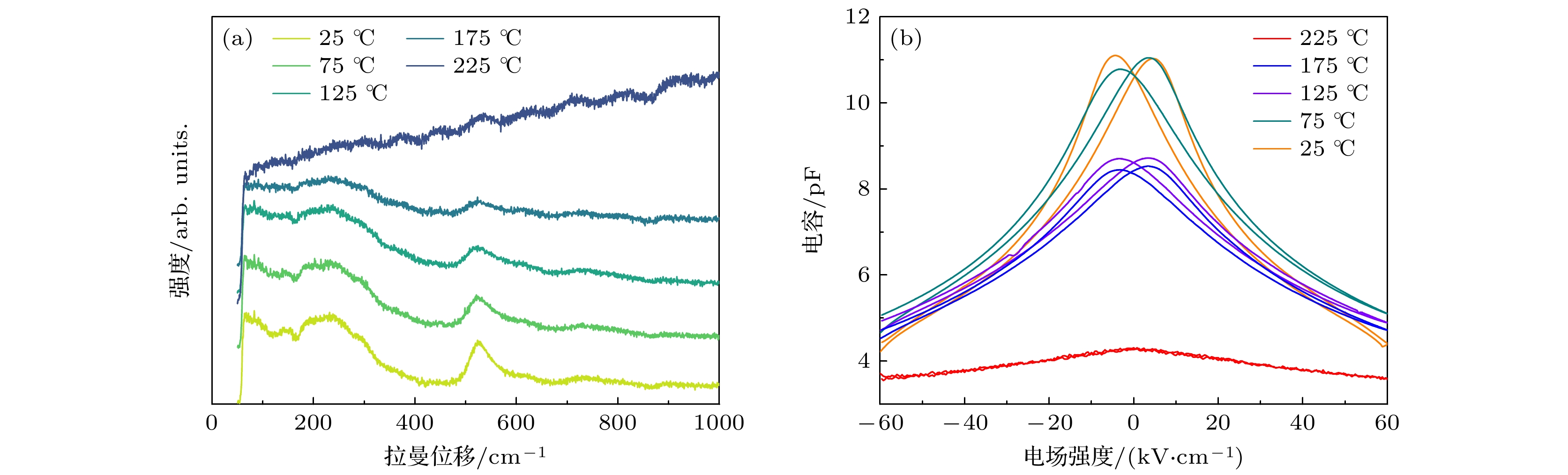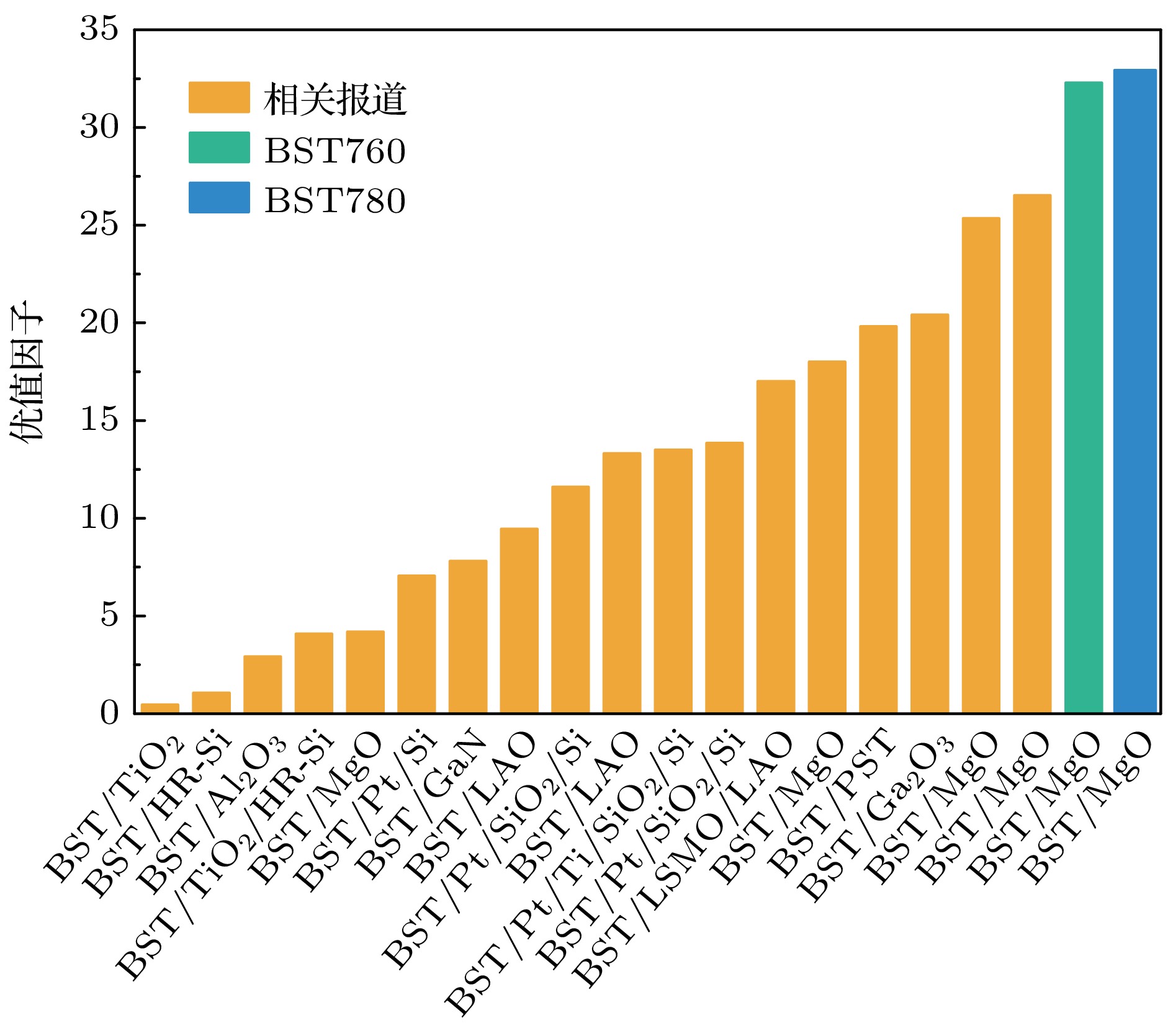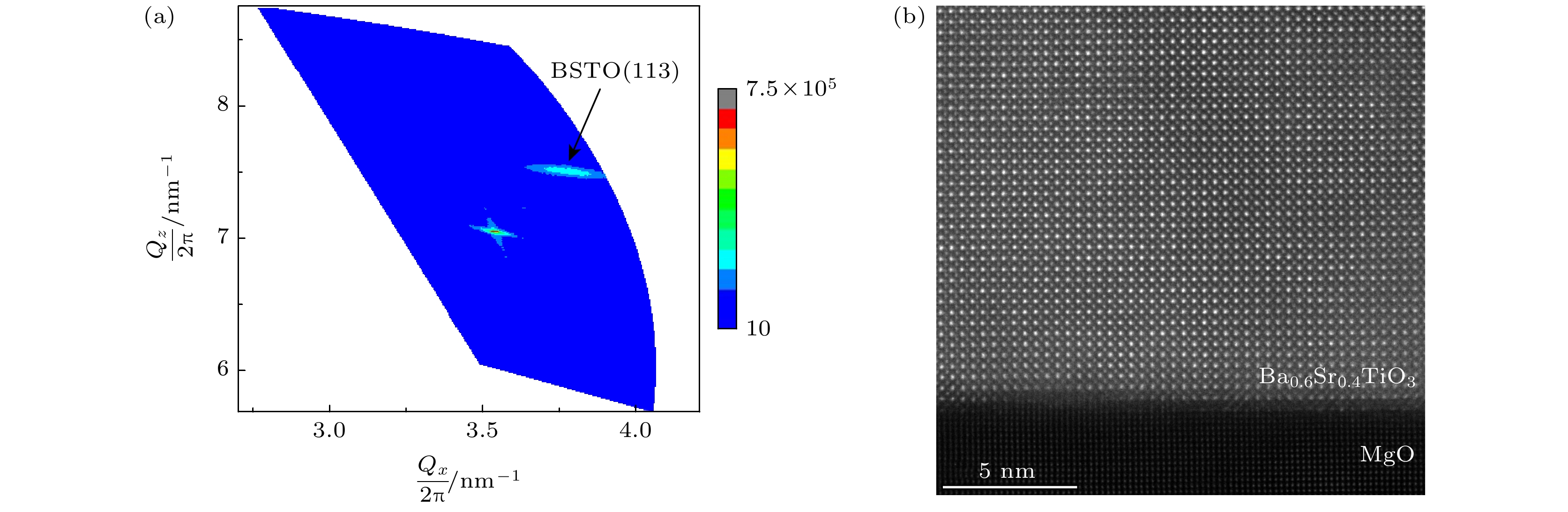 Microwave tunable devices are critical components in phased array antennas and RF front-ends, and essential for the precise controling of frequency, phase and amplitude. Although bulk dielectric ceramic materials are widely used in these devices, they pose challenges for integration. In contrast, dielectric thin films offer significant advantages, including easy integration, low cost, high tuning speed, low power consumption, compact size, and continuous tunability, making them more compatible with modern integrated circuit fabrication processes. Currently, a key prerequisite for designing devices based on dielectric thin films is the use of low-permittivity, low-loss substrates to mitigate their influence on the overall dielectric performance, while enhancing the crystalline quality of the films themselves. However, suitable substrates for epitaxial growth, such as MgO and Si, exhibit a significant lattice mismatch (>5%) with dielectric thin films. This poses a substantial challenge to achieving high-quality epitaxial growth, making it difficult to obtain dielectric thin films with both high tunability and low loss.To address this challenge, pulsed laser deposition (PLD) is used to provide high-energy, non-equilibrium growth conditions. By precisely controlling parameters such as substrate temperature and growth oxygen pressure, a suitable growth window that induce domain matching epitaxy (DME) mechanism can be determined, effectively adapting to mismatched strain, and thus successfully preparing high-performance Ba0.6Sr0.4TiO3 (BSTO) epitaxial thin films on MgO(001) substrates.To investigate the effect of substrate temperature on the properties of the BSTO thin films, a series of films is prepared on MgO(001) substrates at temperatures of 680 ℃, 700 ℃, 730 ℃, 760 ℃ and 780 ℃, while other growth conditions are kept constant. The study reveals that as the substrate temperature increases, the crystallinity, tunability, and figure of merit (FOM) of the films are significantly improved. The film grown at 780 ℃ shows a high tunability value of 67.2%, a quality (Q) factor of 49, and an FOM of 32.93. Compared with previously reported films, the Ba0.6Sr0.4TiO3 thin films prepared in this work demonstrate superior dielectric tunability and lower dielectric loss.To explore the thermal stability of the Ba0.6Sr0.4TiO3 thin film, its performance is characterized using Raman spectroscopy and Capacitance-Voltage measurements in a temperature range from 25 ℃ to 225 ℃. Raman spectra indicate that the lattice vibrational modes of the Ba0.6Sr0.4TiO3 film change with the increase of temperature. When temperature is in a range between 175 ℃ and 225 ℃, the film will completely transform from the tetragonal phase to the Raman-inactive cubic phase. At the same time, the nonlinear “butterfly” characteristic of the C-V curves vanishes due to the disappearance of ferroelectric domains. The dielectric constant and tunability reach their maximum values at approximately 60 ℃, then decrease, whereas the Q-factor reaches its peak at around 205 ℃. The motion of domain walls in films is constrained not only by internal stress fields and defects but also by strong pinning effects at the film-substrate interface and the free surface of the film.This research systematically analyzes the influences of surface morphology, crystal structure, and temperature on the dielectric properties of Ba0.6Sr0.4TiO3 epitaxial thin films. It lays a foundation for elucidating the broadband structure-property relationships of Ba1–xSrxTiO3 thin films and highlights their significant potential applications in tunable microwave devices.