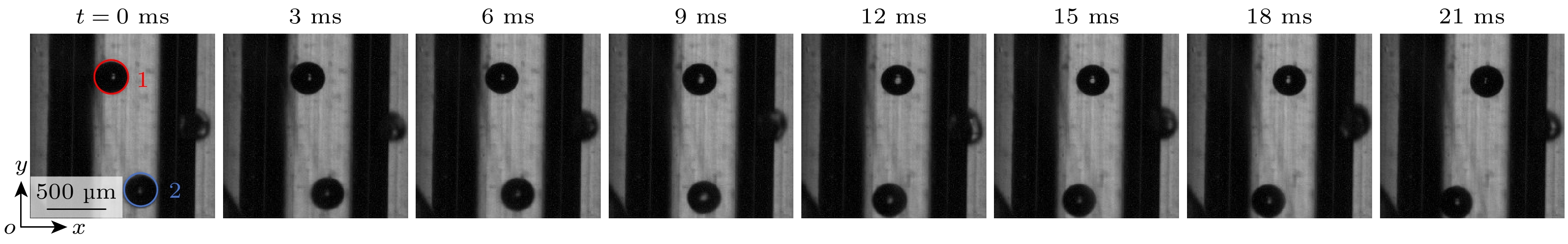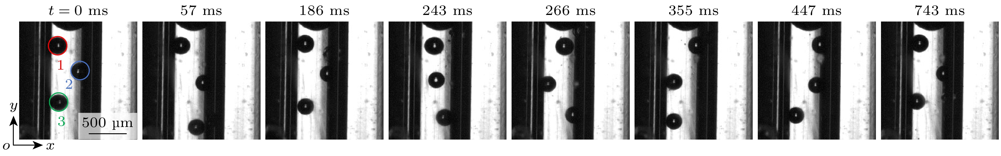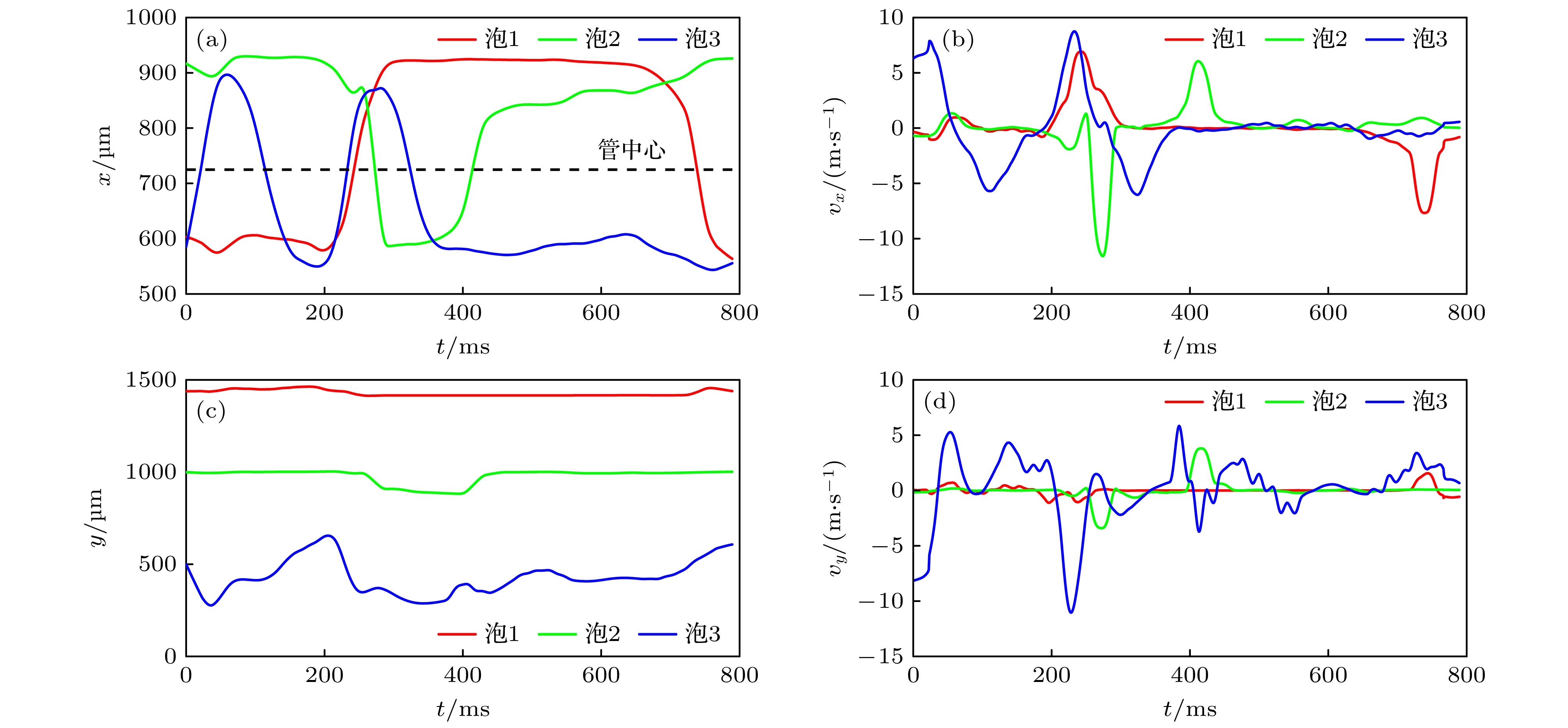 This study systematically investigates the bouncing behavior and dynamics of microbubbles under ultrasound excitation within a rigid capillary in order to offer quantitative insights into their oscillation characteristics, migration trajectories, and phase modulation mechanisms for applications in microfluidics, contrast-enhanced ultrasound imaging, and controlled drug delivery. A high-speed imaging system is employed to track the motion of single-, double-, and triple-bubble systems in a viscoelastic medium inside a capillary with a 0.5-mm inner diameter. Under a 28-kHz ultrasound field, bubble dynamics are captured at 100000 frames per second. Image processing techniques, including dynamic threshold segmentation and morphological operations, are employed to extract bubble contours and centroid trajectories. Spectral analysis via fast Fourier transform (FFT) is performed to identify oscillation frequencies and modulation characteristics. Experimental results show that a single bubble undergoes periodic lateral migration, with oscillation frequency slightly below the driving frequency, and that sideband distribution in its spectrum is asymmetric. In the two-bubble system, five different dynamic stages are identified: initial suppression, accelerated migration, interaction dominance, position exchange, and a secondary approach to the wall. The bubbles oscillate at a common dominant frequency of 27.32 kHz but maintain phase difference. Modulation sidebands of approximately 0.3 kHz are observed, indicating nonlinear coupling. The three-bubble system exhibits more complex spatiotemporal evolution, including sequential migration and transitions between triangular and mirror-symmetric configurations. A notable sideband at 0.1 kHz suggests that multi-bubble synergy enhances nonlinear behavior. The tube diameter and fluid viscosity are found to influence the bouncing period through added mass effects and viscous energy dissipation, respectively. The period increases significantly with tube diameter decreasing, and decreases with fluid viscosity lessening. Theoretical modeling incorporates the mirror bubble effect into the coupled Keller-Miksis equations to account for wall confinement, thus successfully simulating the oscillation and translation of confined microbubbles. Numerical analysis further indicates that inter-bubble distance, wall proximity, and medium viscosity modulate the dynamic behavior of the system. Specifically, the bubble resonance frequency is regulated by inter-bubble distance and wall confinement. The two-bubble system exhibits both in-phase and out-of-phase modes, with the latter being more sensitive to distance variation. Near the wall, the oscillation frequency decreases, and the phase difference attenuation accelerates. Increasing medium viscosity will weaken the phase coupling between bubbles, an effect which is particularly evident for smaller bubbles. This study not only enhances the understanding of multi-bubble synergistic effects in confined spaces but also provides a theoretical foundation and technical reference for optimizing ultrasound contrast agents, designing microfluidic devices, and developing targeted therapies in biomedicine.
