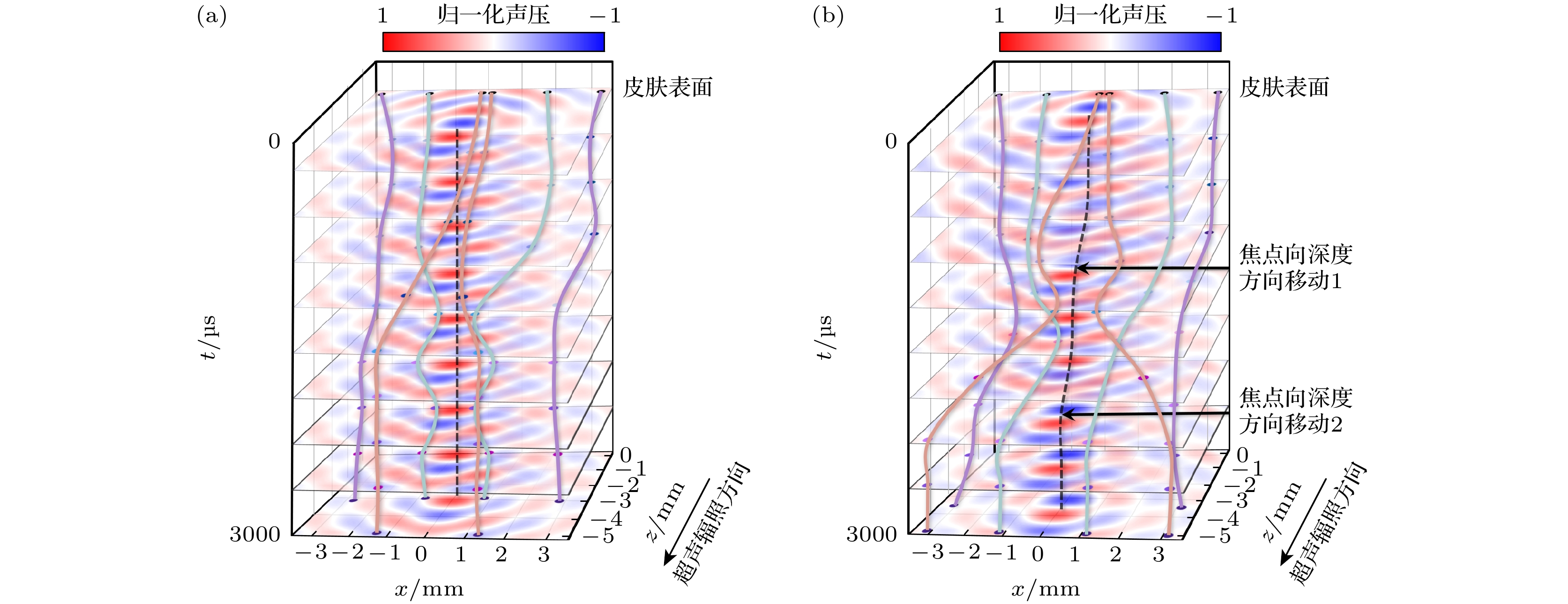 Ultrasound-assisted transdermal drug delivery (UTDD) is a promising non-invasive strategy to overcome the skin barrier. The traditional fixed-focus ultrasound approaches encounter the problems such as limited penetration depth, localized accumulation, and risk of thermal damage. To address these challenges, we propose a phased-array based dynamic focusing strategy, in which the acoustic focus is shifted sequentially along the depth direction. This approach aims to construct a continuous longitudinal acoustic radiation pathway that can sustain particle migration into deeper skin layers. In vivo experiments are conducted with FITC-labeled nanoparticles on rat dorsal skin under three conditions: natural permeation, fixed focus (~0.5 mm beneath the skin), and dynamic focusing (scanned from the surface to 1 mm). After 10-min ultrasound, fluorescence microscopy reveals that fixed focus enhances penetration compared with natural permeation, while dynamic focusing further improves delivery, increasing average depth by 65.7%, maximum depth by 41.2%, and fluorescence intensity by 69.3%. Dynamic focusing also produces a more uniform and continuous deposition band, which is unlike the localized accumulation seen with fixed focus. To elucidate the underlying mechanisms, a two-dimensional finite element model is established in COMSOL Multiphysics. The simulation results reveal that this “multi-focus relay” effect provides a continuous driving force pathway, enabling particles to follow the shifting focal positions. Trajectory analysis confirms that the number of particles reaching deeper layers (up to 5 mm) increases by nearly 14 times under dynamic focusing compared with that in the case of fixed focus, while the width of the lateral distribution extends by 46.1%. In conclusion, both experimental and simulation results demonstrate that phased-array dynamic focusing significantly enhances penetration depth, migration efficiency, and distribution uniformity of nanoparticles in UTDD. By constructing a continuous acoustic radiation pathway in the depth dimension, this approach improves delivery efficiency while mitigating local energy accumulation, providing a safer and more effective strategy for ultrasound-mediated transdermal therapy.