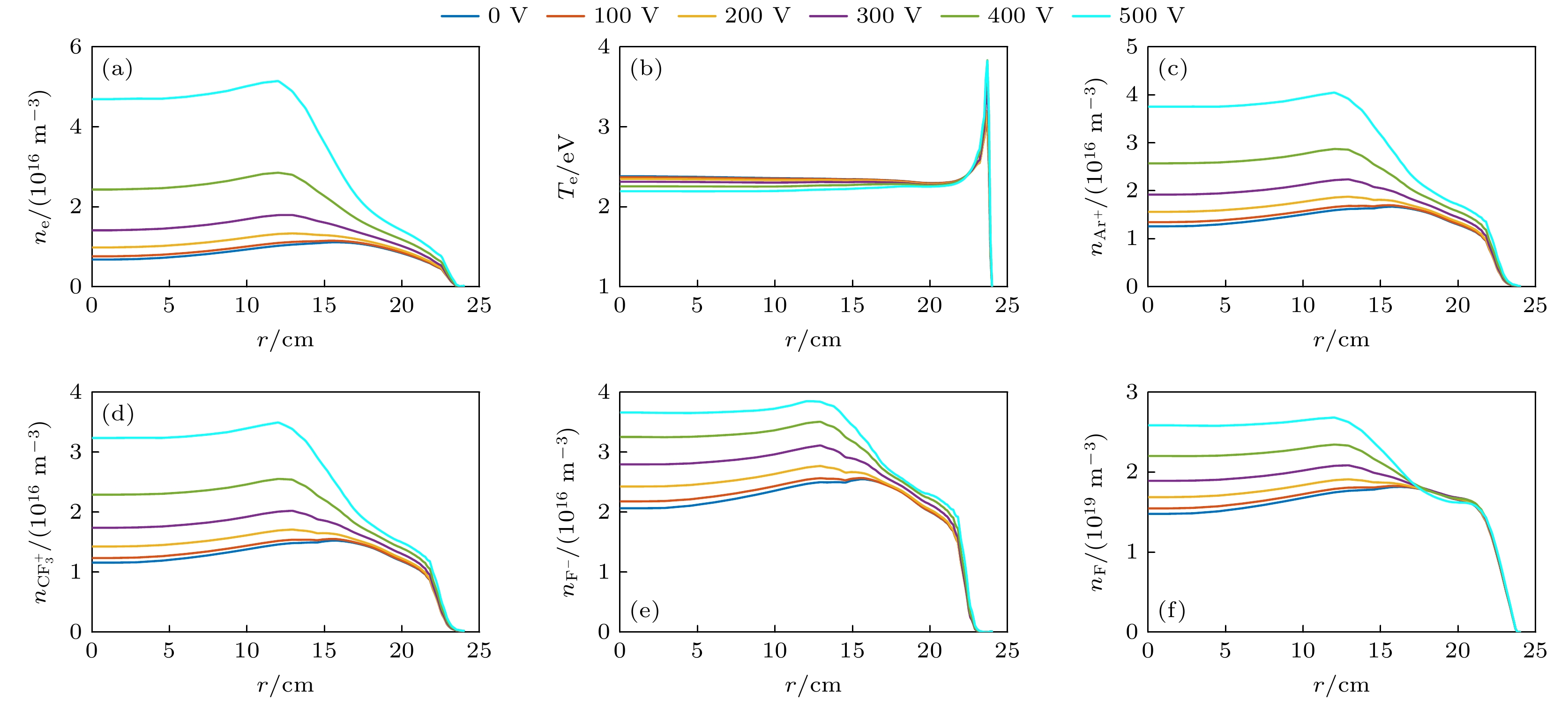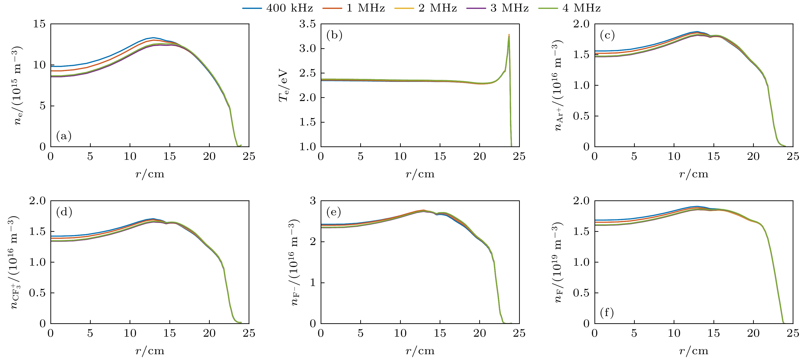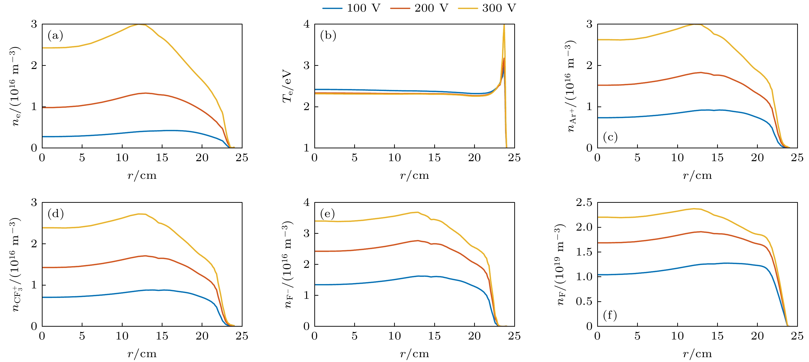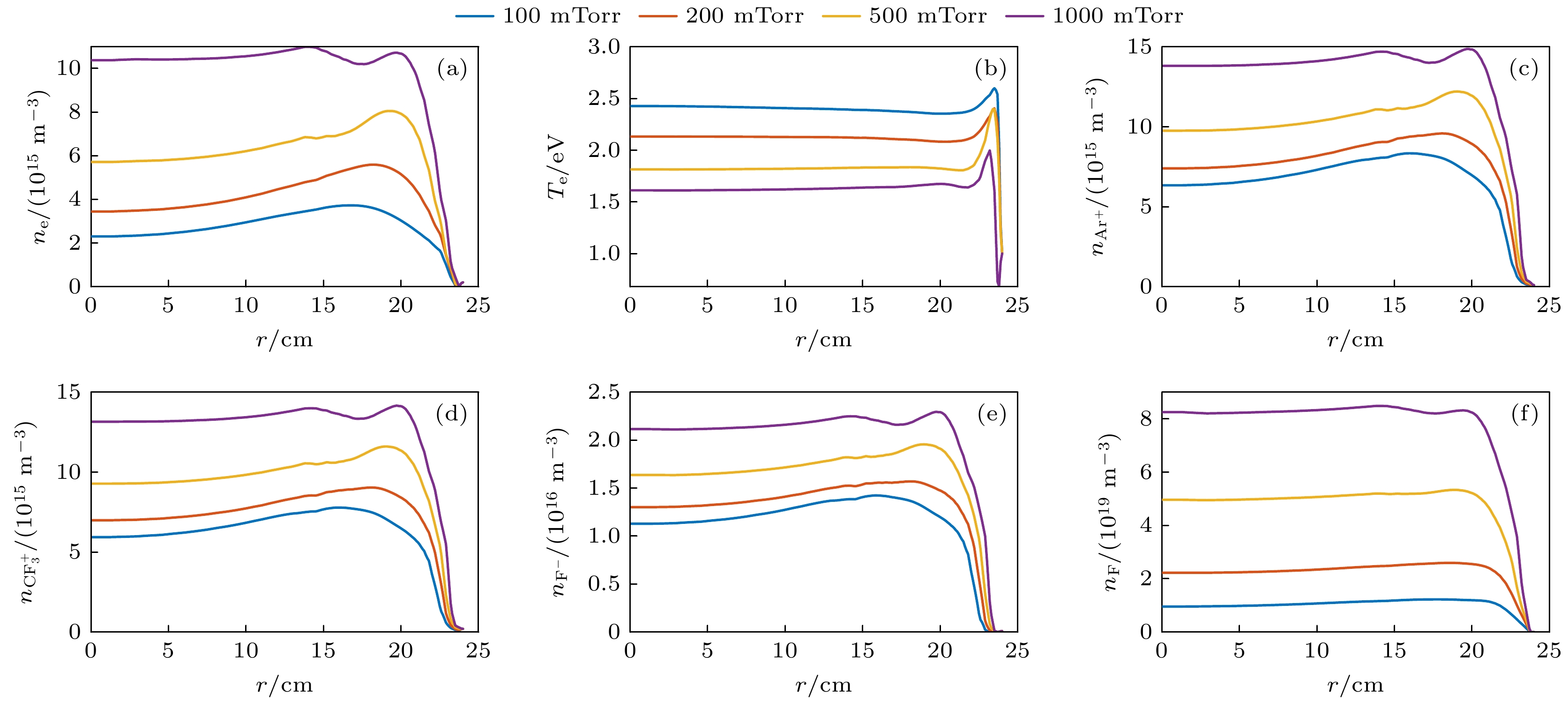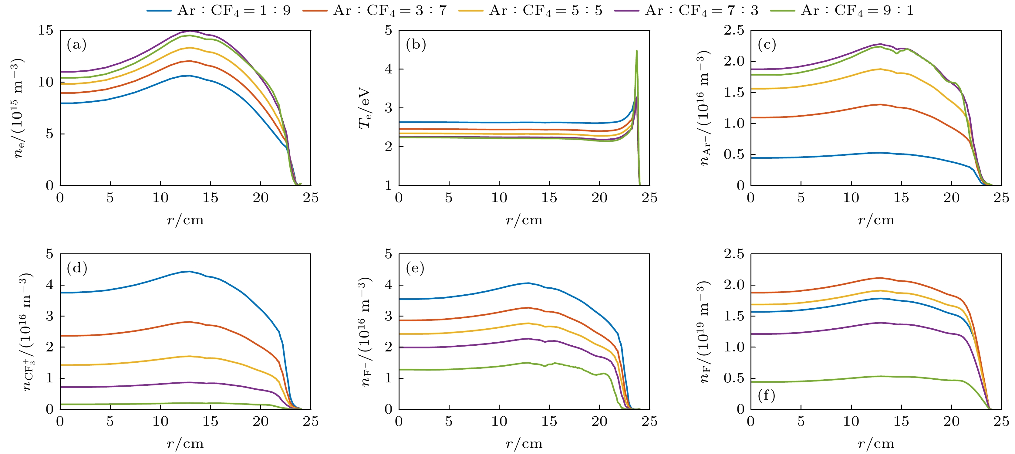 编号 反应表达式 文献 编号 反应表达式 文献 1 e + Ar → e + Ar [19] 39 e + CF4 → CF3 + F– [19] 2 Ar+ + Ar → Ar+ + Ar [19] 40 $\rm e + CF_4 \to CF_3^- + F $ [19] 3 $\rm CF_3^+ + Ar \to CF_3^+ + Ar $ [19] 41 F– + CF3 → e + CF4 [19] 4 $\rm CF_2^+ + Ar \to CF_2^+ + Ar $ [19] 42 F– + CF2 → e + CF3 [19] 5 CF+ + Ar → CF+ + Ar [19] 43 F– + CF → e + CF2 [19] 6 F+ + Ar → F+ + Ar [19] 44 F– + F → e + F2 [19] 7 F– + Ar → F– + Ar [19] 45 $\rm CF_3^- + CF_3^+ \to 2CF_3 $ [19] 8 $\rm CF_3^- + Ar \to CF_3^- + Ar $ [19] 46 $\rm F^- + CF_3^+ \to CF_3 + F $ [19] 9 Ar* + Ar → Ar* + Ar [19] 47 $\rm F^ + CF_3^+ \to CF_2 + F_2 $ [19] 10 CF3 + Ar → CF3 + Ar [19] 48 $\rm F^- + CF_2^+ \to CF_2 + F $ [19] 11 CF2 + Ar → CF2 + Ar [19] 49 $\rm F^- + CF_2^+ \to CF + F_2 $ [19] 12 CF + Ar → CF + Ar [19] 50 F– + CF+ → CF + F [19] 13 F2 + Ar → F2 + Ar [19] 51 F– + F+ → 2F [19] 14 F + Ar → F + Ar [19] 52 $\rm CF_3^- + CF_2^+ \to CF_3 + CF_2 $ [19] 15 e + CF4 → e + CF4 [19] 53 $\rm CF_3^- + CF^+ \to CF_3 + CF $ [19] 16 Ar+ + CF4 → Ar+ + CF4 [19] 54 $\rm CF_3^- + F^+ \to CF_3 + F $ [19] 17 $\rm CF_3^+ + CF_4 \to CF_3^+ + CF_4 $ [19] 55 $\rm CF_2^+ + CF_3 \to CF_3^+ + CF_2 $ [19] 18 $\rm CF_2^+ + CF_4 \to CF_2^+ + CF_4 $ [19] 56 $\rm CF^+ + CF_3 \to CF_3^+ + CF $ [19] 19 CF+ + CF4 → CF+ + CF4 [19] 57 $\rm CF^+ + CF_2 \to CF_2^+ + CF $ [19] 20 F+ + CF4 → F+ + CF4 [19] 58 F + CF3 → CF4 [19] 21 F– + CF4 → F– + CF4 [19] 59 F + CF2 → CF3 [19] 22 $\rm CF_3^- + CF_4 \to CF_3^- + CF_4 $ [19] 60 F + CF → CF2 [19] 23 Ar* + CF4 → Ar* + CF4 [19] 61 F2 + CF3 → CF4 + F [19] 24 CF3 + CF4 → CF3 + CF4 [19] 62 F2 + CF2 → CF3 + F [19] 25 CF2 + CF4 → CF2 + CF4 [19] 63 $\rm CF_3^- + F\to CF_3 + F^- $ [19] 26 CF + CF4 → CF + CF4 [19] 64 e + Ar → 2e + Ar+ [20] 27 F2 + CF4 → F2 + CF4 [19] 65 e + Ar → e + Ar* [20] 28 F + CF4 → F + CF4 [19] 66 e + Ar* → 2e + Ar+ [20] 29 Ar + Ar → Ar + Ar [19] 67 Ar* + Ar* → e + Ar + Ar+ [20] 30 CF4 + CF4 → CF4 + CF4 [19] 68 Ar* + CF2 → Ar + CF + F [21] 31 Ar + CF4 → Ar + CF4 [19] 69 Ar* + CF3 → Ar + CF2 + F [21] 32 e + CF4 → e + CF3 + F [19] 70 Ar* + CF4 → Ar + CF2 + F2 [21] 33 e + CF4 → e + CF2 + 2F [19] 71 Ar+ + CF2 → Ar + CF+ + F [21] 34 e + CF4 → e + CF + 3F [19] 72 $\rm Ar^+ + CF_3 \to Ar + CF_2^+ + F $ [21] 35 $\rm e + CF_4 \to 2e + CF_3^+ + F $ [19] 73 $\rm Ar^+ + CF_4 \to Ar + CF_3^+ + F $ [22] 36 $\rm e + CF_4 \to 2e + CF_2^+ + 2F $ [19] 74 $\rm Ar^+ + CF_3^- \to Ar + CF_3 $ [21] 37 e + CF4 → 2e + CF+ + 3F [19] 75 Ar+ + F– → Ar + F [21] 38 e + CF4 → 2e + CF3 + F+ [19] 76 $\rm CF_3^+ + Ar\to CF_3 + Ar^+ $ [21] -