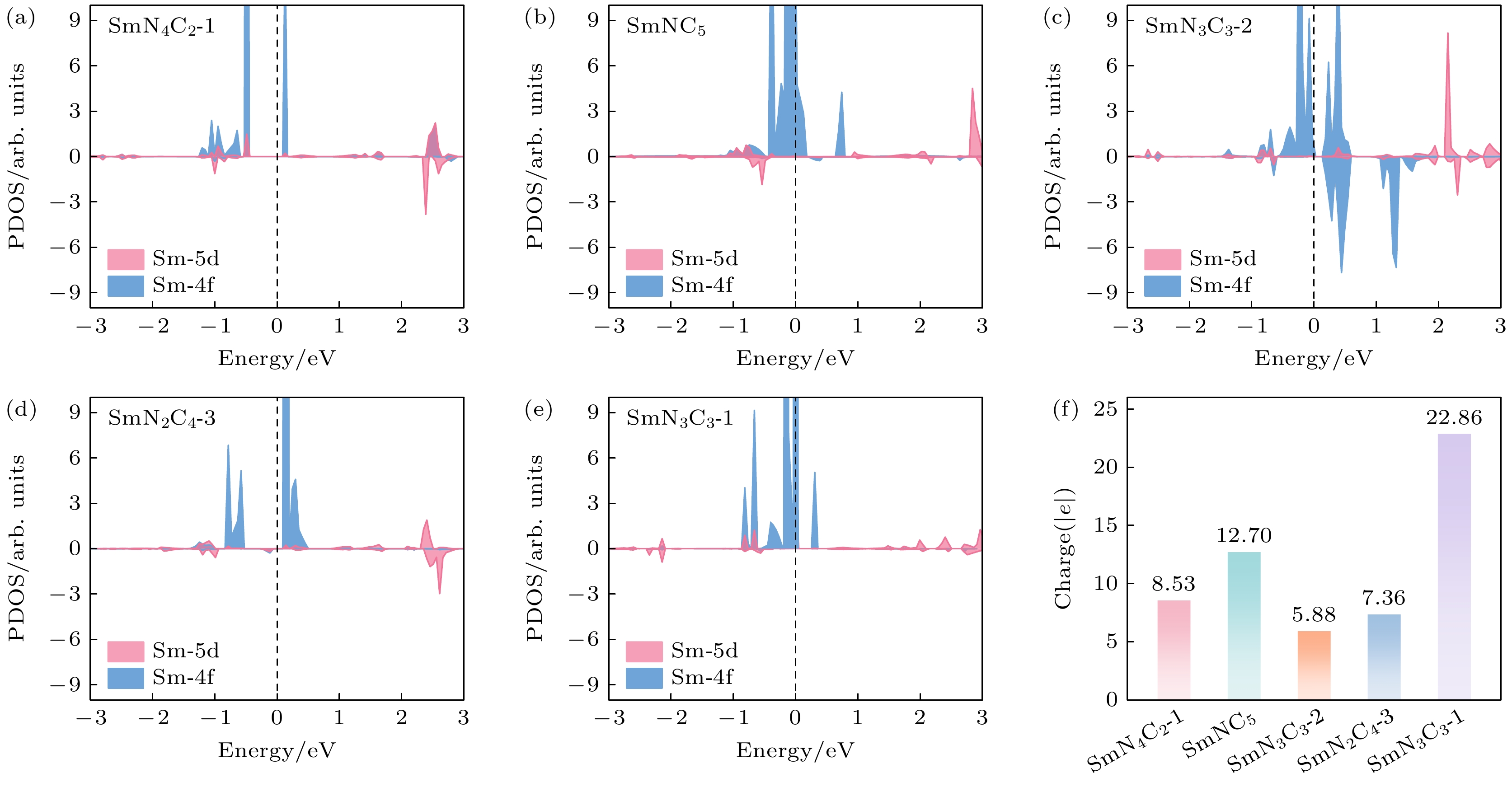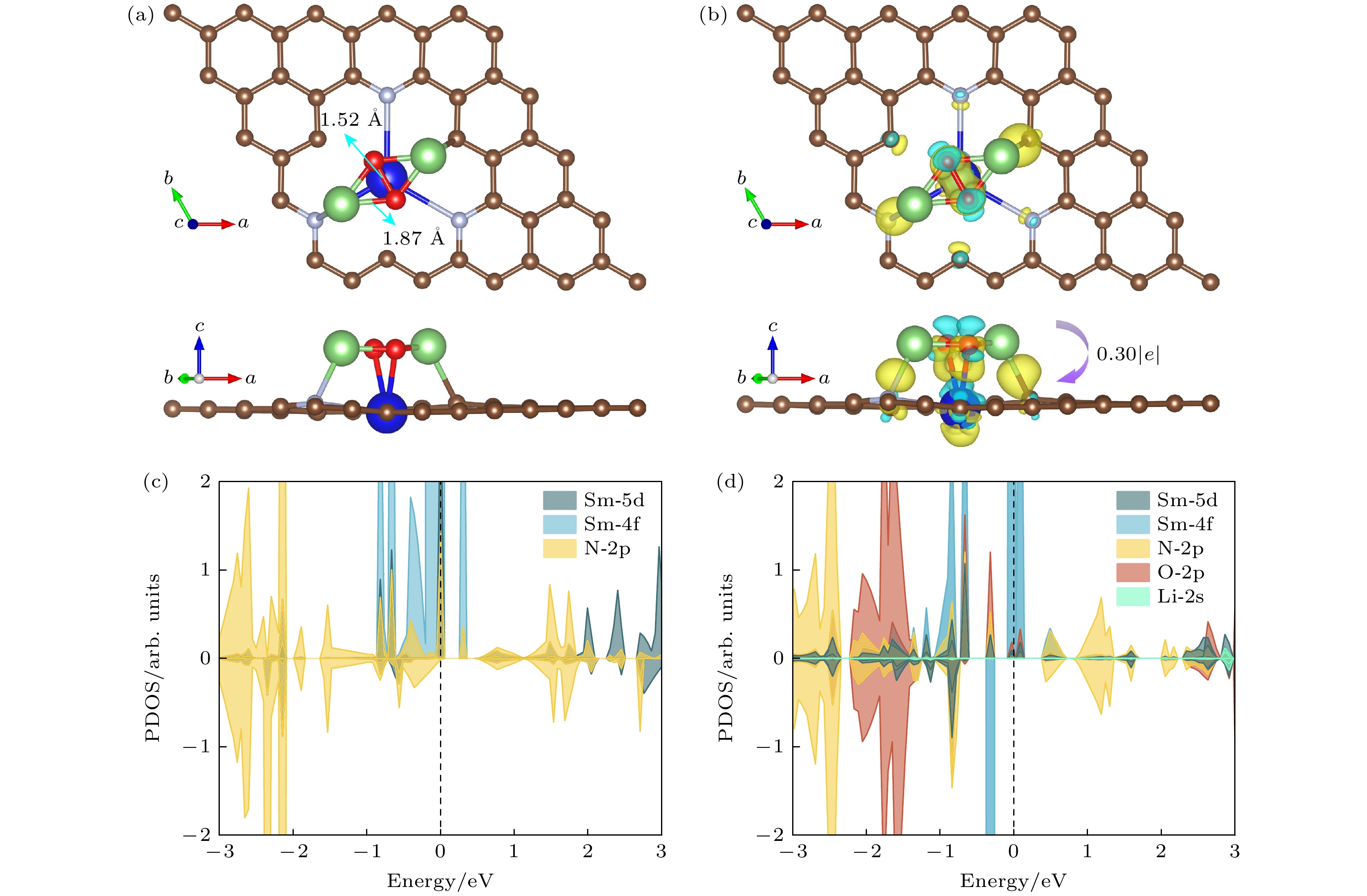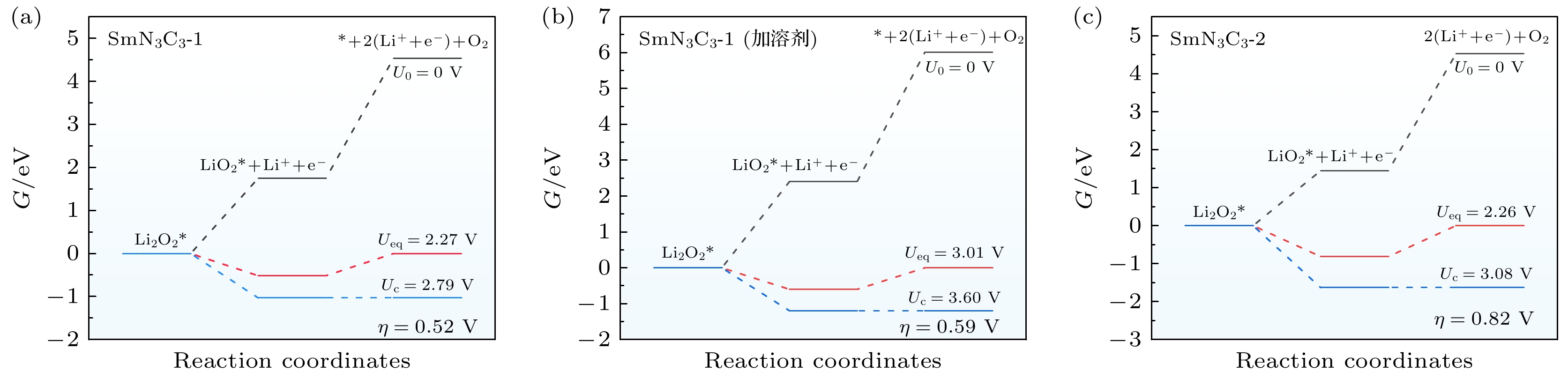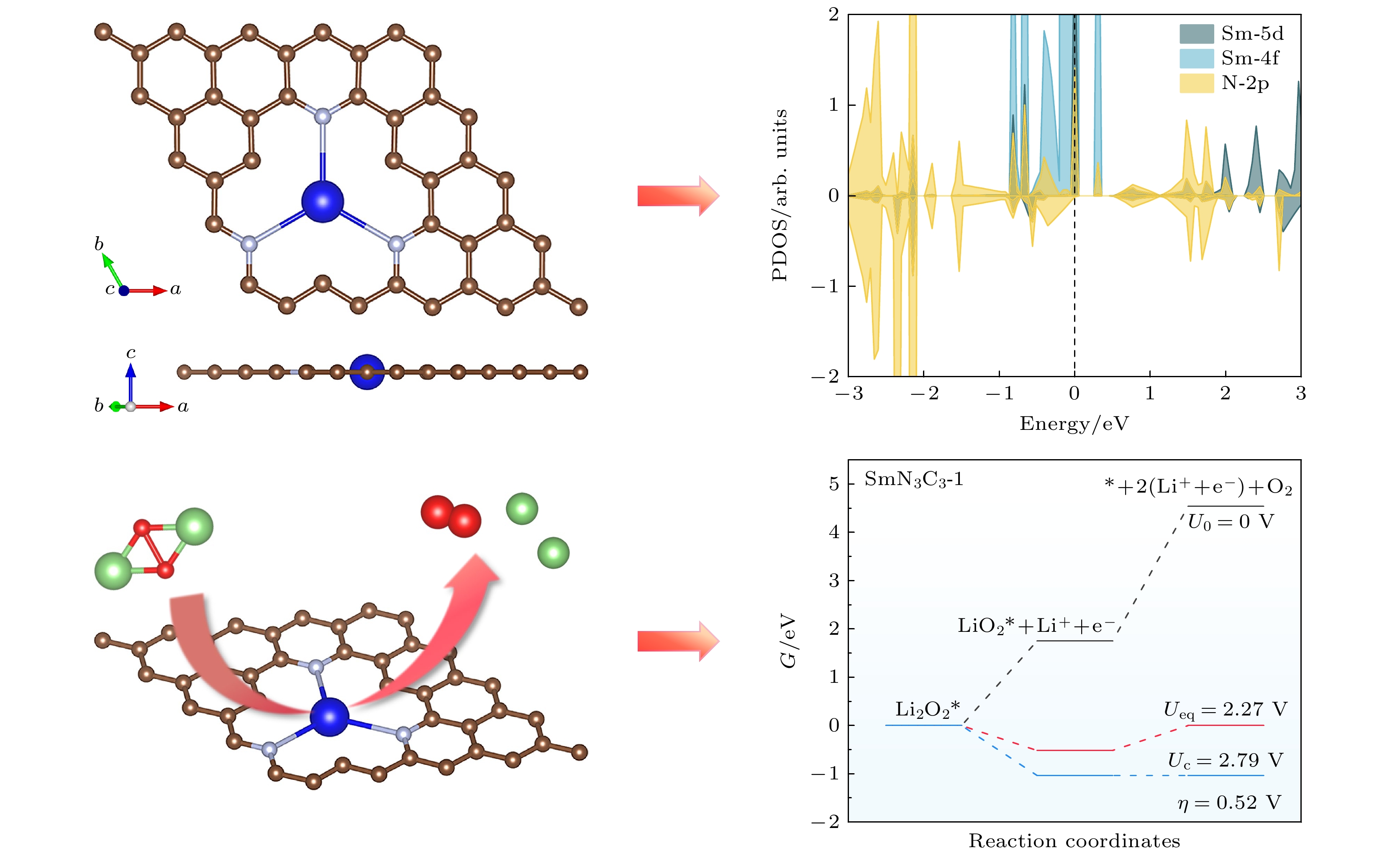 Lithium-oxygen batteries (LOBs) are renowned for their ultrahigh theoretical energy densities. However, their practical applications are significantly limited by sluggish oxidation kinetics and elevated charge overpotentials. Most single-atom catalysts (SACs) utilized in LOBs are predominantly based on transition metals, which feature unsaturated d-orbital coordination. In contrast, the rare-earth element samarium (Sm) possesses a rich array of 4f-orbital electrons. Recent studies have demonstrated that Sm SACs can effectively enhance the conversion of polysulfides in lithium-sulfur batteries (LSBs) and achieve remarkable cycling stability in full-cell experiments. Inspired by the work, we systematically design and optimize 17 configurations of Sm SACs for LOBs by using first-principles calculations, which are denoted as SmNxCy (x + y = 4 or 6). Through comprehensive screening for stability and catalytic activity, we identify the SmN3C3-1 catalyst as an optimal candidate for LOBs. The catalytic mechanism of the SmN3C3-1 SAC over the oxygen evolution reaction of the Li2O2 molecule is investigated. The Gibbs free energy of the two-electron dissociation process indicates that the second step of the reaction is the rate-determining step (RDS). At the equilibrium potential, the charge overpotential is 0.52 V. Furthermore, mechanistic analysis reveals that the d-f-p orbital hybridization in SmN3C3-1 effectivelyreduces the shielding effect on the Sm 4f orbitals, facilitates interfacial charge transfer, and significantly improves the catalytic performance of the Li2O2 oxidation. This study provides novel insights into the potential of rare-earth-based SACs for improving the performance of LOBs.